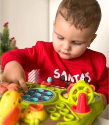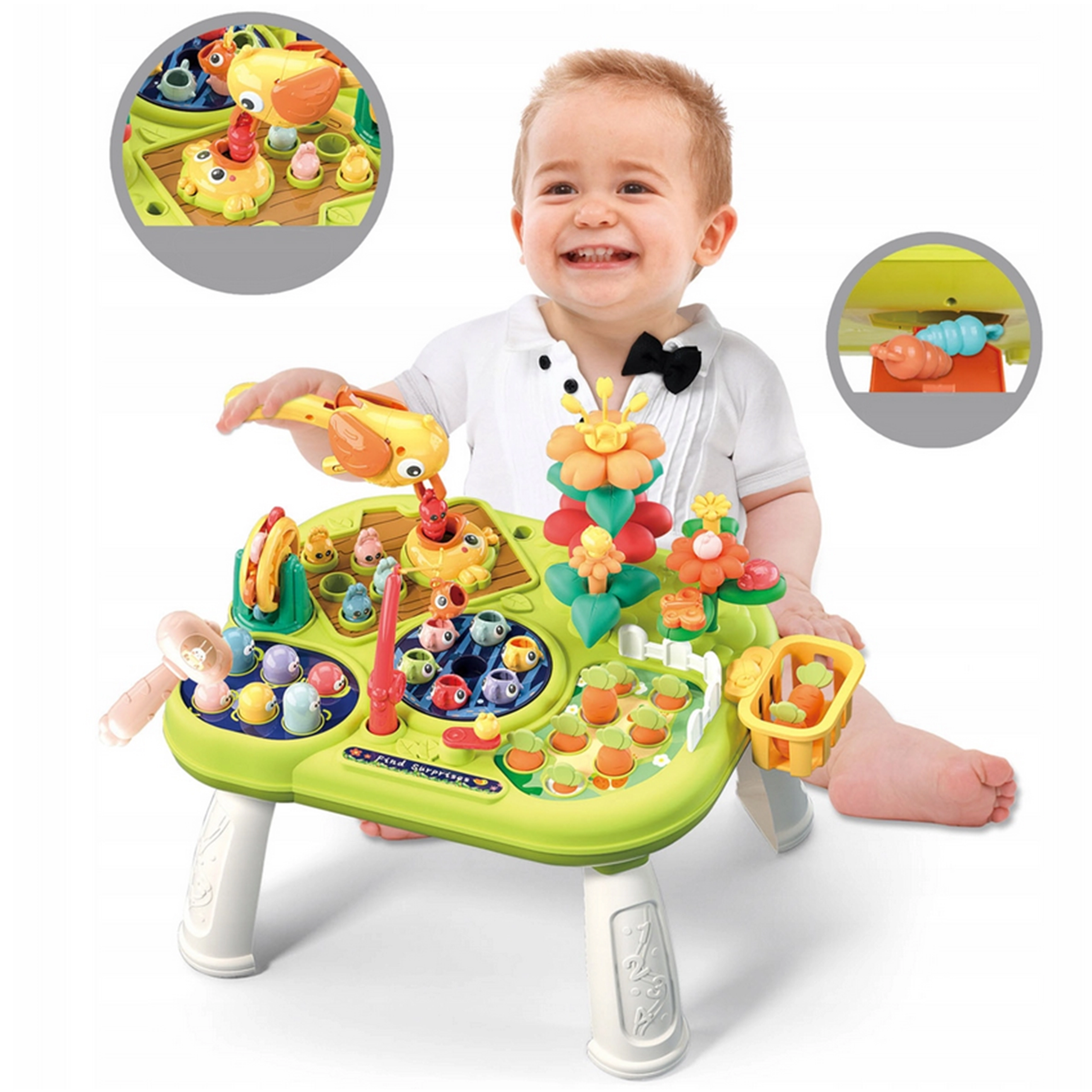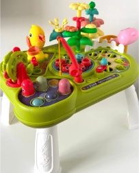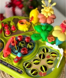 Какво очаква децата? Ловене на рибки с въдица, изчукване на червейчета с чукче, сортиране и подреждане на цветя, беритба на морковчета, хранене на пиленце, въртяща се мелница, практична кошничка за елементи и скривалище за червейчета. Всяка активност развива различно умение и задържа вниманието без излишни разсейвания.