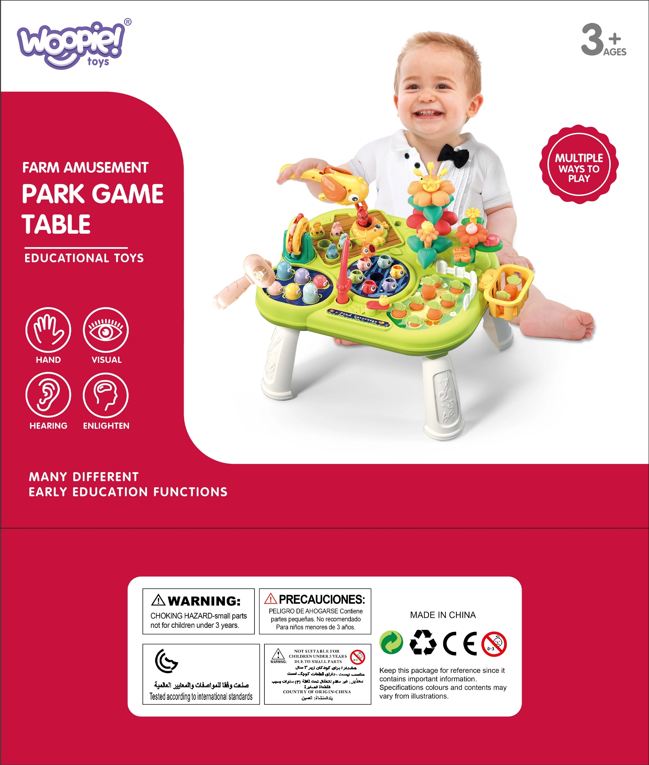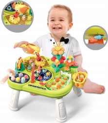 Интерактивната мулти масичка WOOPIE носи на децата забавление и развитие в едно. Благодарение на 8 активности в 1 предлага дълги часове откривателство: ловене на рибки, изчукване на червейчета с чукче, градинарство с цветя и морковчета или игра с птичето при издърпване на червейче. Подпомага фината моторика, търпението, концентрацията и координацията око–ръка.
