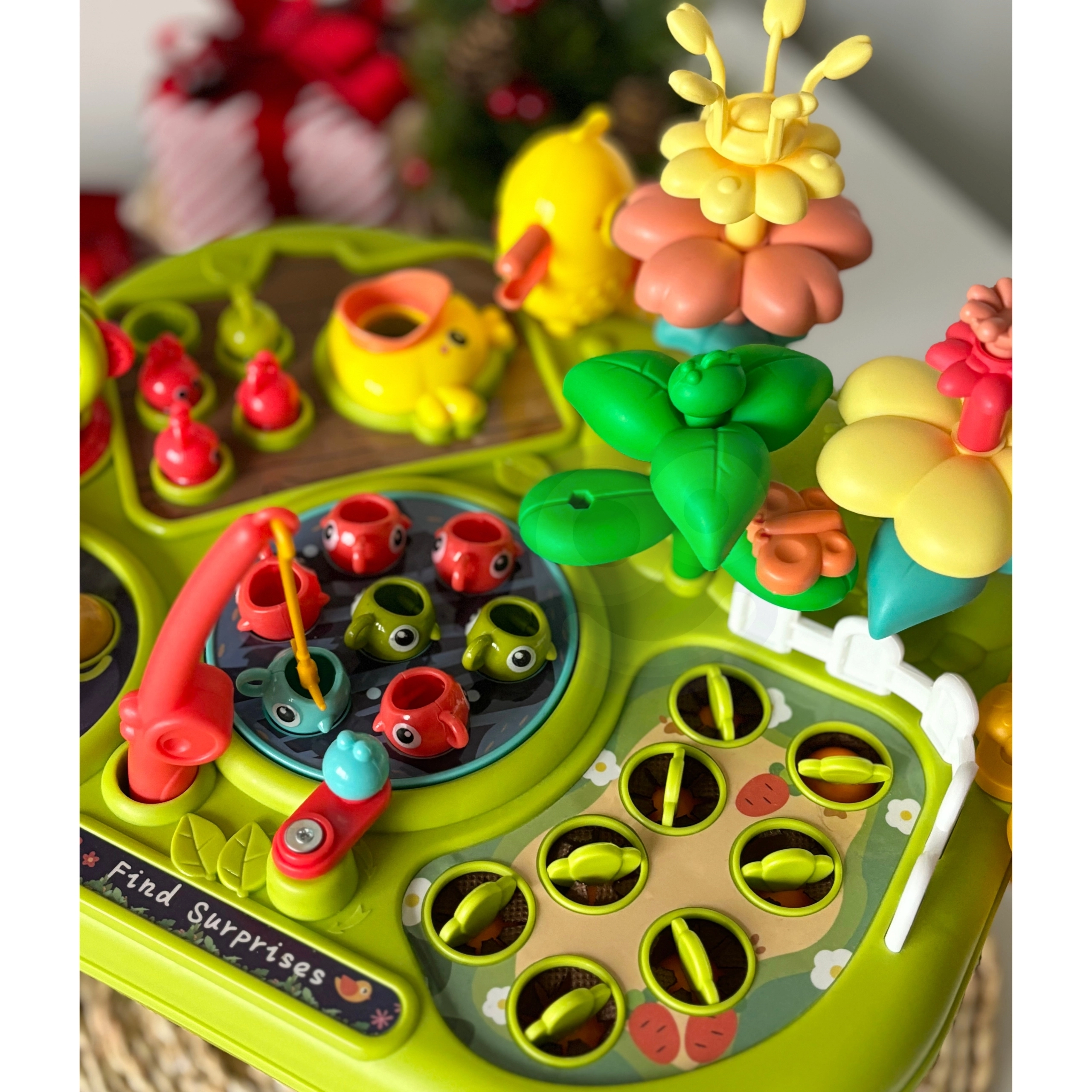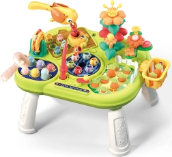 - 8 в 1 (ловене на рибки, изчукване на червейчета, подреждане на цветя, изваждане на морковчета, хранене на пиленце, въртяща се мелница, кошничка за елементи, скривалище за червейчета)