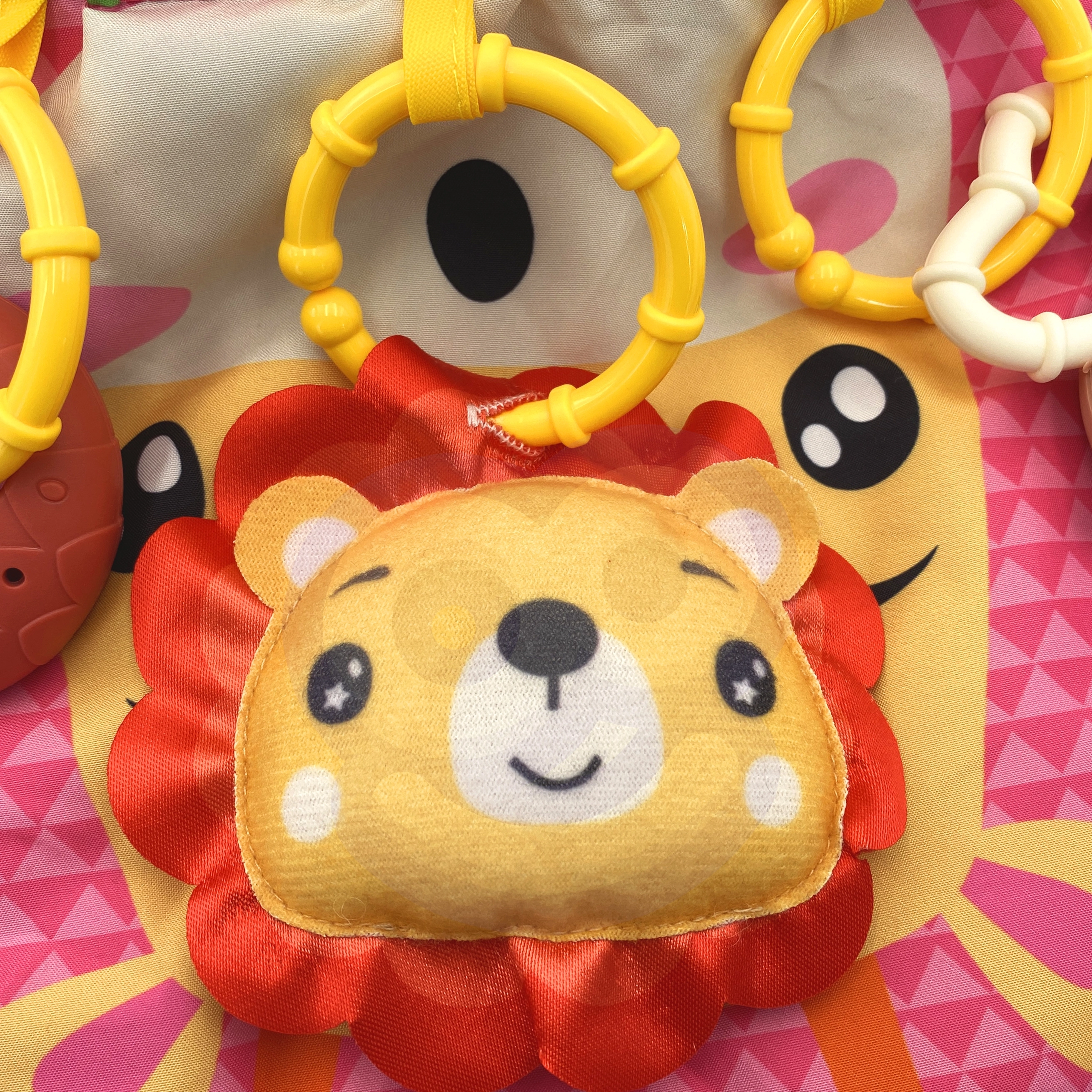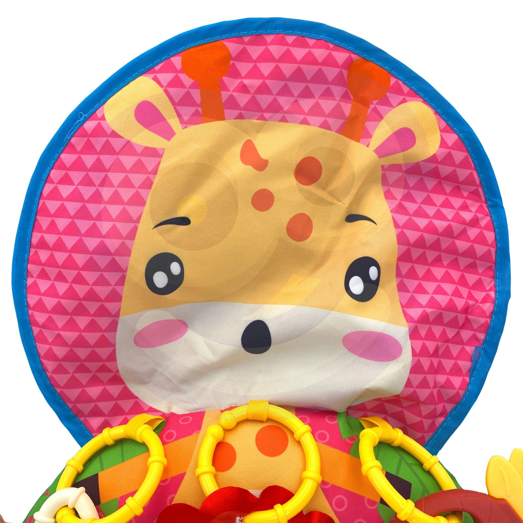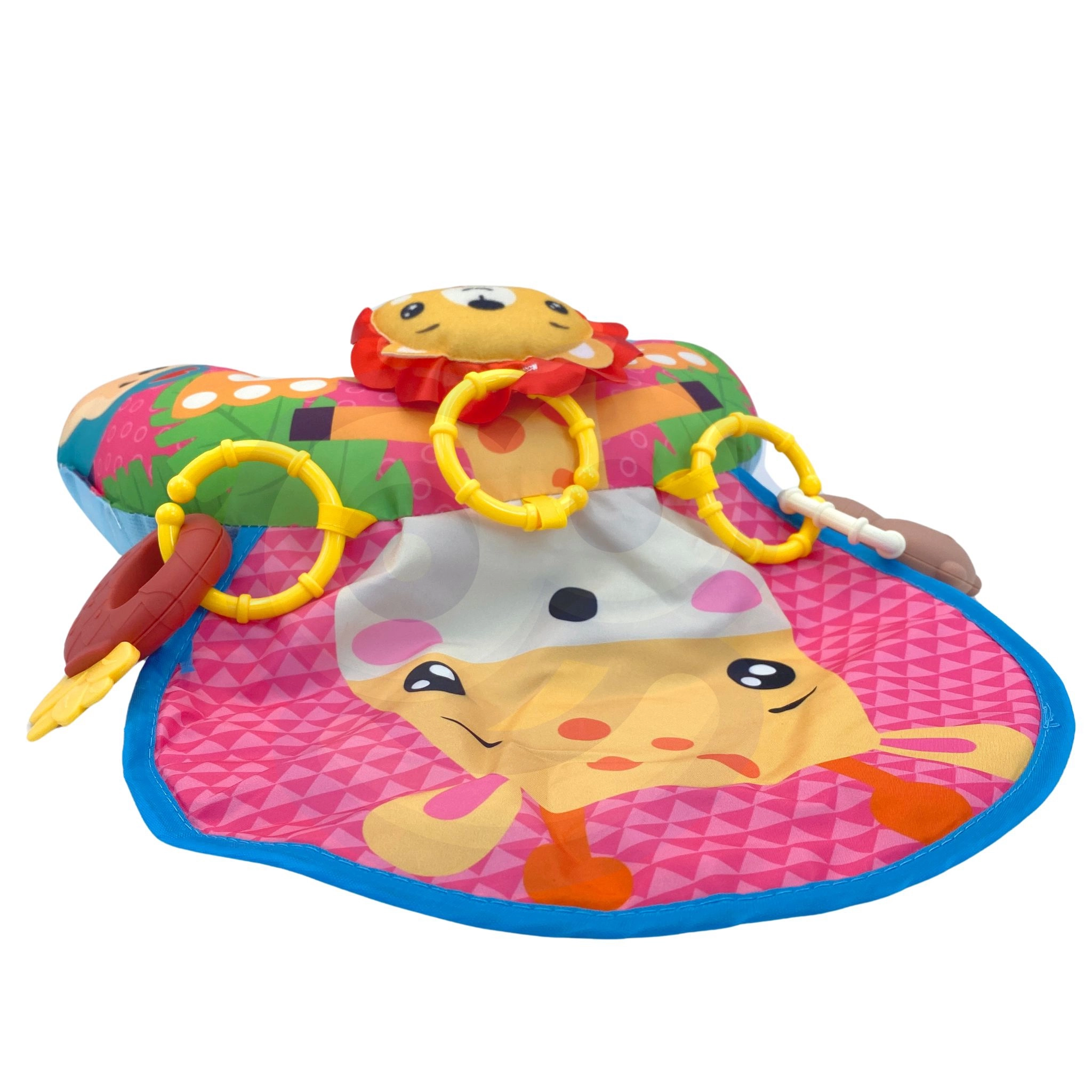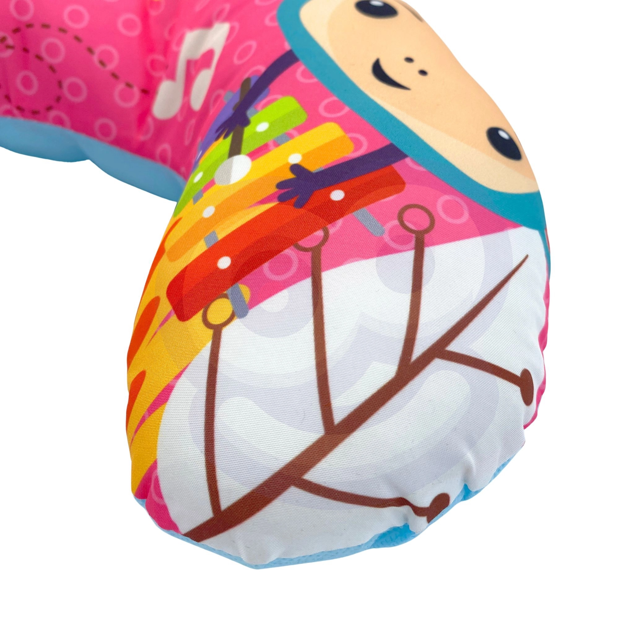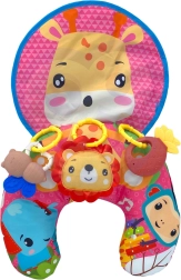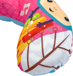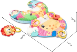 Шумкащите зони, контрастните цветове и текстури насърчават вниманието и концентрацията. Сваляемите дрънкалки и меката гризалка облекчават при никнене на зъбки и едновременно развиват захвата и фината моторика. Качествената изработка и безопасните материали правят възглавницата чудесен подарък за новородени.
