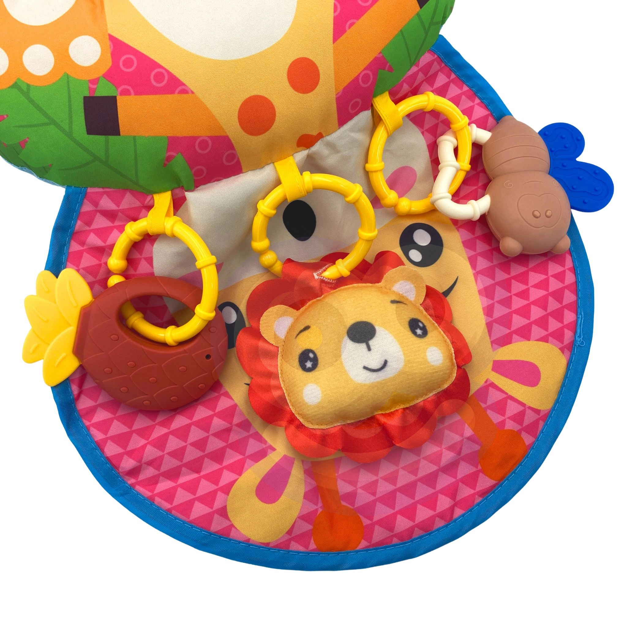 Интерактивната възглавница WOOPIE BABY с очарователен принт на жираф расте заедно с вашето дете. Осигурява мека и стабилна опора при игра по корем, помага за трениране на горната част на тялото и координацията, а когато детето порасне, го подпомага при първите опити за сядане. Благодарение на сваляемите играчки бебето се наслаждава на сетивно откривателство у дома и по време на път.