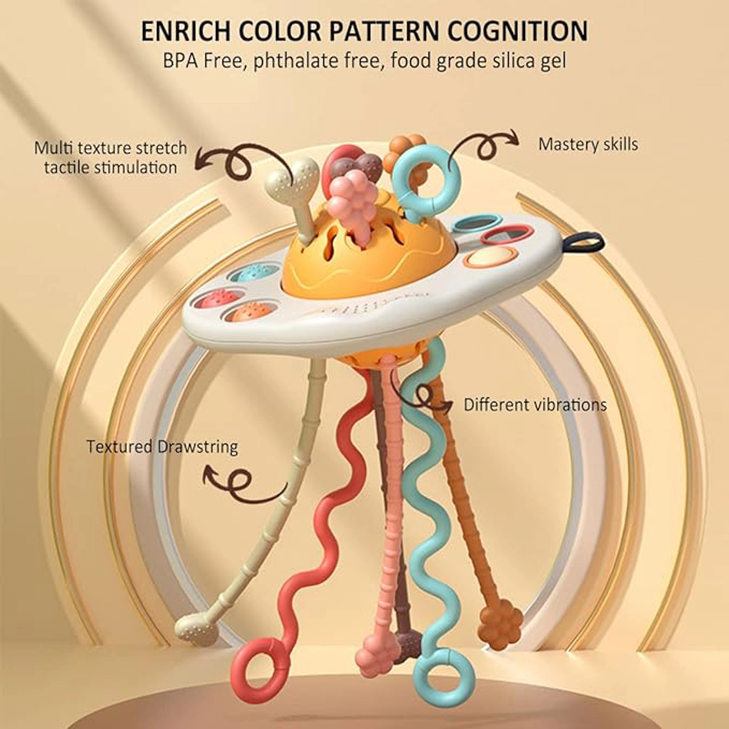 Открийте многофункционална сензорна играчка във форма на UFO, която комбинира гризалка, дрънкалка и интерактивни „издърпващи“ връзки. Подпомага развитието на моториката и координацията, стимулира зрението, слуха и допира, а същевременно облекчава при пробиване на зъбки. Безопасните материали без BPA и лесната поддръжка я правят идеален избор за бебета от 6 месеца.