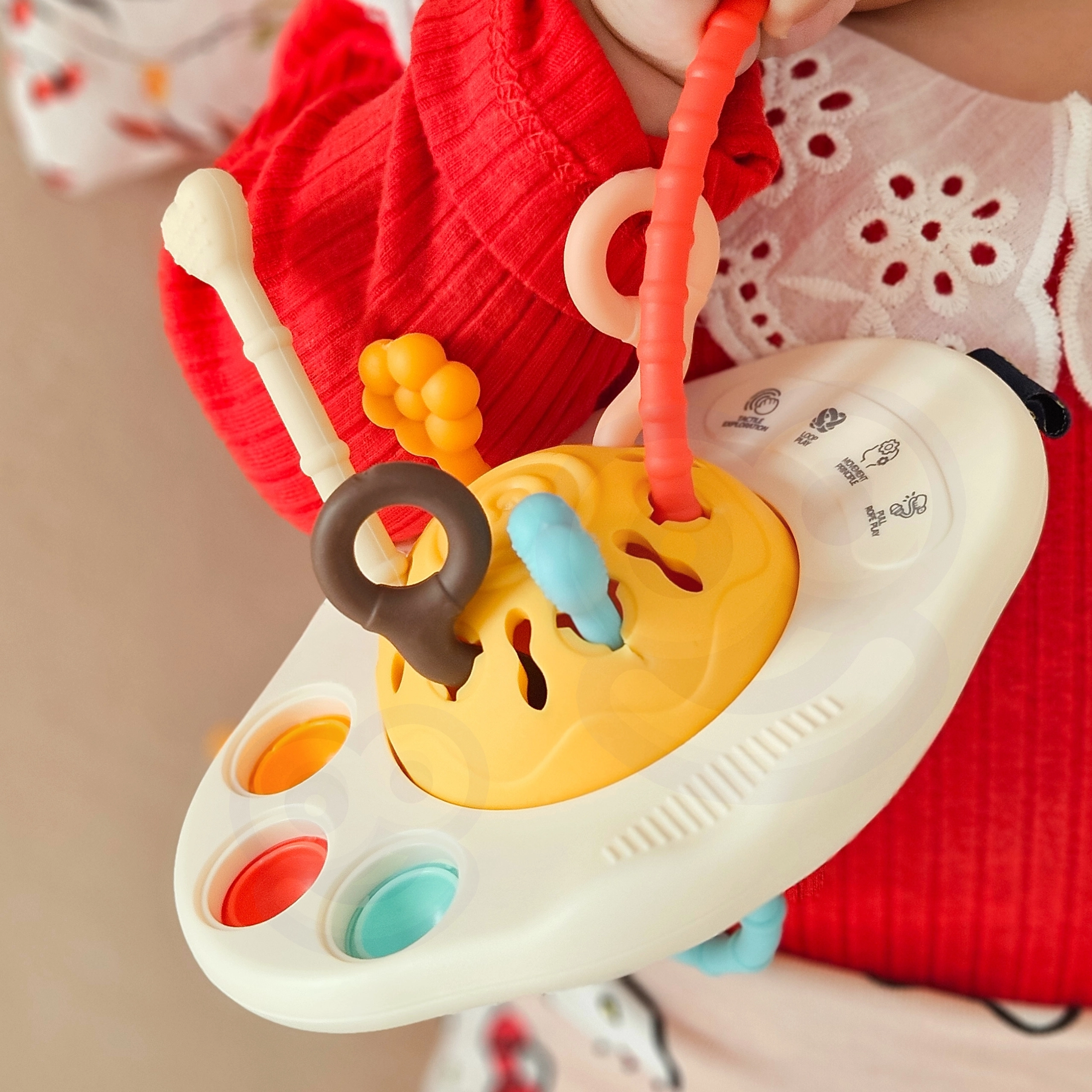 Тази бебешка Монтесори играчка WOOPIE BABY във форма на UFO предлага разнообразни сензорни стимули благодарение на шест връзки с различни текстури и цветове, три меки бутона и един по-твърд плъзгащ бутон. Дърпането на връзките предизвиква различни звуци и леки вибрации, които насърчават любопитството и концентрацията. Меките ръбове и структурираните повърхности осигуряват облекчение на чувствителните венци при никнене на зъбки.