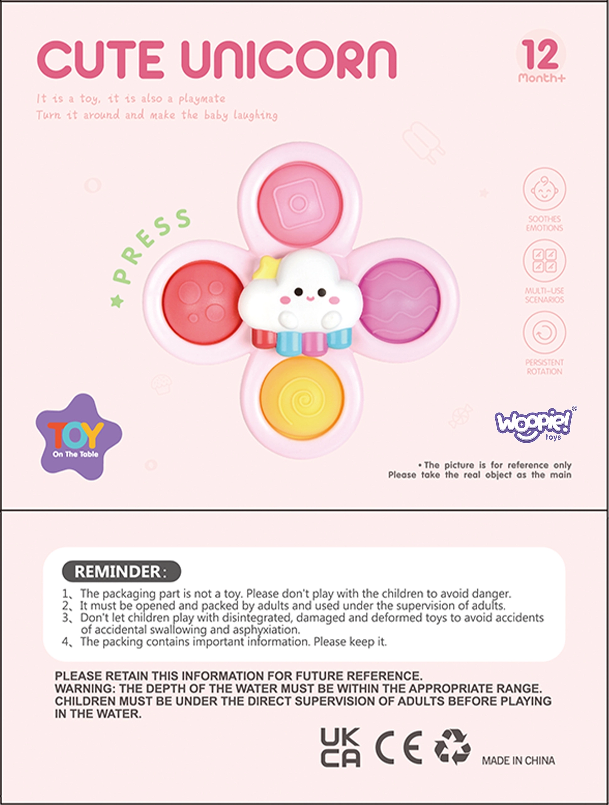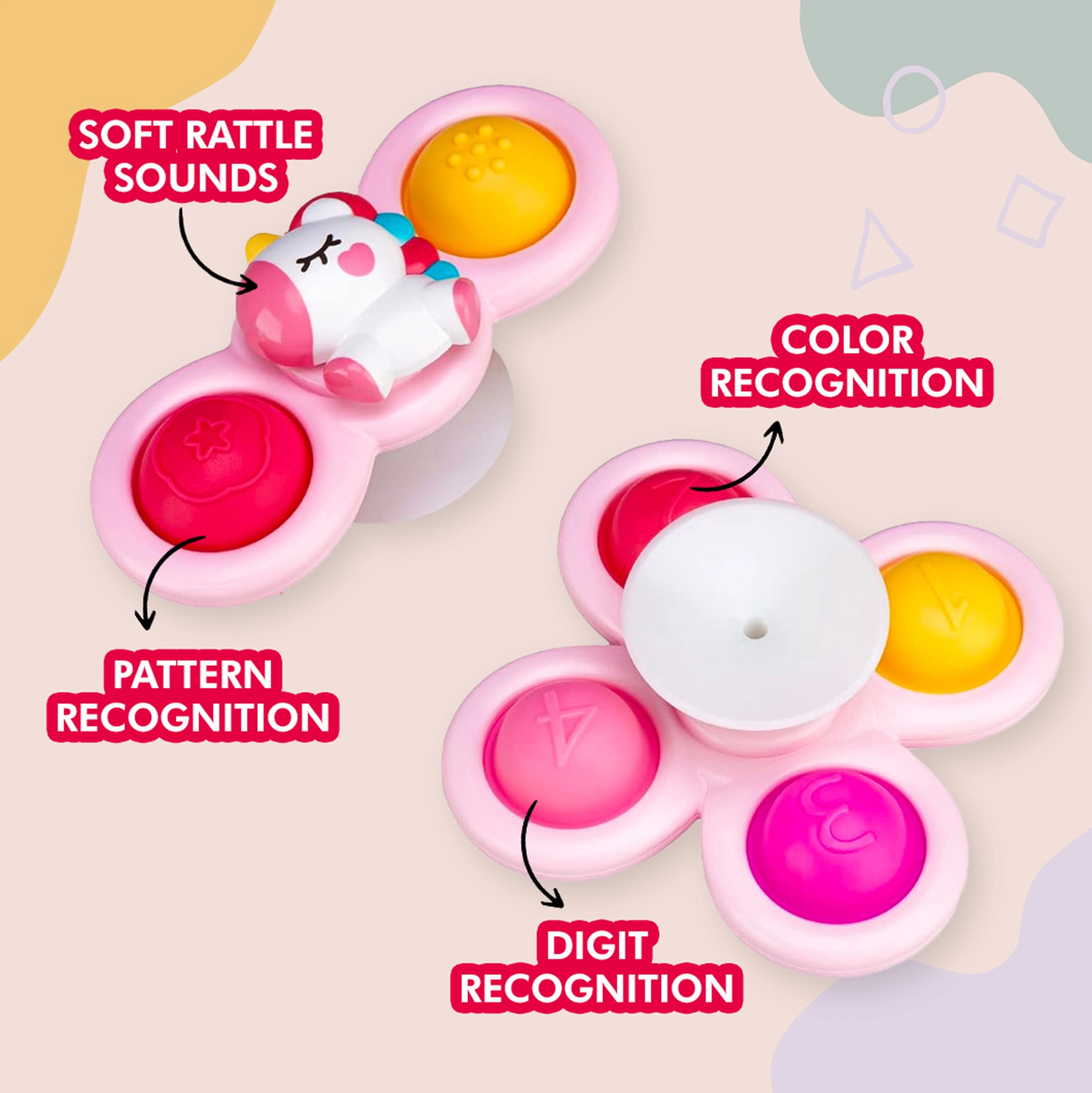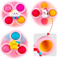 С този комплект от три спинъра на WOOPIE вашето дете ще бъде очаровано. В комплекта има спинъри във форма на еднорог, звезда и облаче. Спинърите могат да се закрепват върху различни повърхности, като прозорци или ваната по време на къпане, играчката е водоустойчива. Лагерите осигуряват дълготрайно въртене, а сменяемите части позволяват безкрайна креативност при комбинирането им. Има гумени елементи с различна текстура, които развиват сетивата и помагат за намаляване на стреса.