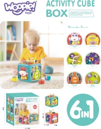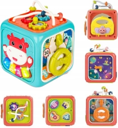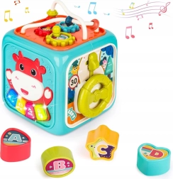 Освен музикалните функции, кубчето включва вгнездяване с 4 форми и букви, въртящ се часовник, зъбни колелца, волан с количка и лабиринт с топчета. Здравата пластмаса, заоблените ръбове и нетоксичните бои осигуряват безопасна игра от най-ранните месеци. Захранване с 3× AA (не са включени).