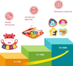 Интерактивното сензорно кубче WOOPIE носи пъстро забавление и обучение в едно. Детето открива различни текстури, форми и звуци, учи се да разпознава цветове и тренира хващане, натискане и въртене. Музикалният панел с клавиши DO, RE, MI, FA предлага пет режима, светлинни ефекти и десетки мелодии, които стимулират развитието на слуха и ритъма.