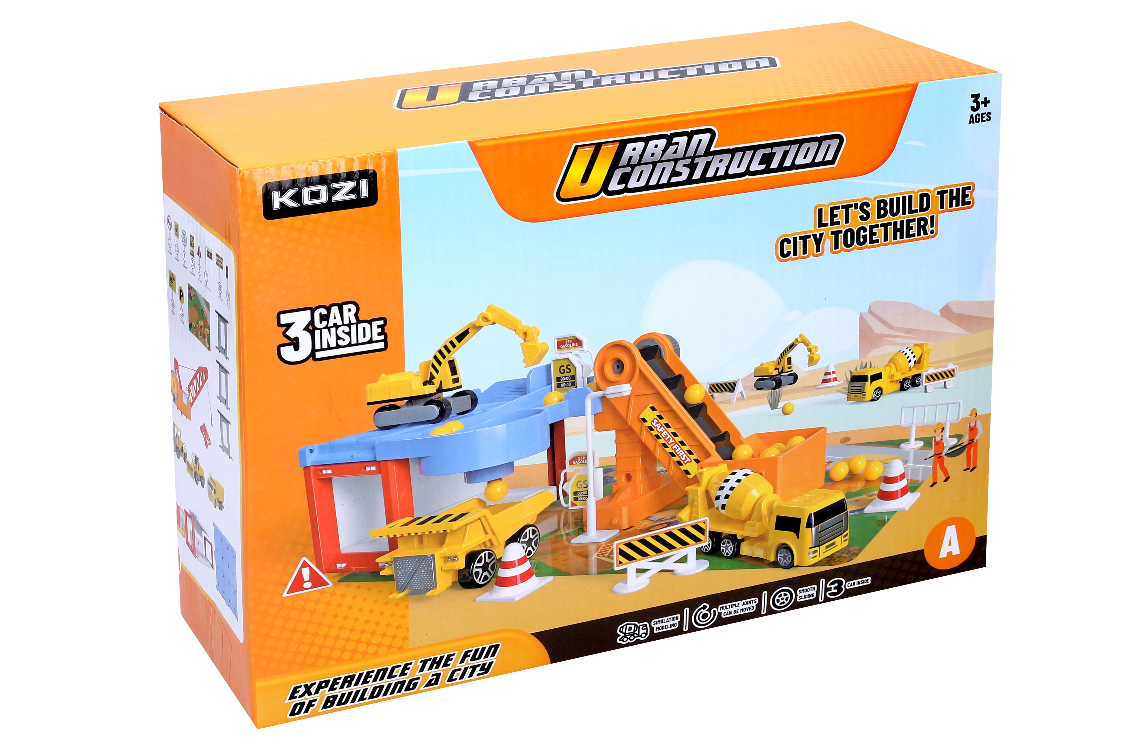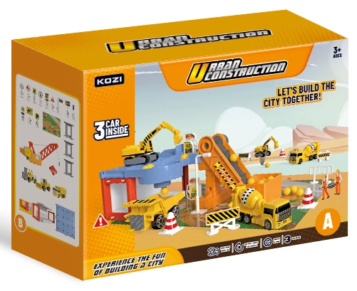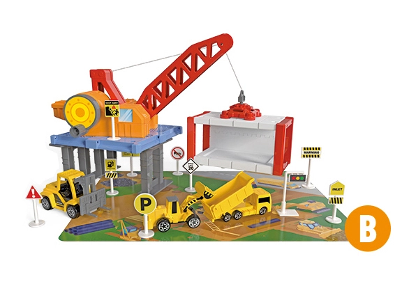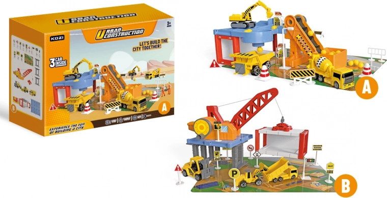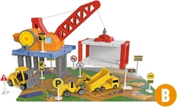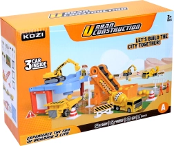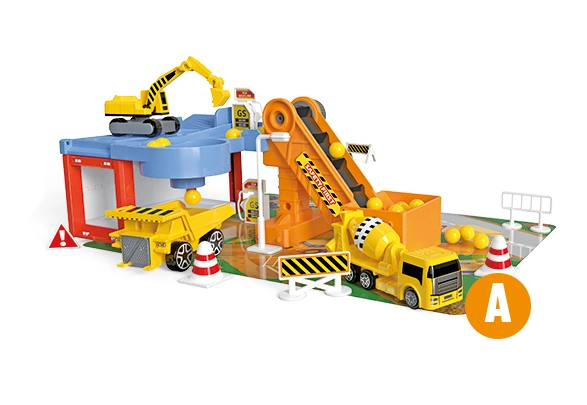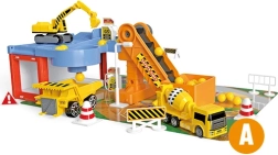 Този удивителен Гараж за строителни коли съдържа различни строителни машини, включително самосвал, багер и бетоновоз. Благодарение на това децата могат да развиват своята креативност и въображение при създаване на различни строителни проекти. Част от комплекта са също транспортна лента и пътни знаци, които придават на играта реалистично усещане.