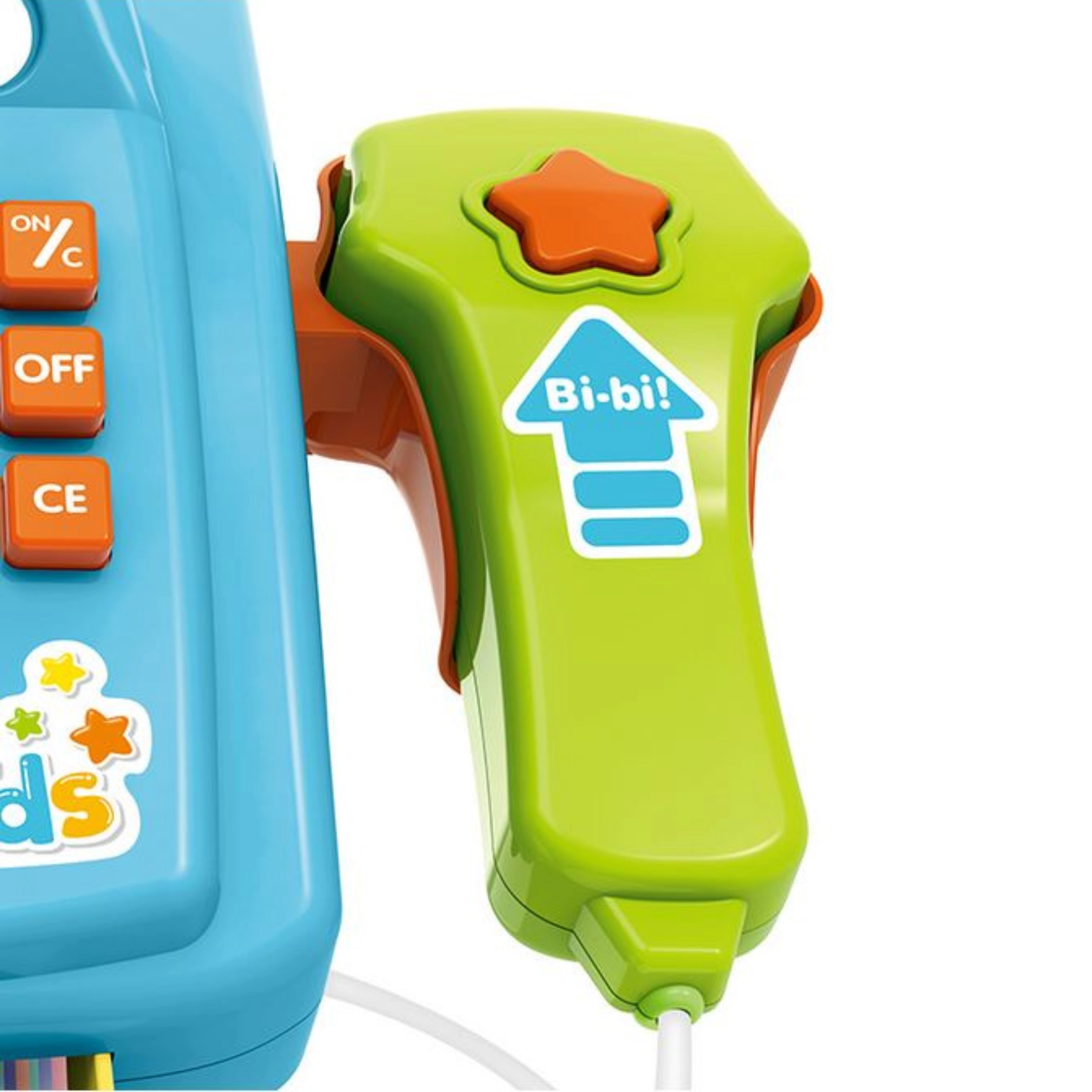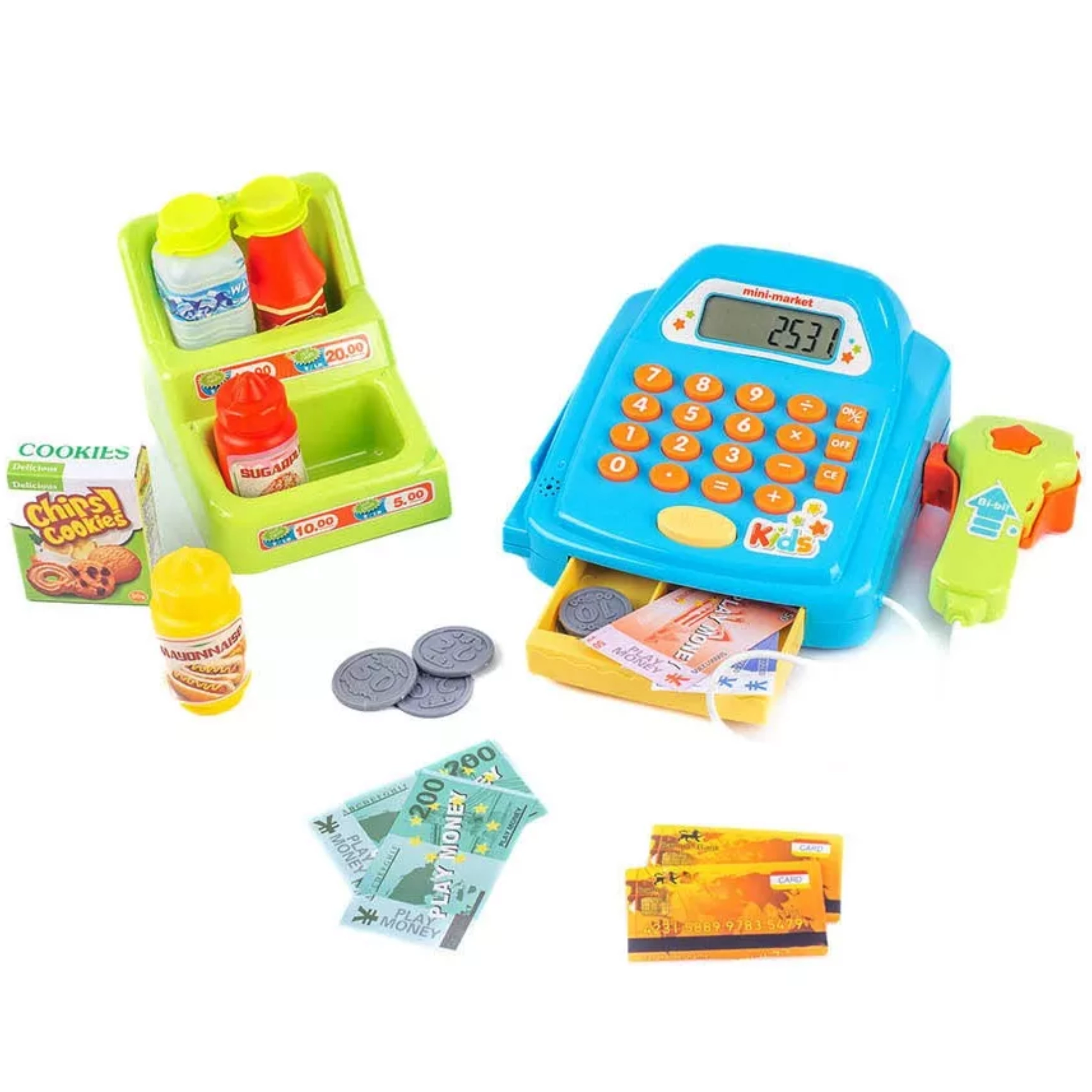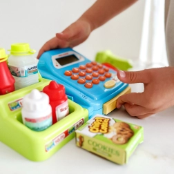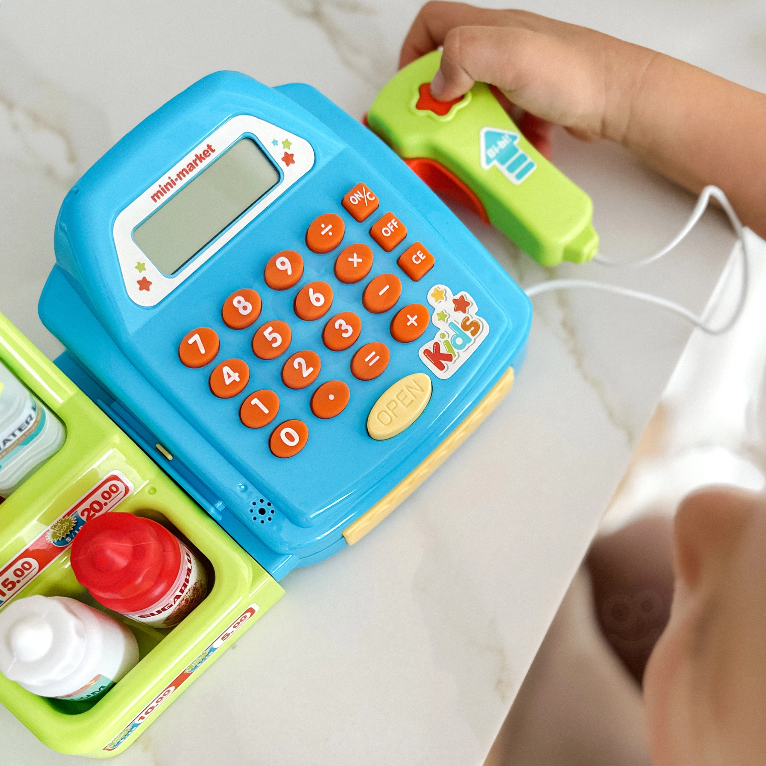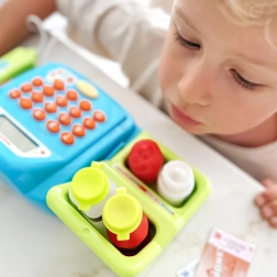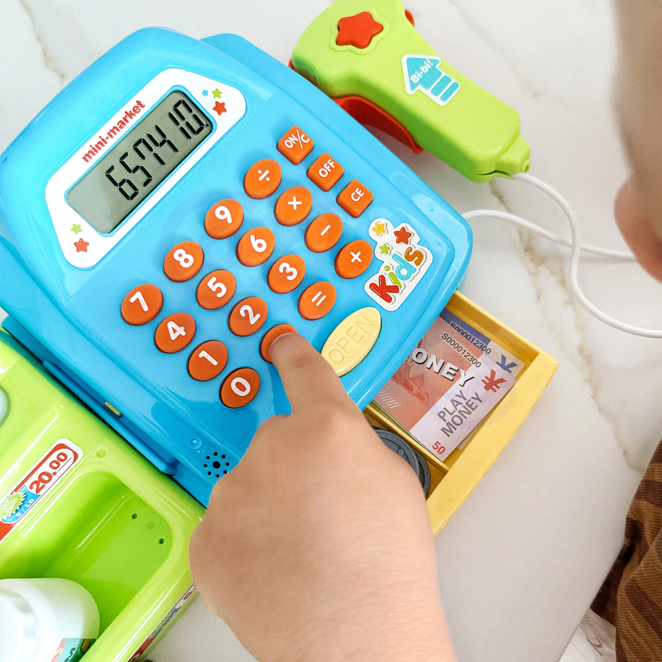 Вграденият калкулатор помага да се пресмятат покупките, а чекмеджето съхранява сигурно монети и банкноти – учене на броене на пари чрез игра.