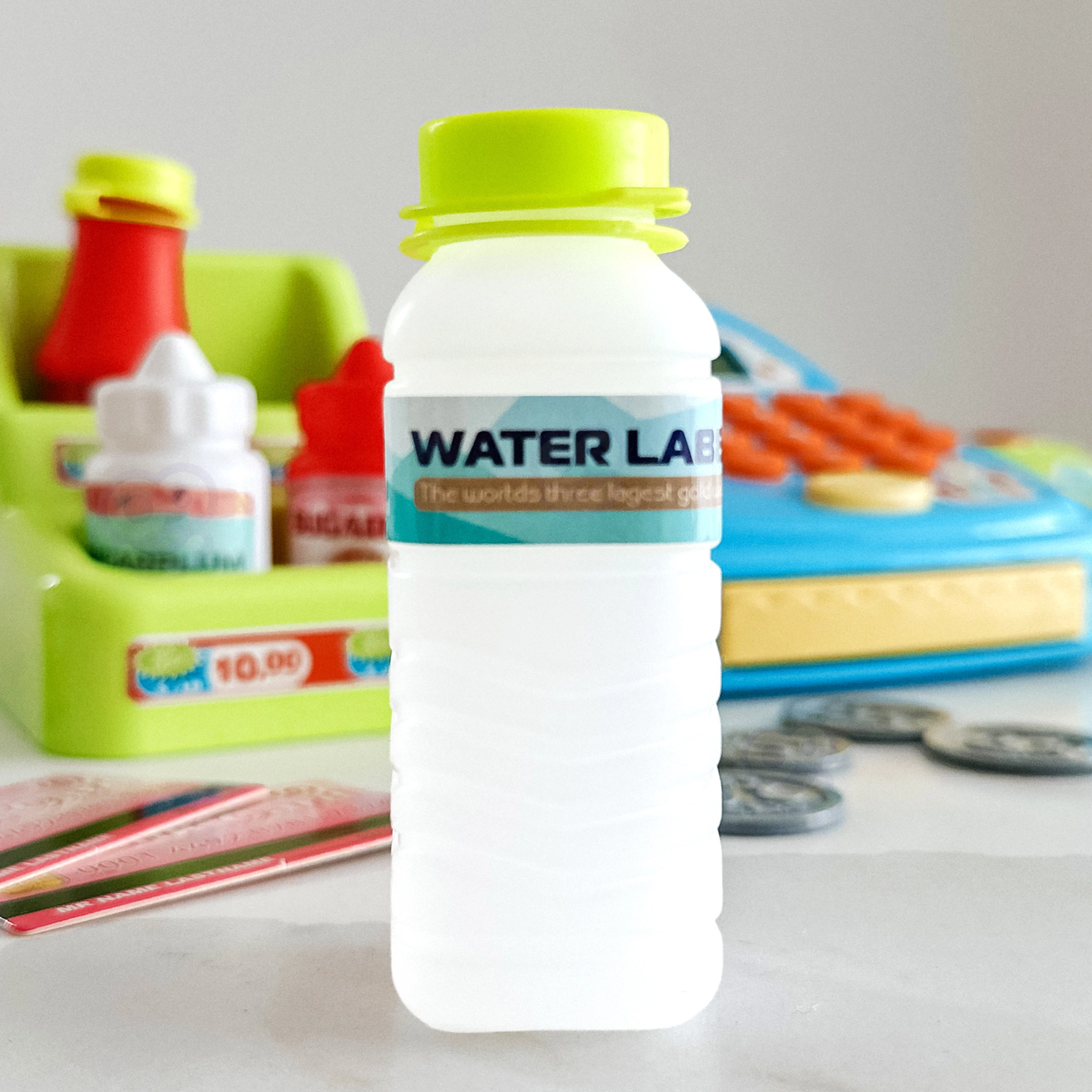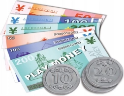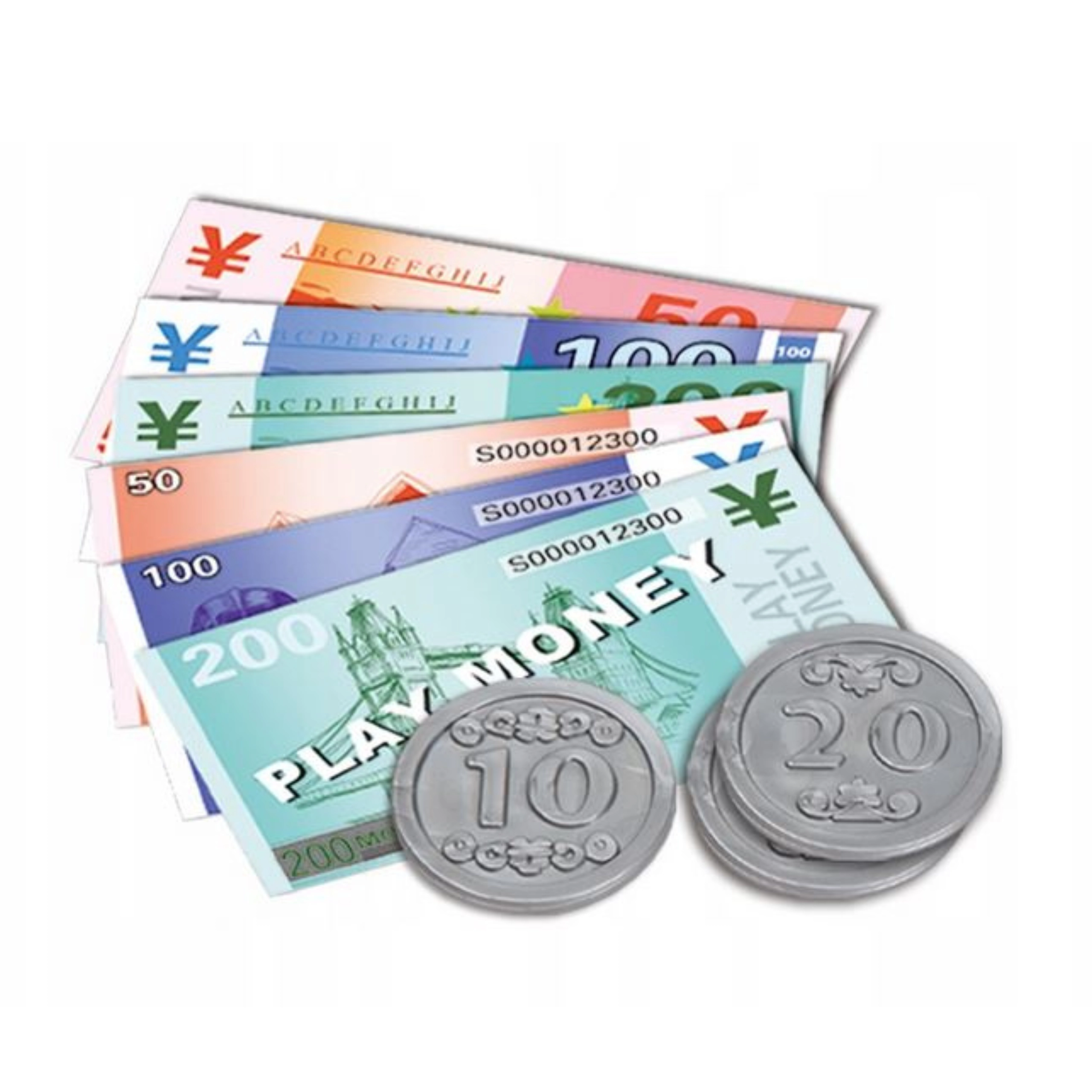Комплектът включва платежна карта, банкноти, монети, кутийка с бисквитки и рафт с артикули за пълна игра на магазин.