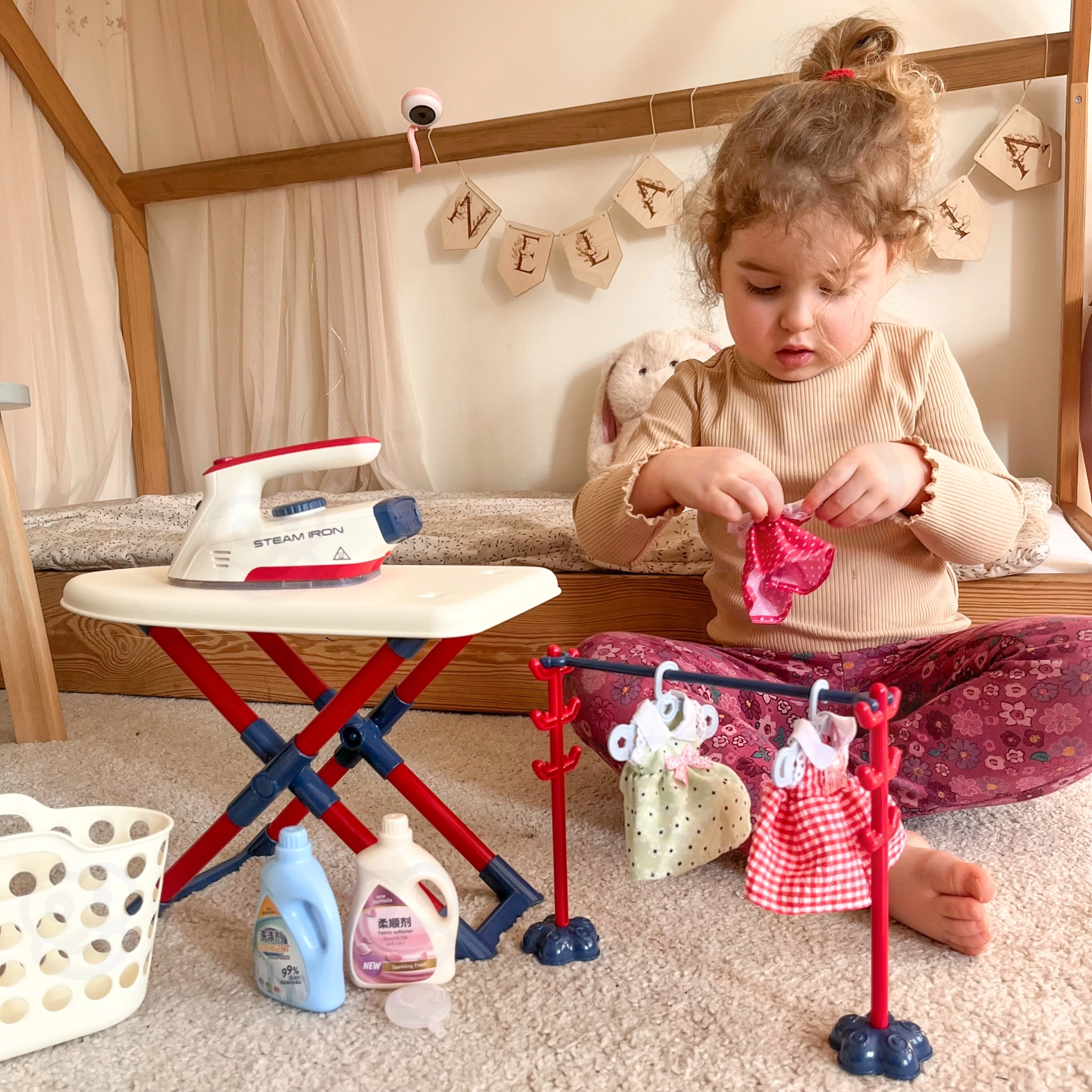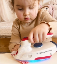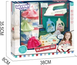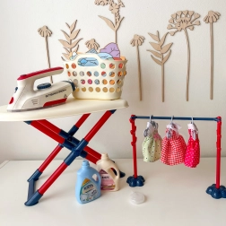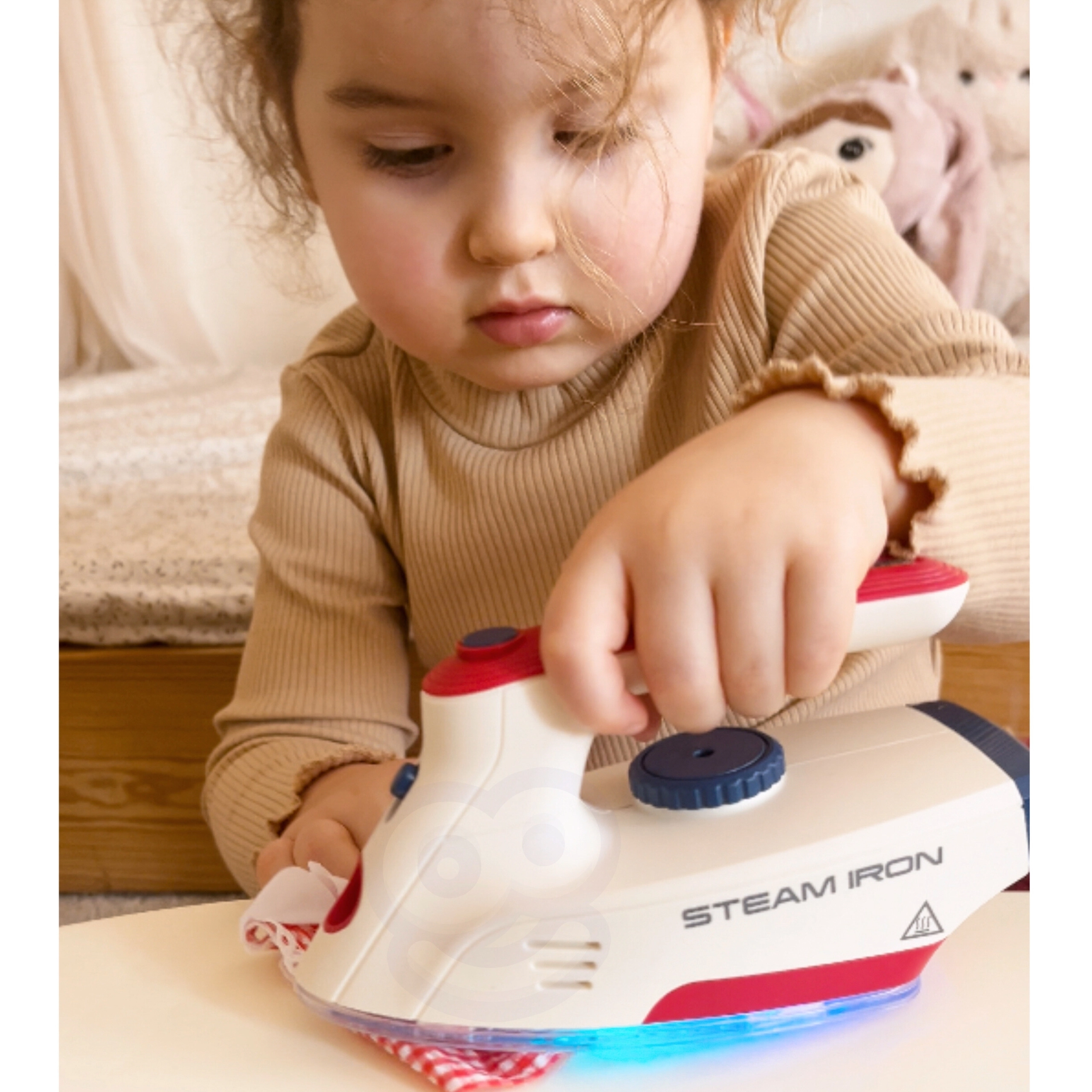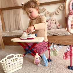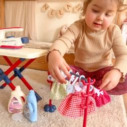 Ютията е играчка безопасна за деца, тъй като не се загрява, но е оборудвана с много функции, които оживяват играта: бутон за имитация на истински звуци на гладене, LED светлина и звукови ефекти под формата на песнички. Този комплект е идеален за деца, които обичат да имитират родителите си в ежедневните дейности.