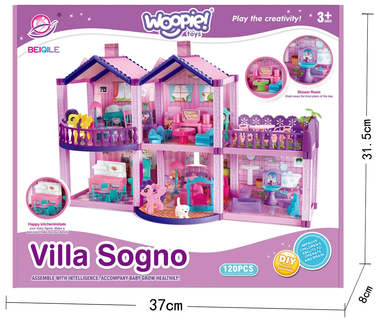 Вълшебната пластмасова къща за кукли от марката WOOPIE е двуетажна вила с богато оборудване и 120 части за безкрайна креативна игра. В комплекта ще откриете 2 понита, кученце, мебели и декорации. Присъстват салон, кухня с трапезария, две спални, баня и балкон. Качествената изработка, безопасните материали и живите цветове ще зарадват всяко дете от 3 години.