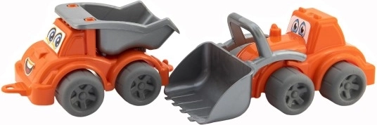 Забавен комплект от две пластмасови строителни превозни средства, който ще зарадва всеки малък строител. Съдържа челен товарач и самосвал, и двете с свободен ход, изработени от издръжлива пластмаса. Идеален като подарък за деца от 12 месеца.