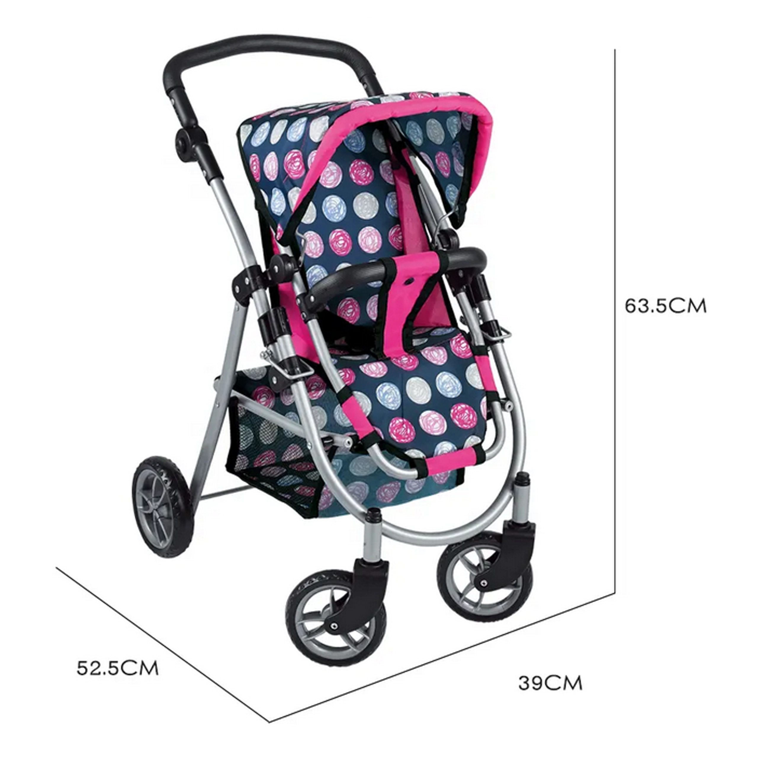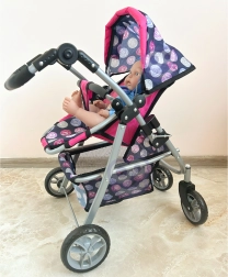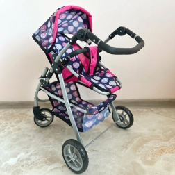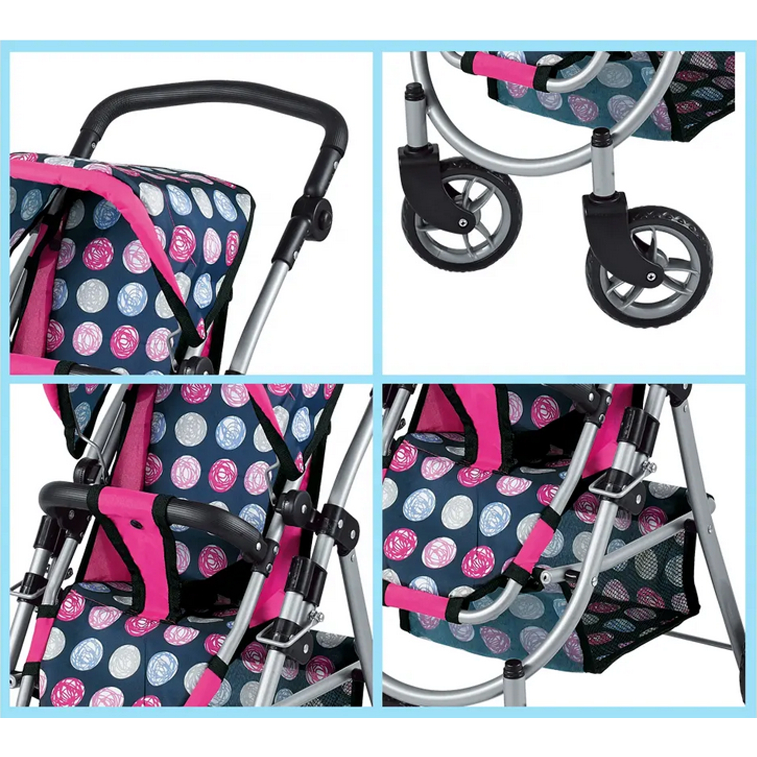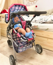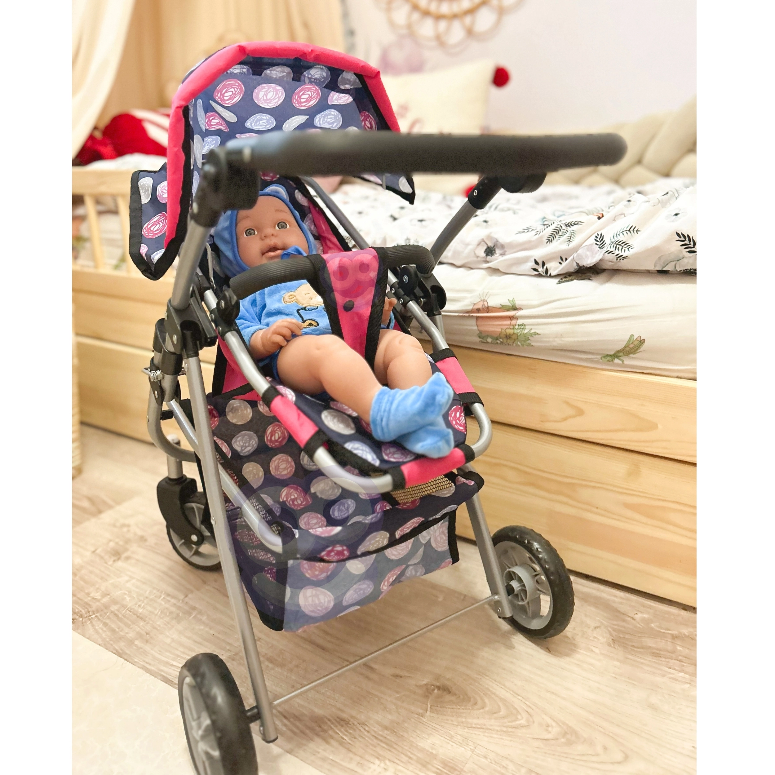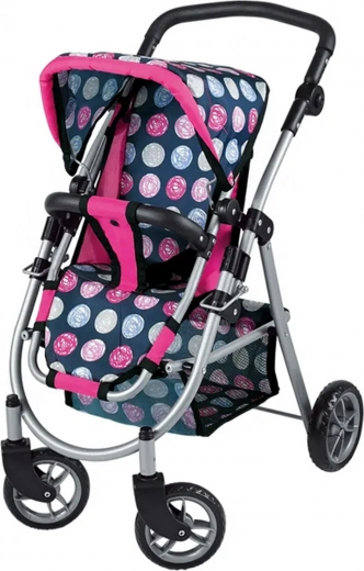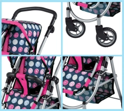 Леката, но стабилна метална конструкция с мека дръжка е щадяща за детските ръце. Просторният текстилен кош под седалката побира всички необходими неща – шише, одеялце и дребни аксесоари. Сгъващият се сенник предпазва куклата при игра на „слънчице“ и позволява лесно прибиране на количката.