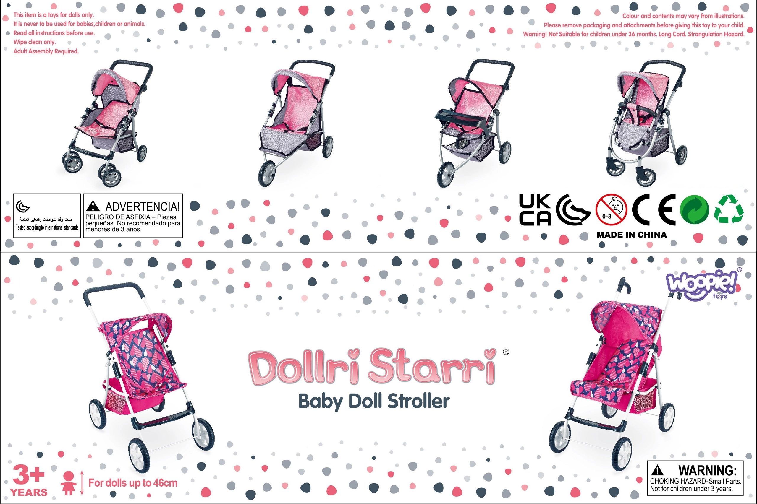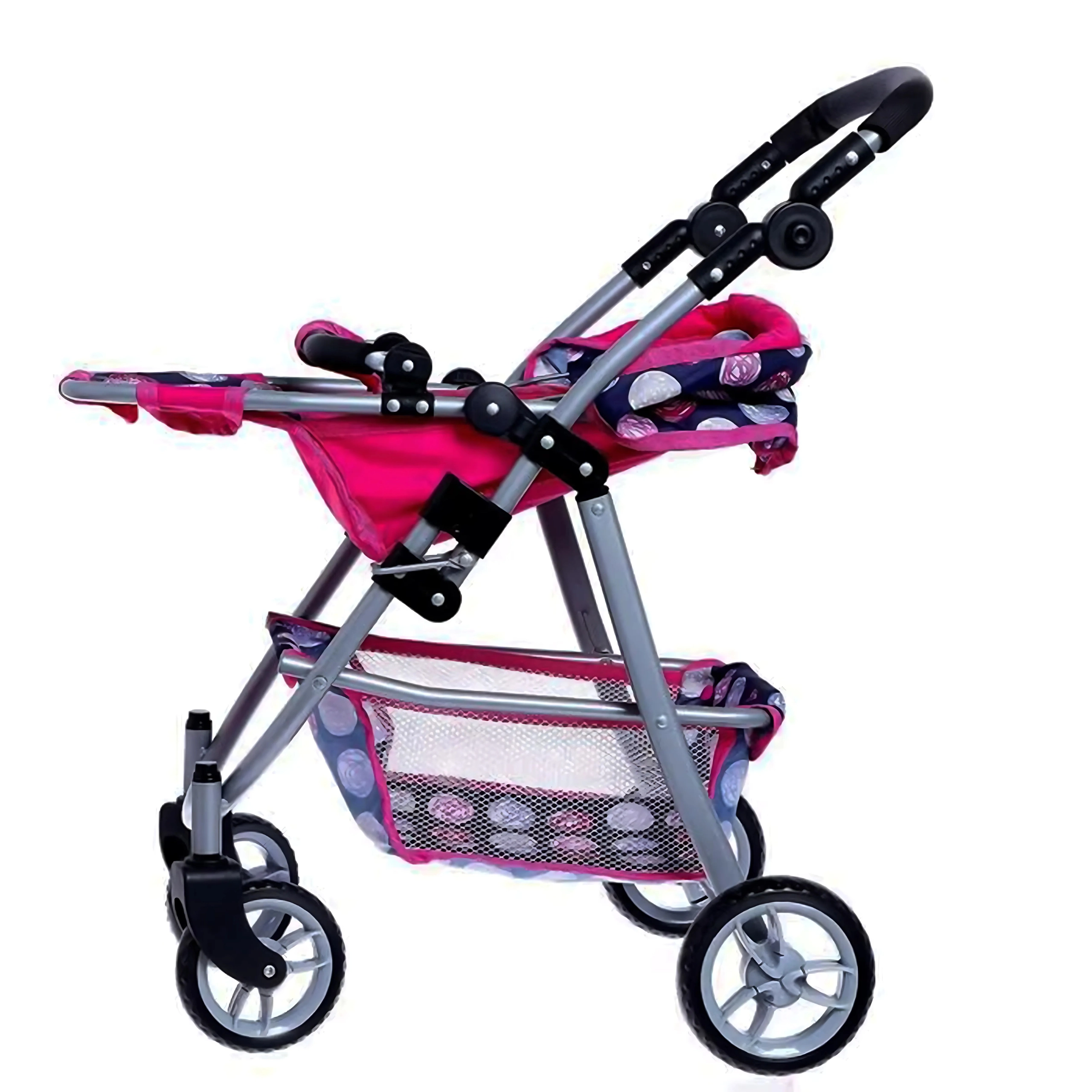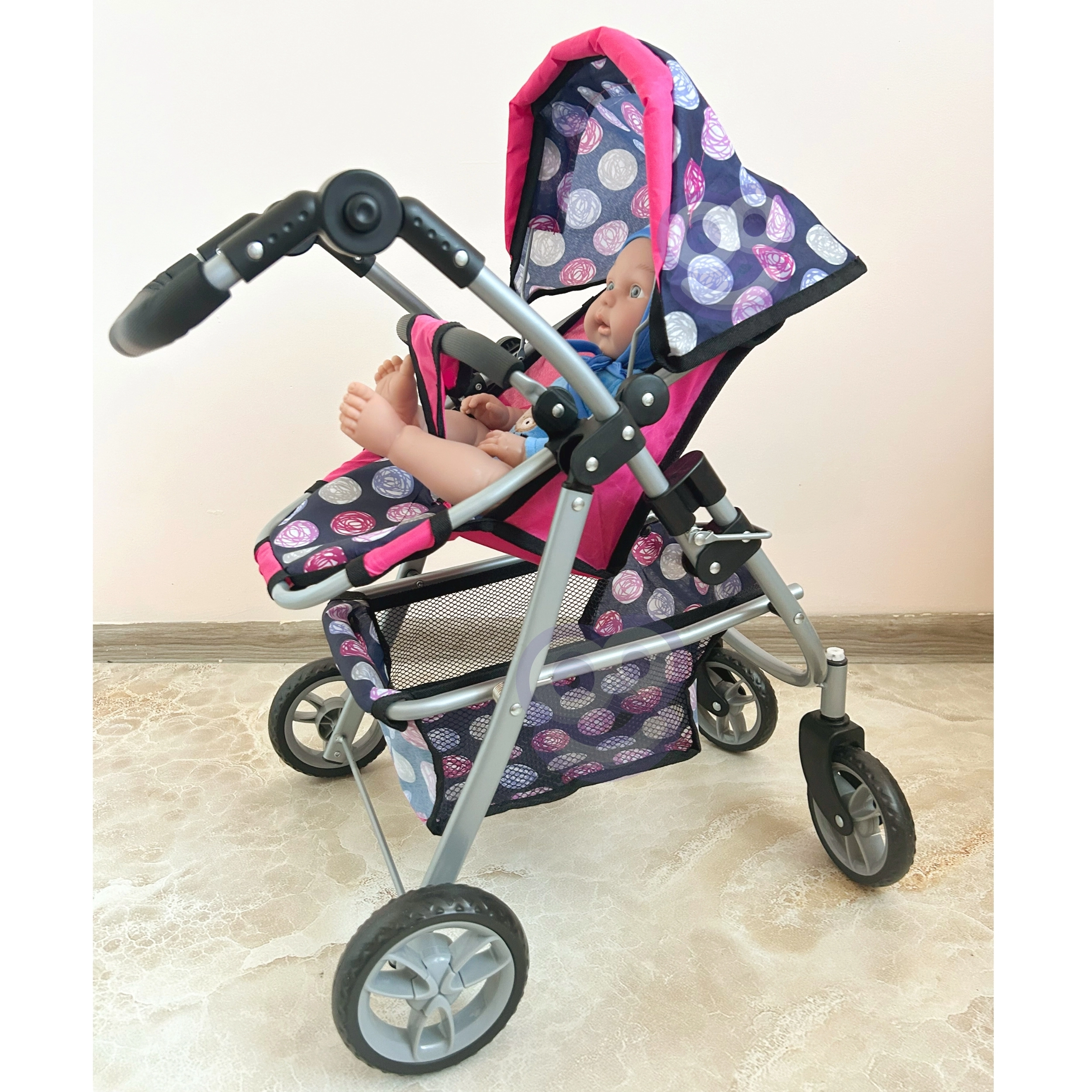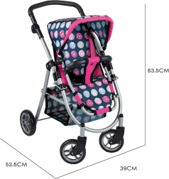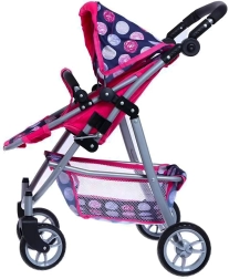 Леката, но стабилна метална конструкция с мека дръжка е щадяща за детските ръце. Просторният текстилен кош под седалката побира всички необходими неща – шише, одеялце и дребни аксесоари. Сгъващият се сенник предпазва куклата при игра на „слънчице“ и позволява лесно прибиране на количката.