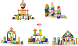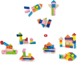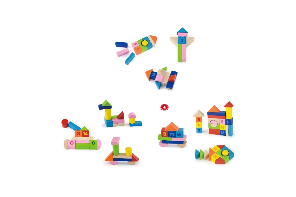 Кубчета с различни форми – кубове, цилиндри, арки и покривчета – вдъхновяват за създаване на кули, къщички и фантастични конструкции и развиват креативността.