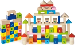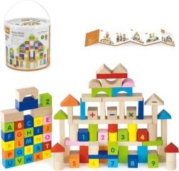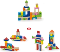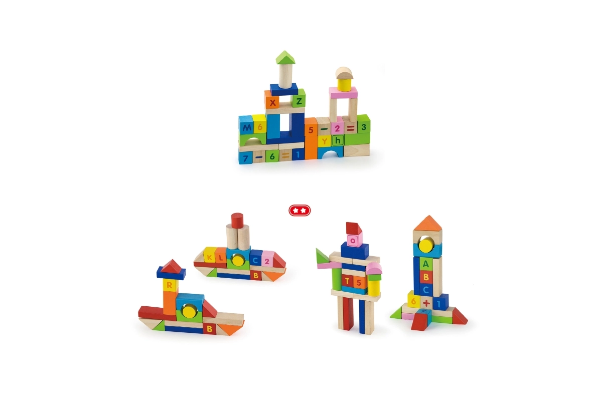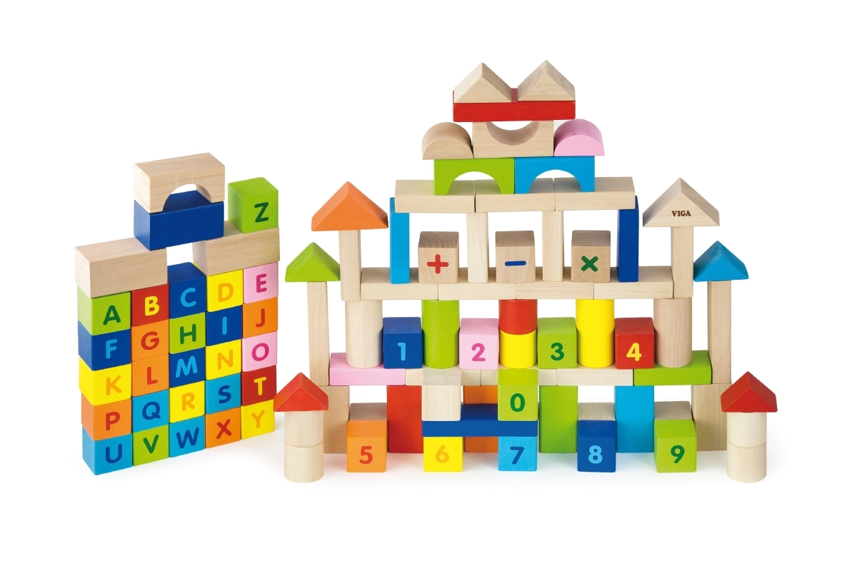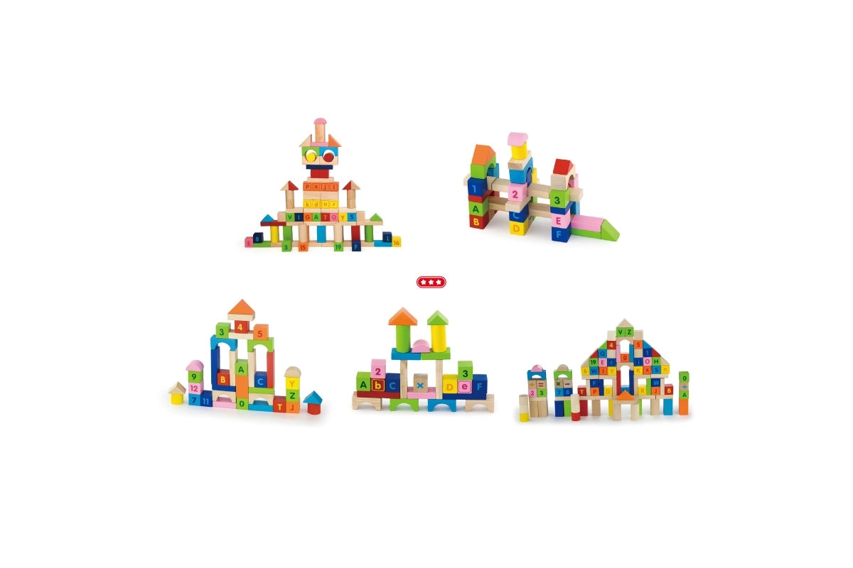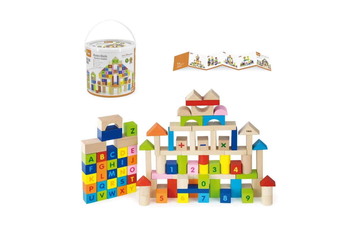 Този пъстър комплект от 100 дървени кубчета VIGA, вдъхновен от принципите на МОНТЕСОРИ, носи на децата радост от откриването на букви, цифри и лесни аритметични задачи. Благодарение на различните форми – кубчета, цилиндри, арки и покриви – децата могат да строят градове, кули и фантазийни постройки, като междувременно неусетно упражняват азбуката, броенето и цветовете.