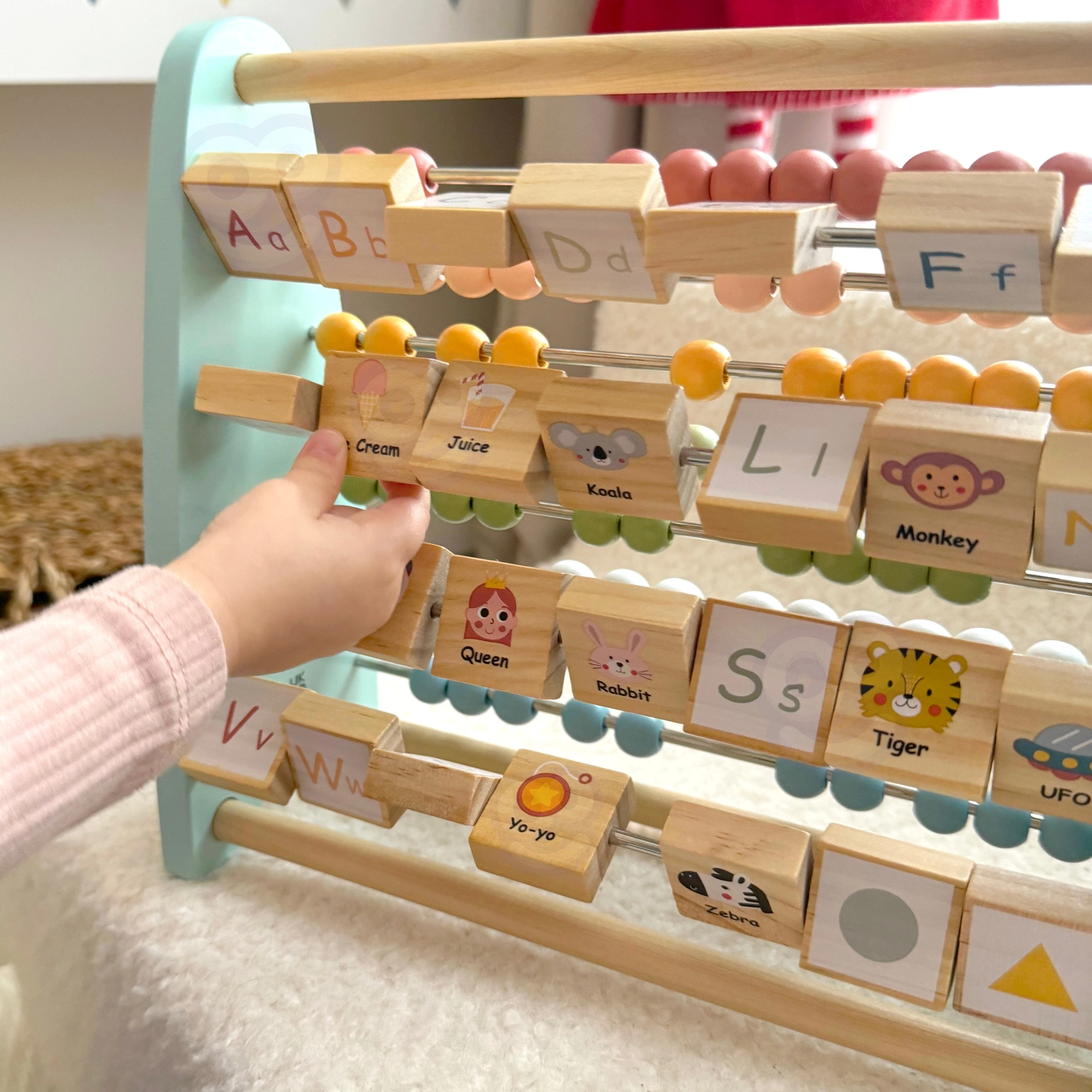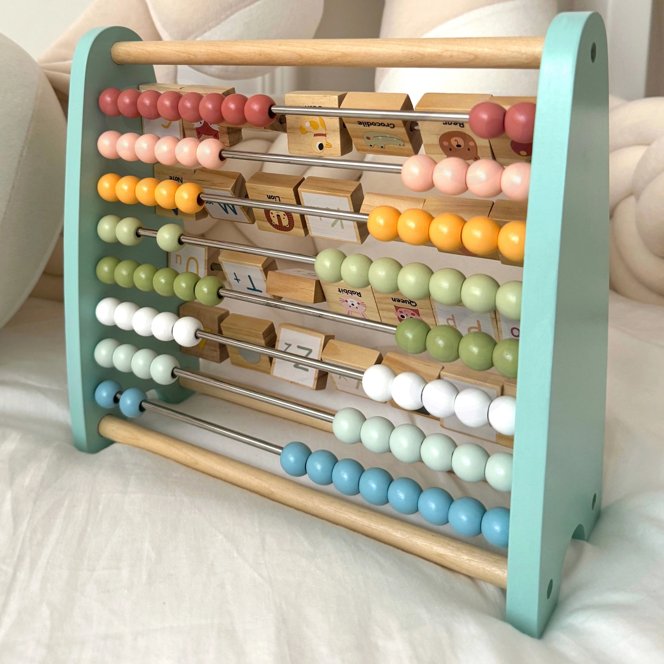 Едната страна съдържа класическо сметало с мъниста за броене, а другата страна има въртящи се блокчета с букви от азбуката и картинки за интерактивно учене.