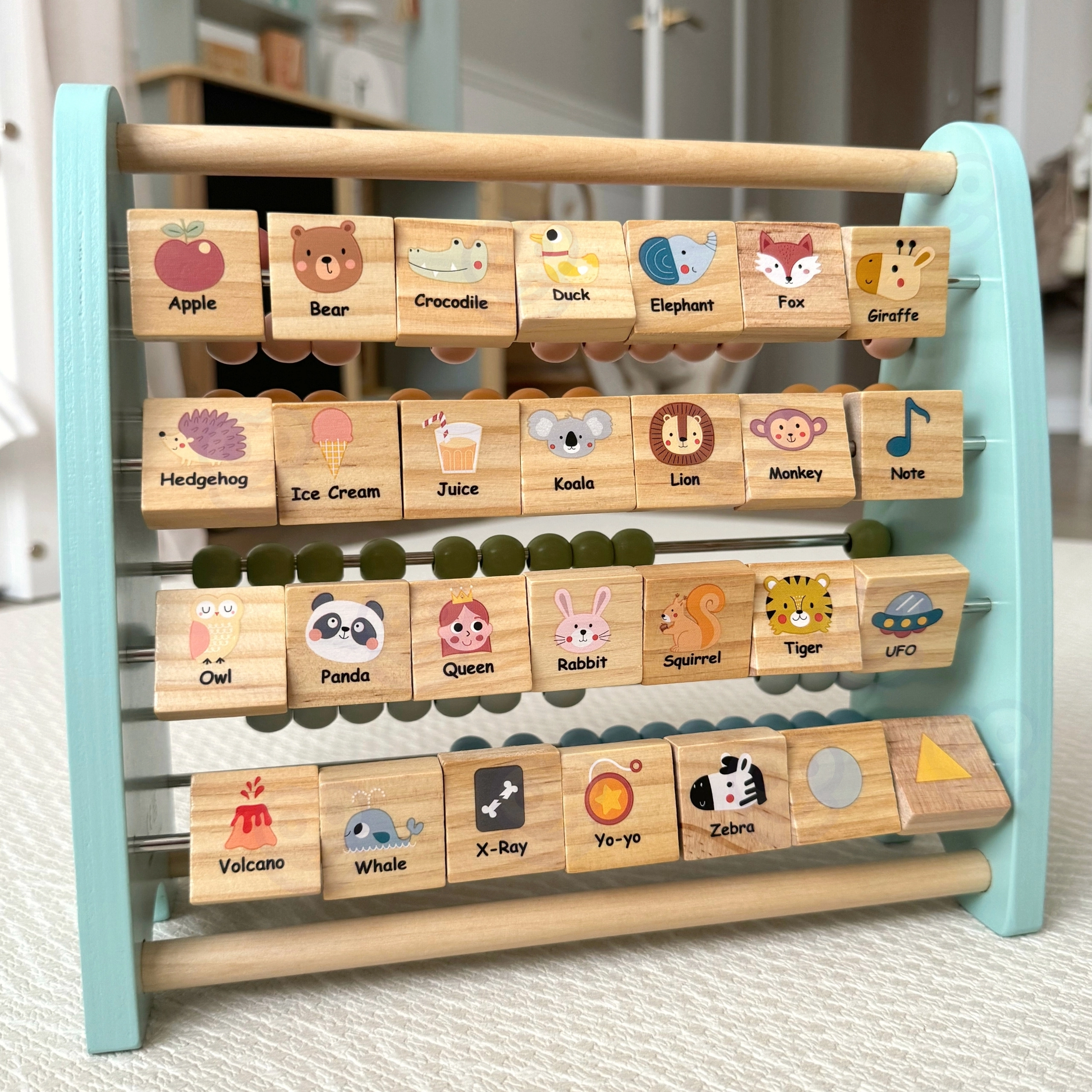 Дървеното образователно сметало и азбука предлага уникална комбинация от забавление и обучение за деца. От едната страна децата могат да се учат на класическо броене с цветни мъниста, които подпомагат основните математически умения. От другата страна има дъска с въртящи се блокчета, съдържащи главни и малки букви, допълнени с картинки, които превръщат ученето на азбуката в игра, изпълнена със забавление и ангажираност.