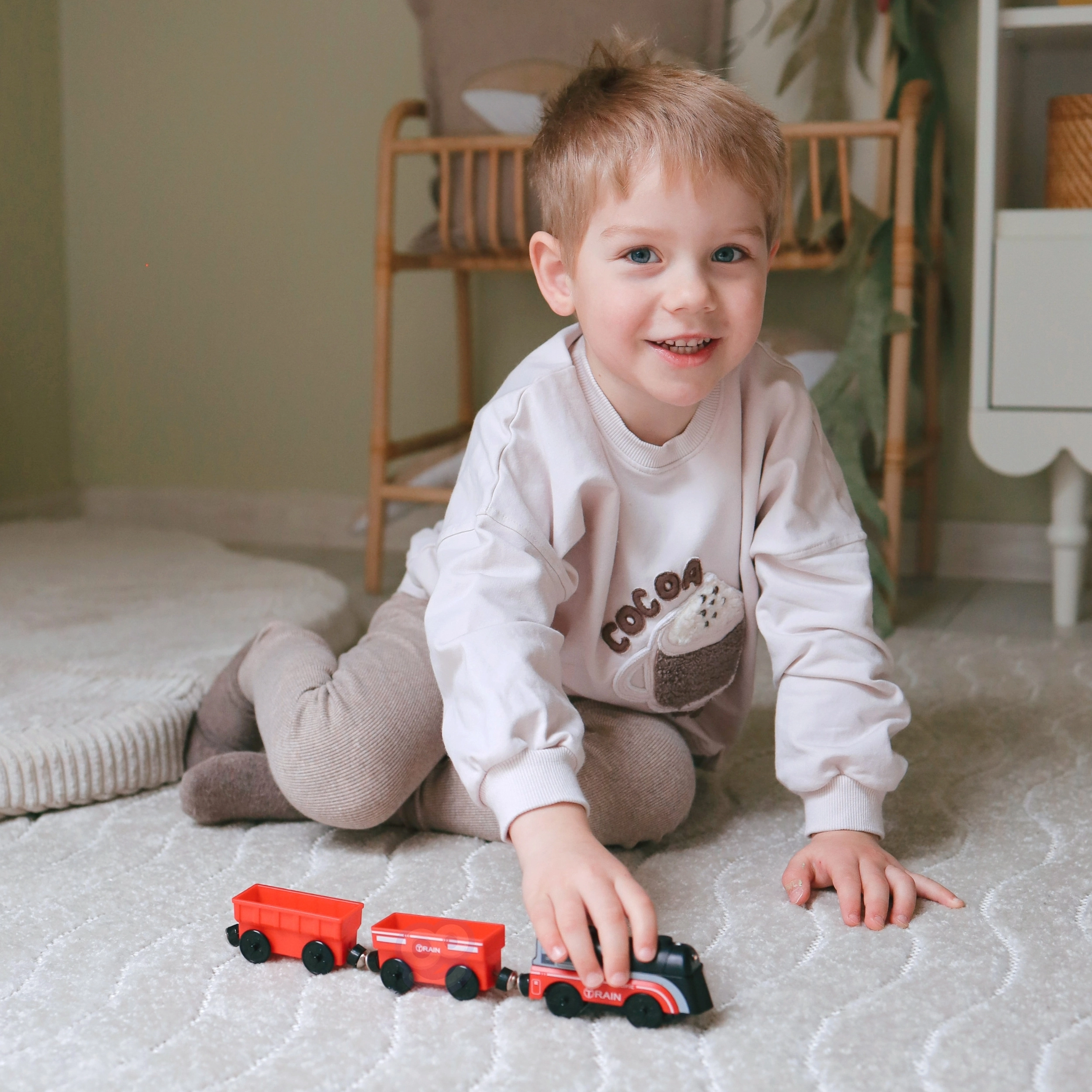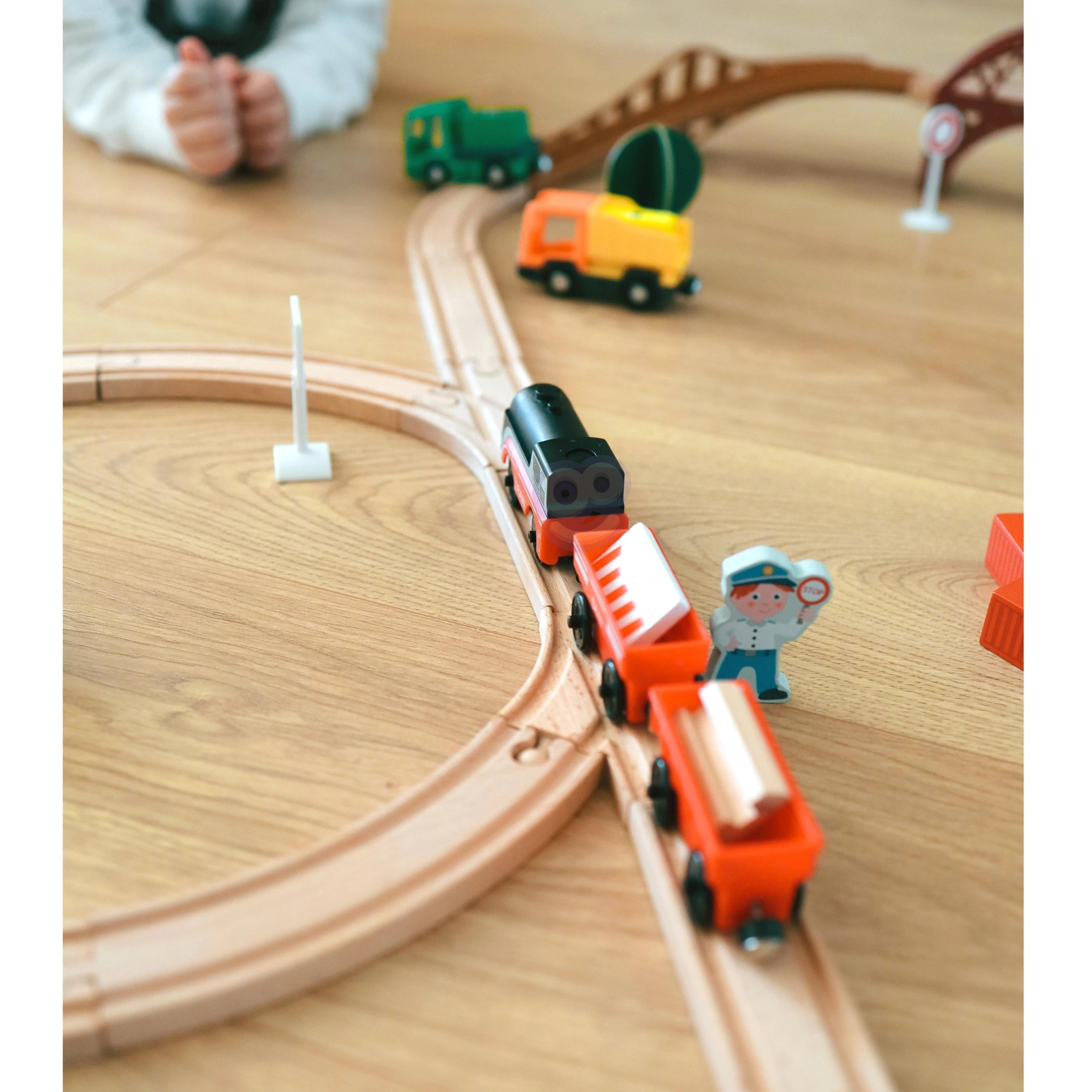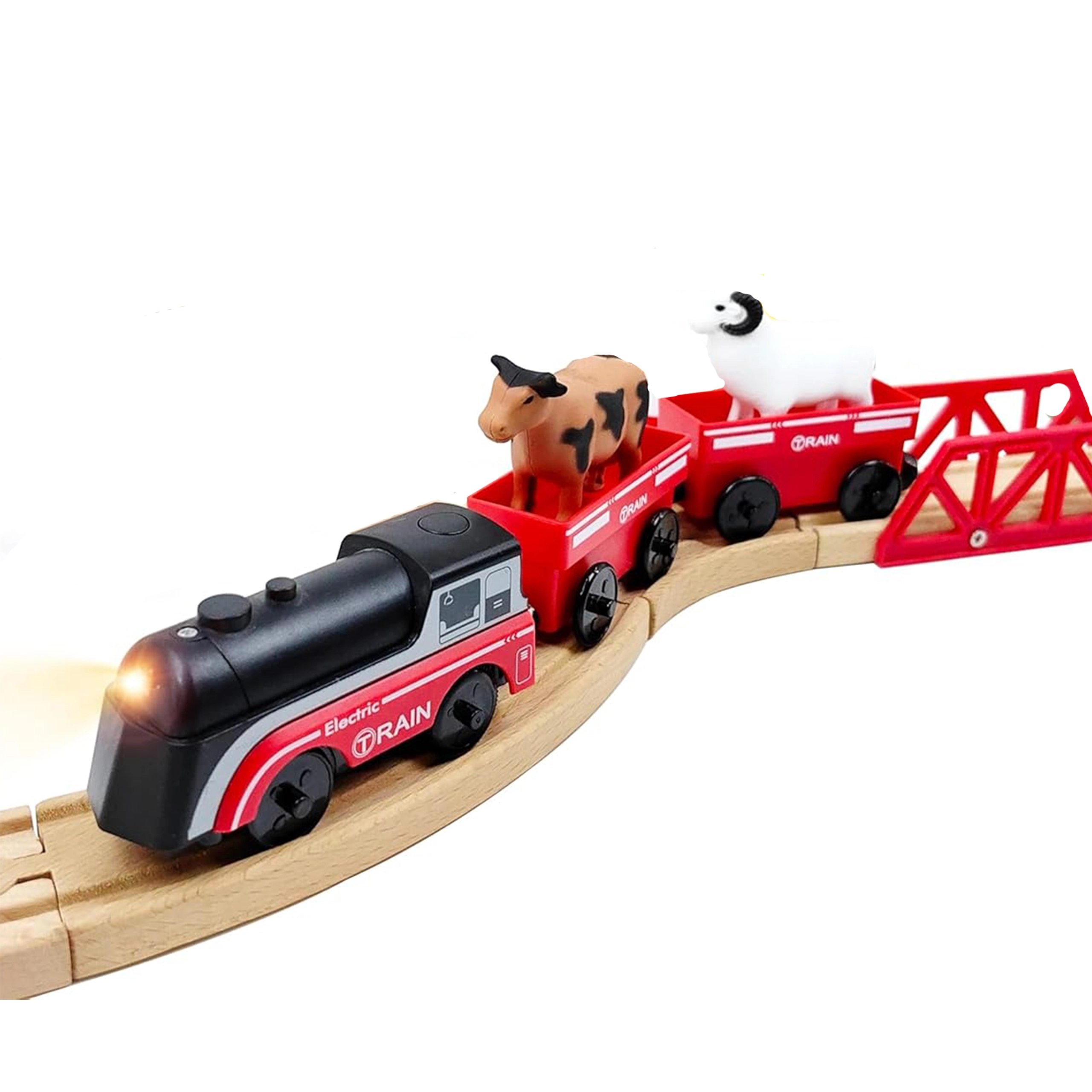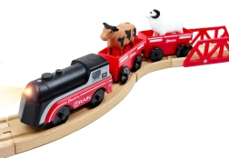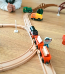 Комплектът използва магнитно свързване на вагоните за бърза и интуитивна сглобка. Локомотивът е захранван само от една AAA батерия (не е включена), по време на движение свети и се движи плавно като истински влак. Благодарение на стандартния габарит е съвместим с повечето дървени трасета (ширина на релсата прибл. 4 см, ширина на осчицата прибл. 2,5 см) – отлична добавка към сетове на IKEA, Brio и др.