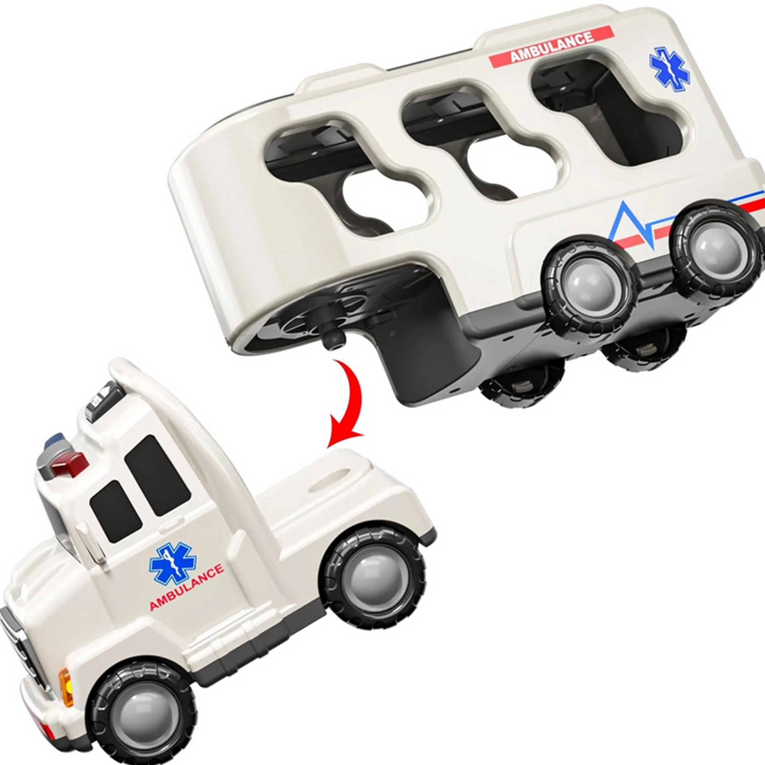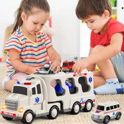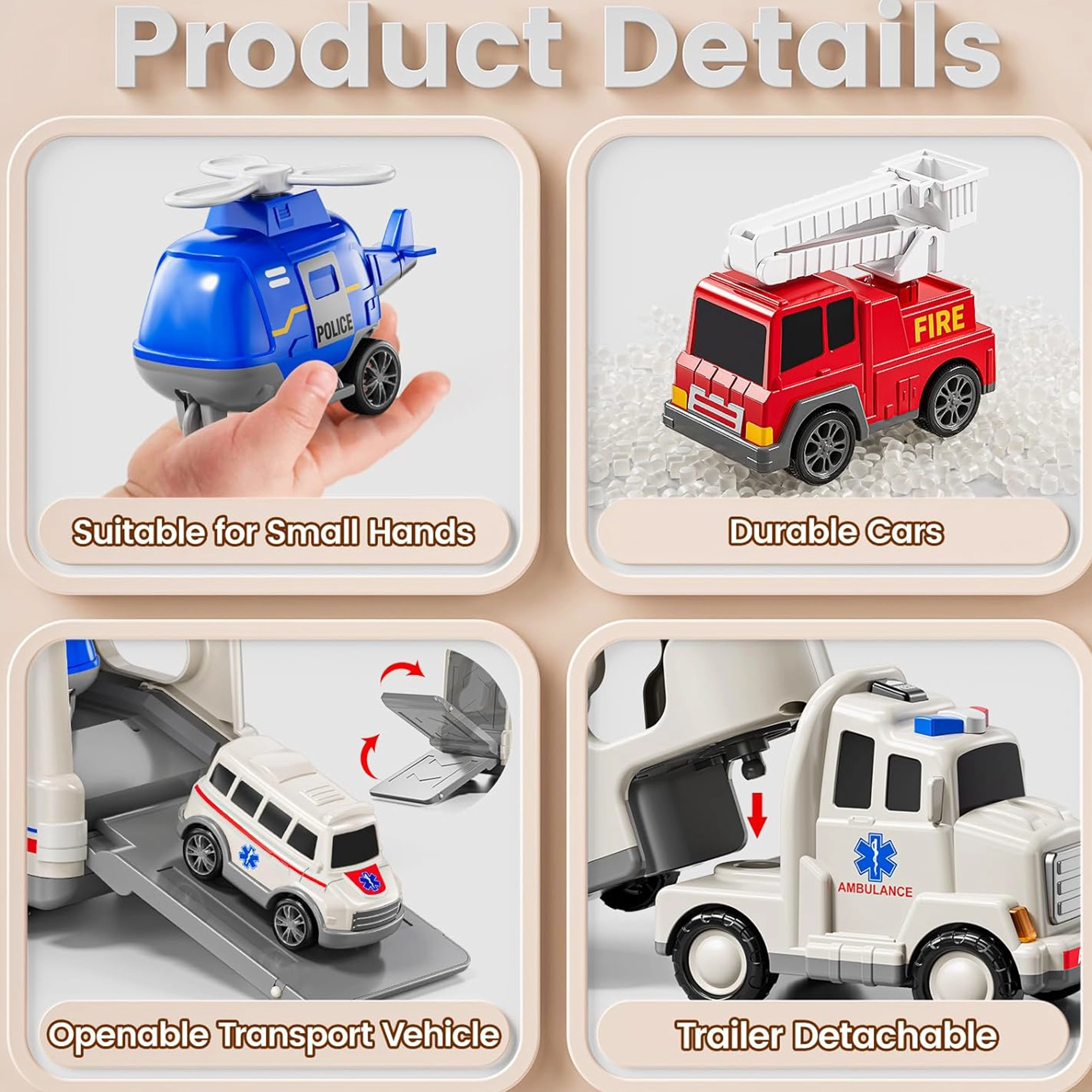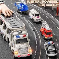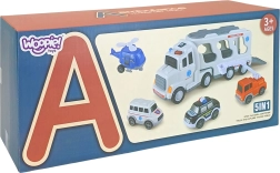 Големият транспортен камион побира пожарна кола, полицейска кола, полицейски хеликоптер и линейка. Идеален за трениране на най-различни спасителни сценарии.