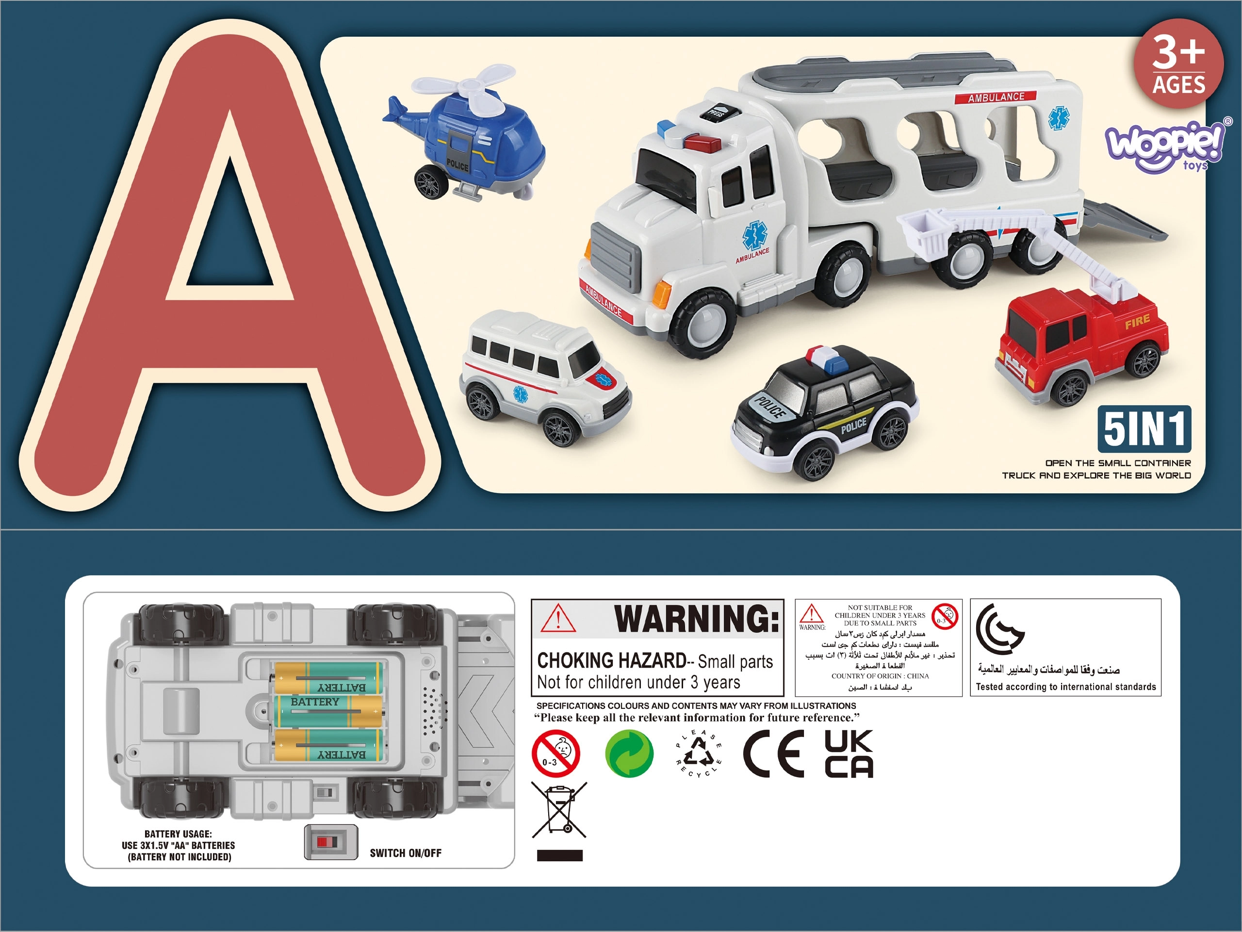 Този интерактивен спасителен комплект пренася децата в света на истинските акции: голямата транспортна линейка/влекач превозва и съхранява цялото звено – пожарен автомобил, полицейска кола, полицейски хеликоптер и линейка. С натискане на бутона в горната част на кабината се активират светлинни ефекти и сирени, които още повече въвличат в играта.