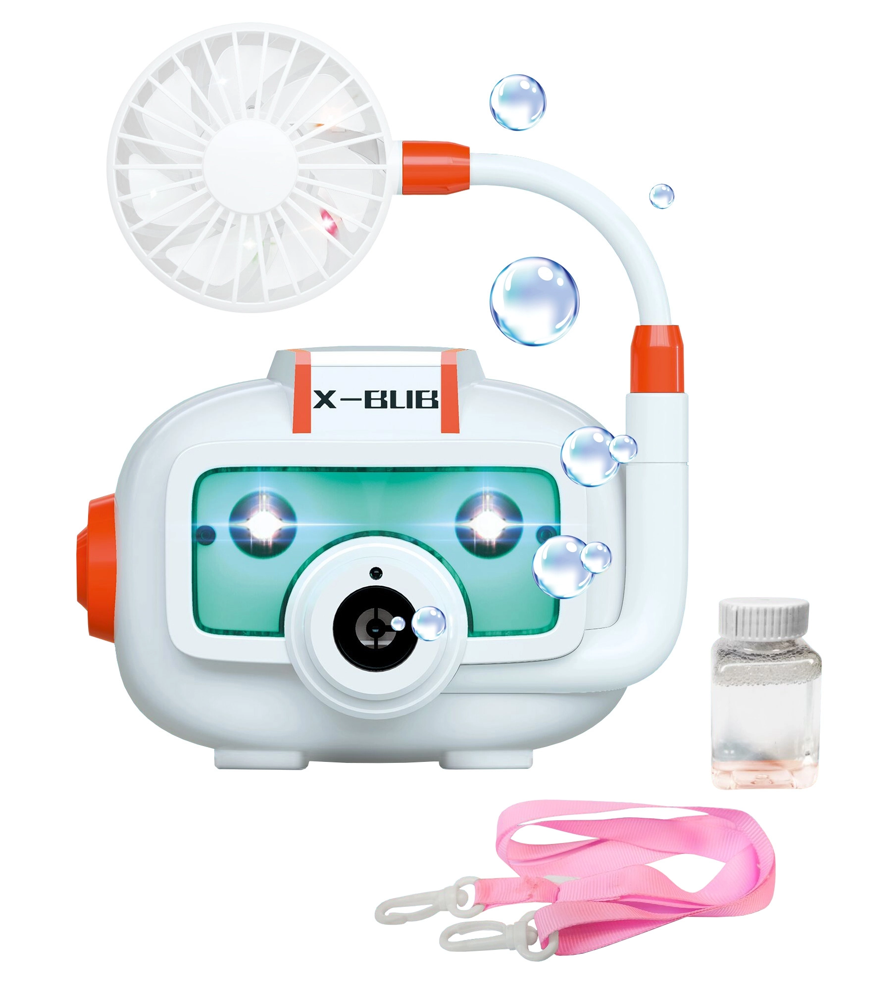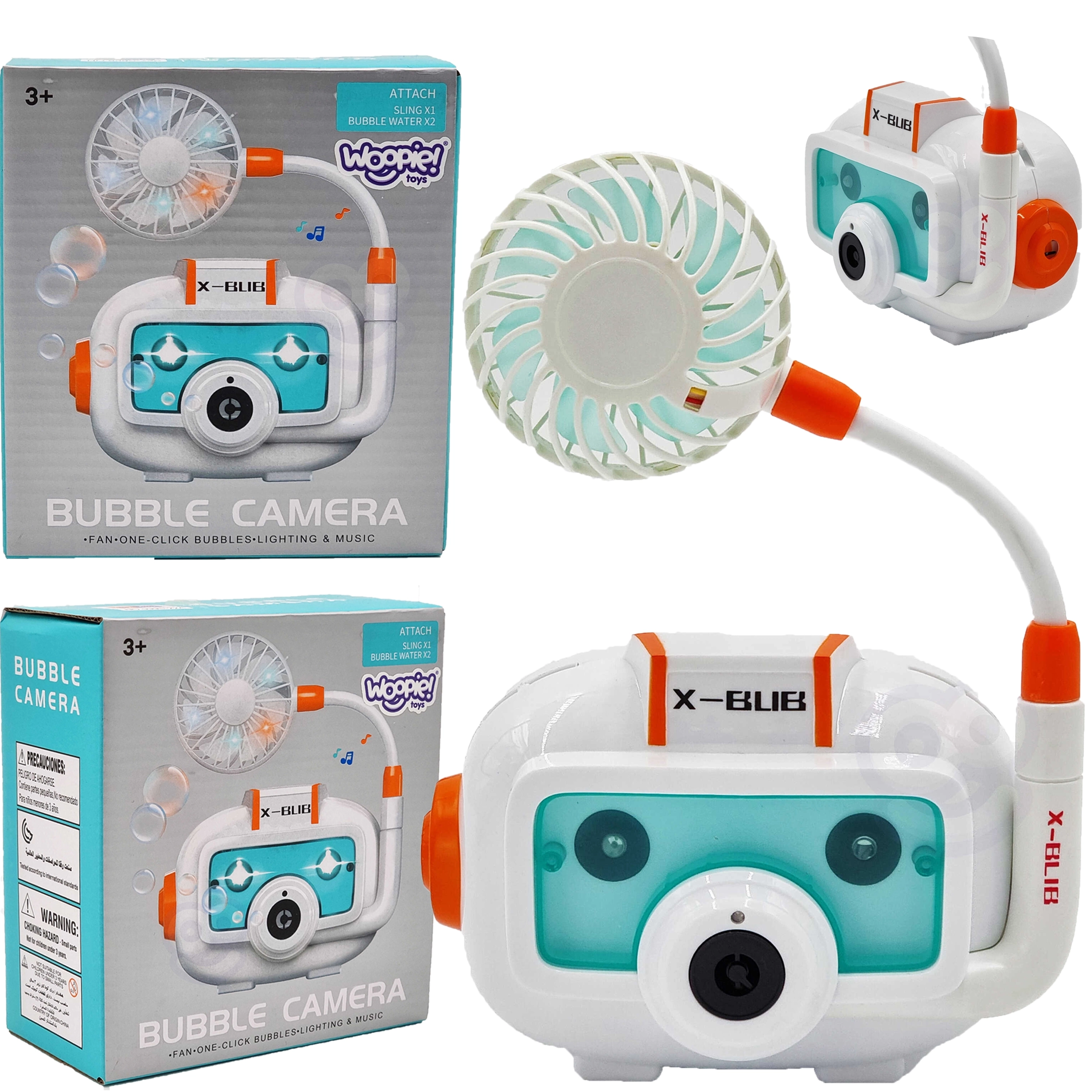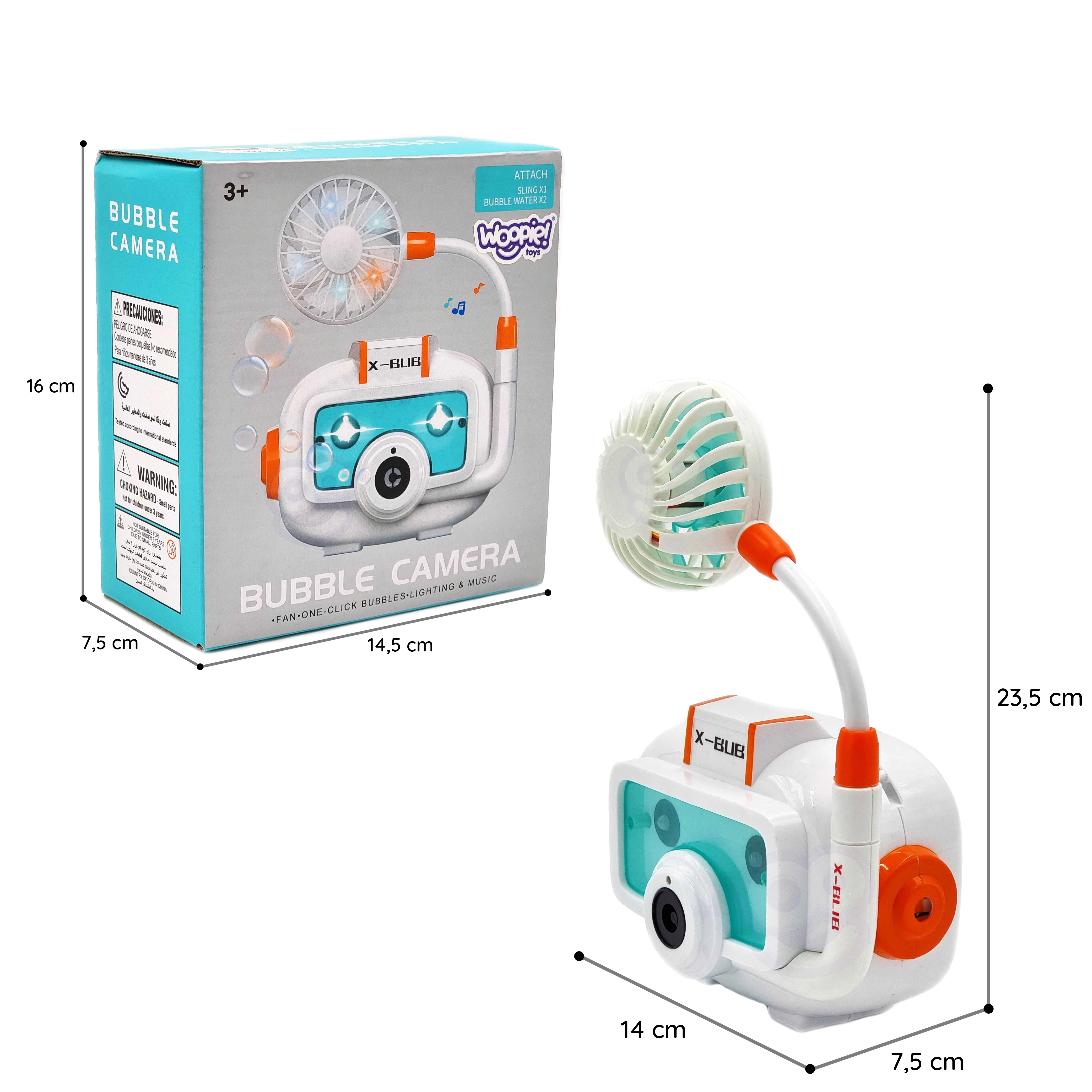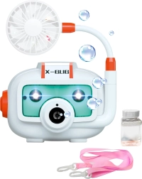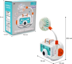 Компактното тяло във форма на фотоапарат, практичната връв за шия и съдчетата за разтвор го правят идеална играчка за навън и за празненства.