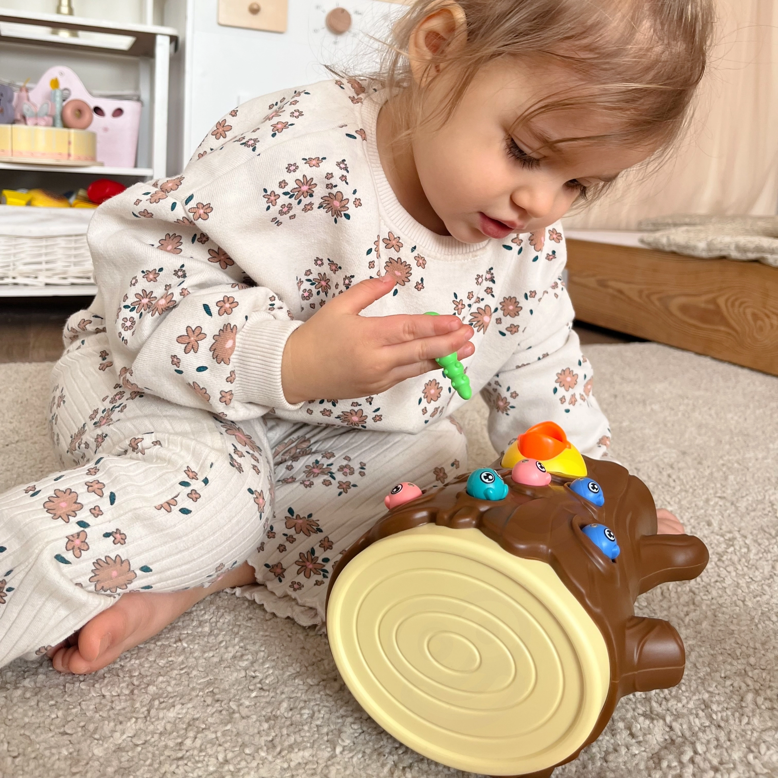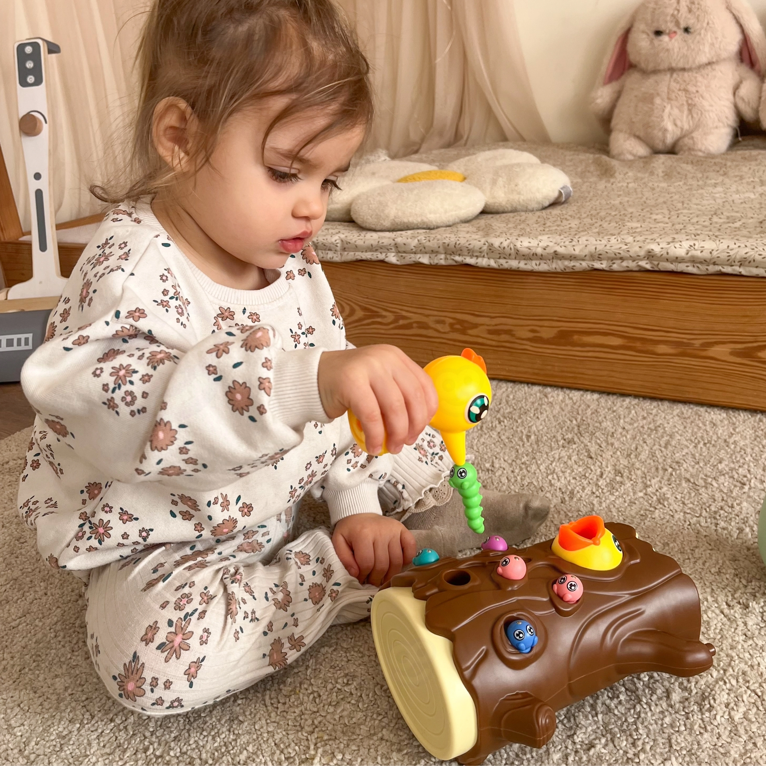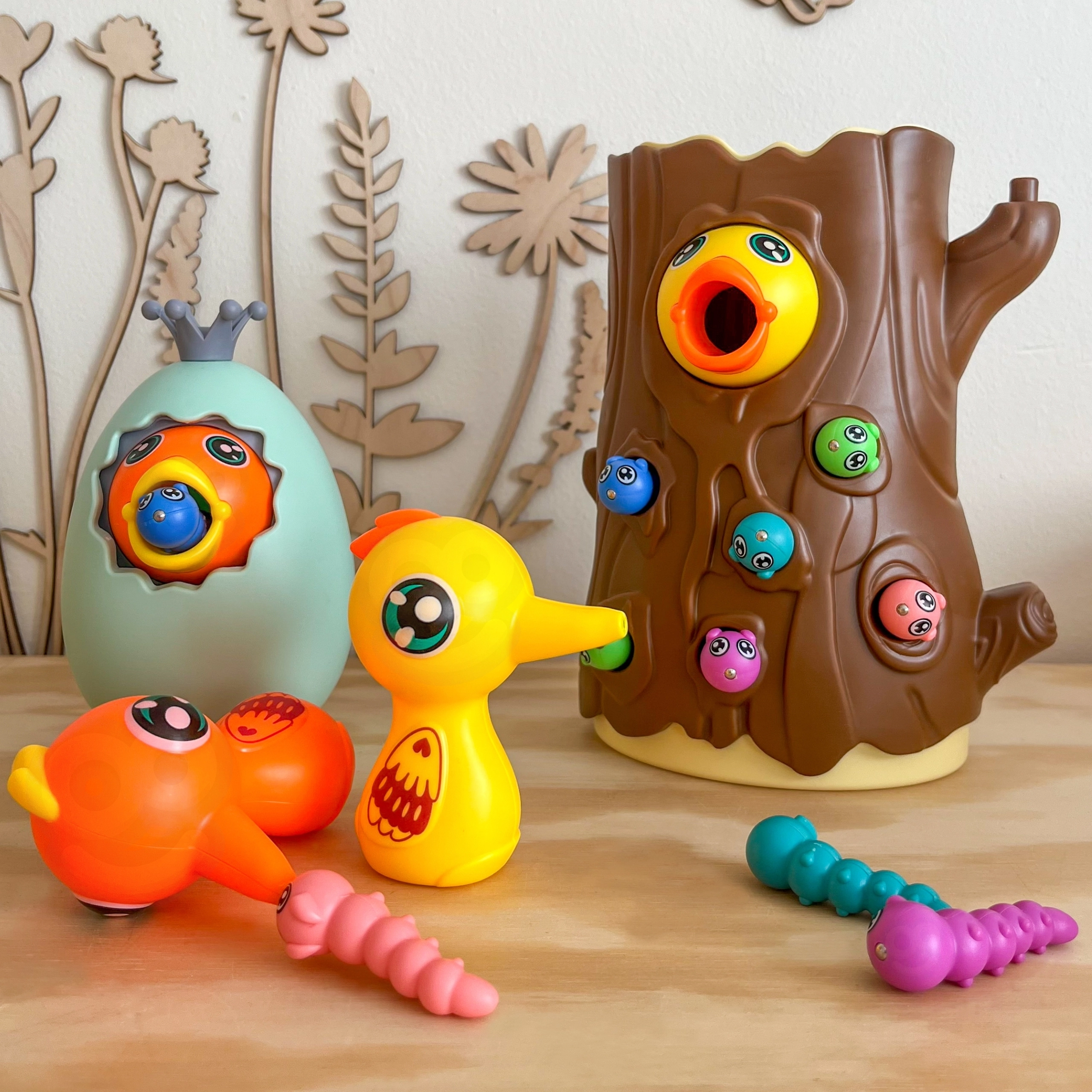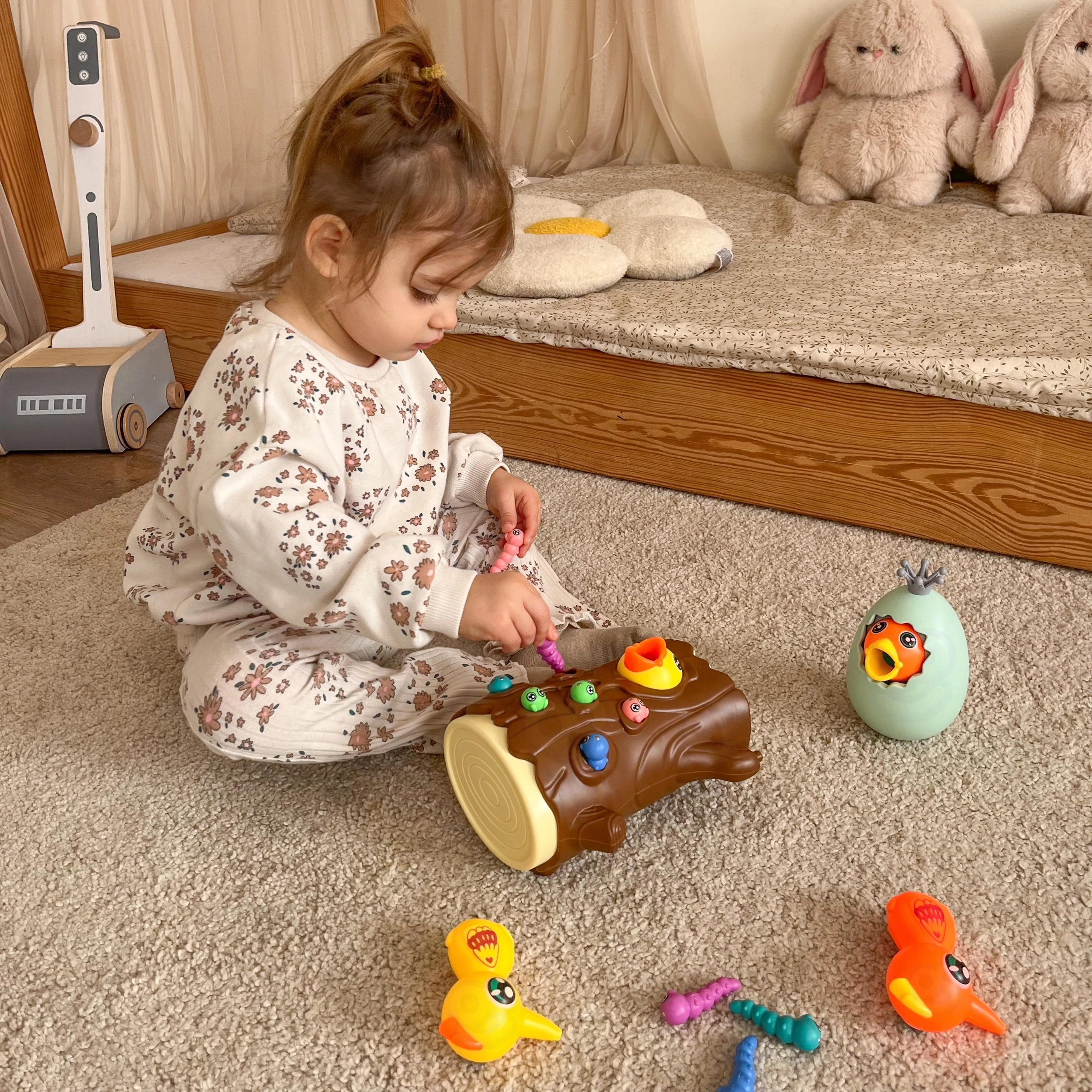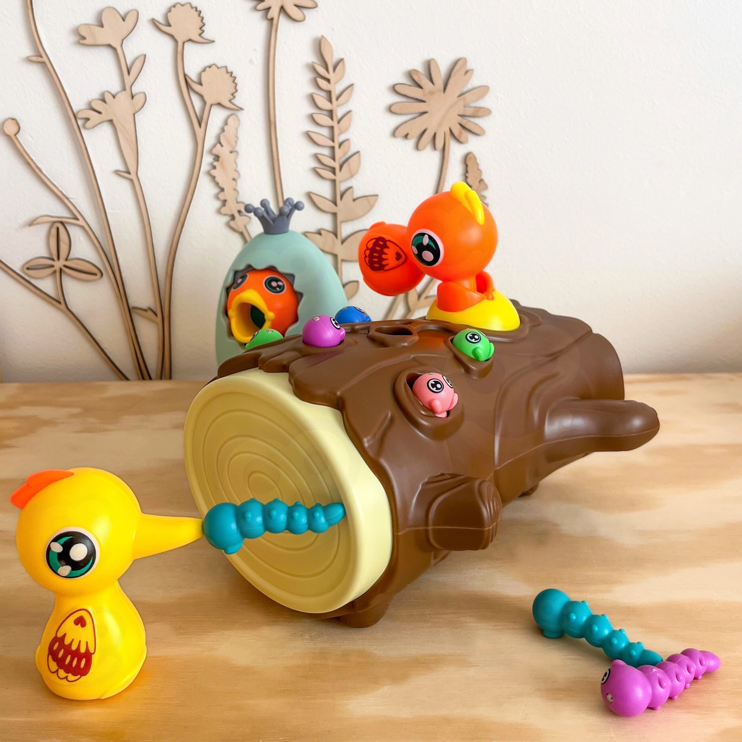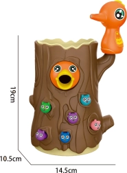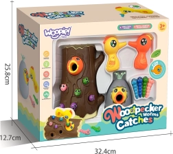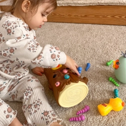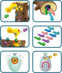 С помощта на магнитни човки децата хващат червейчета и хранят пиленцето. Тренират прецизност, захват и координация око–ръка по забавен начин.