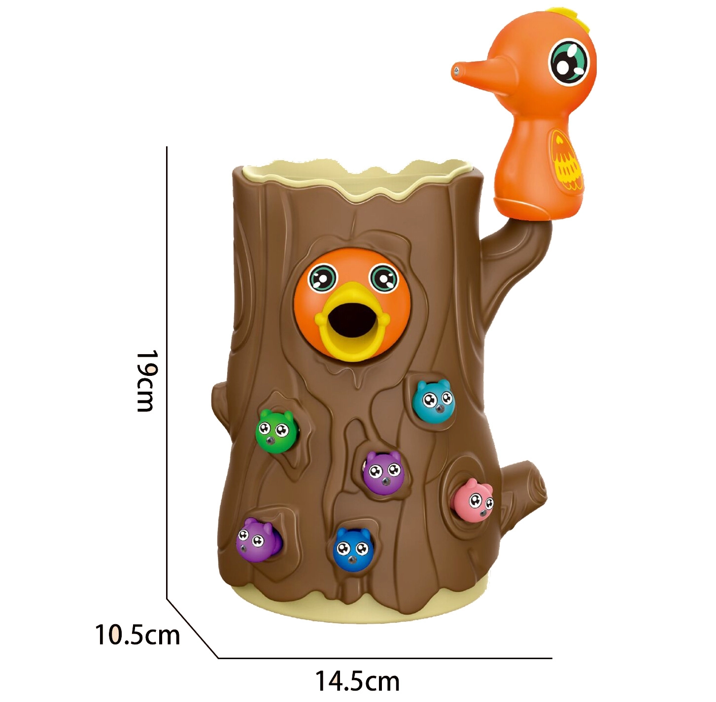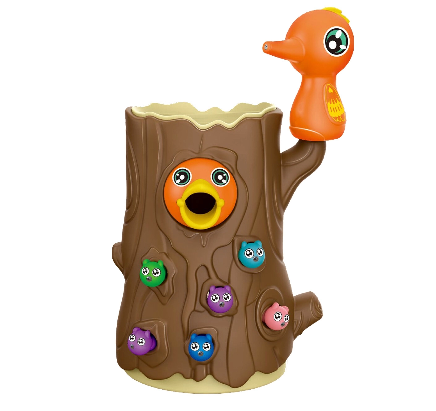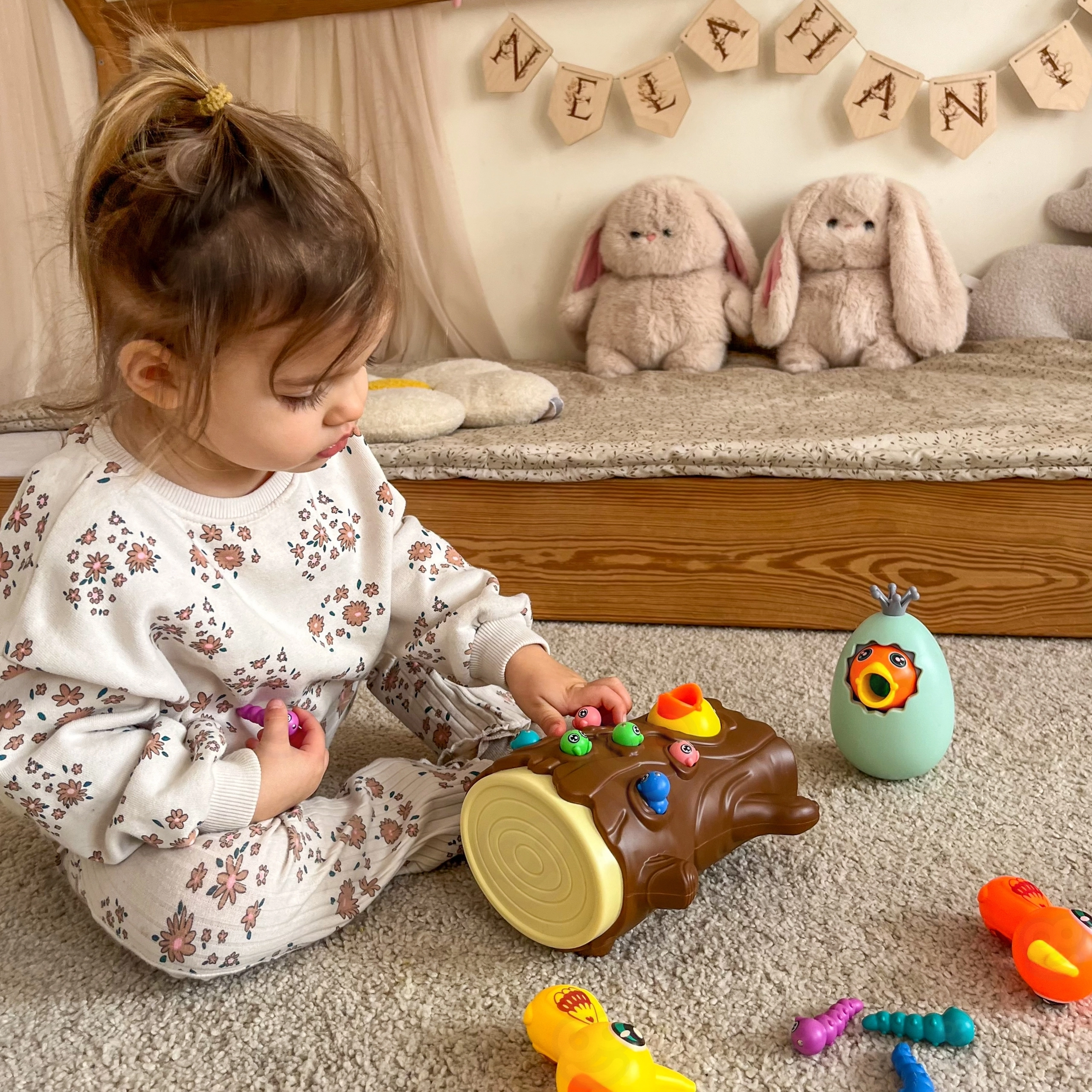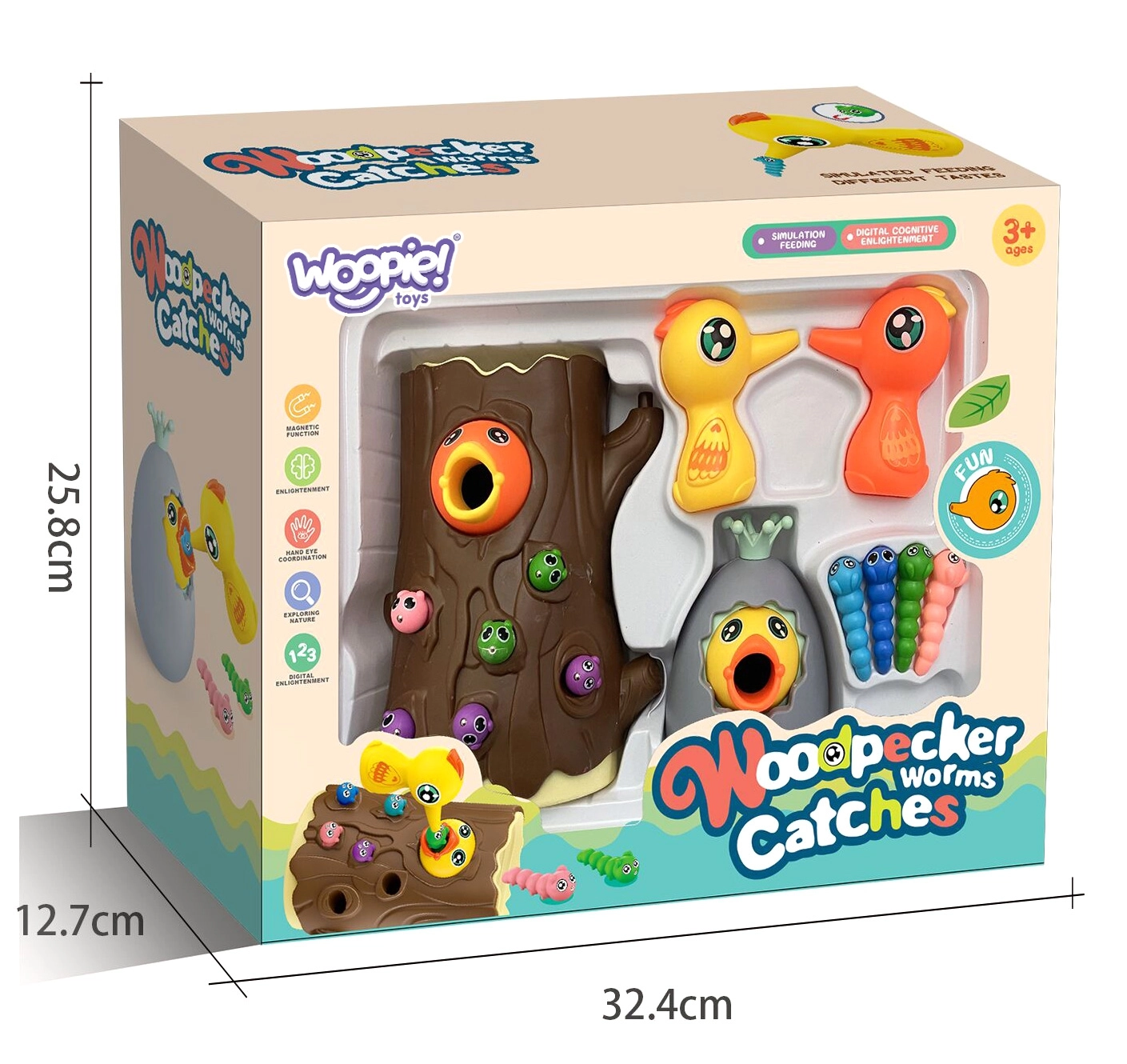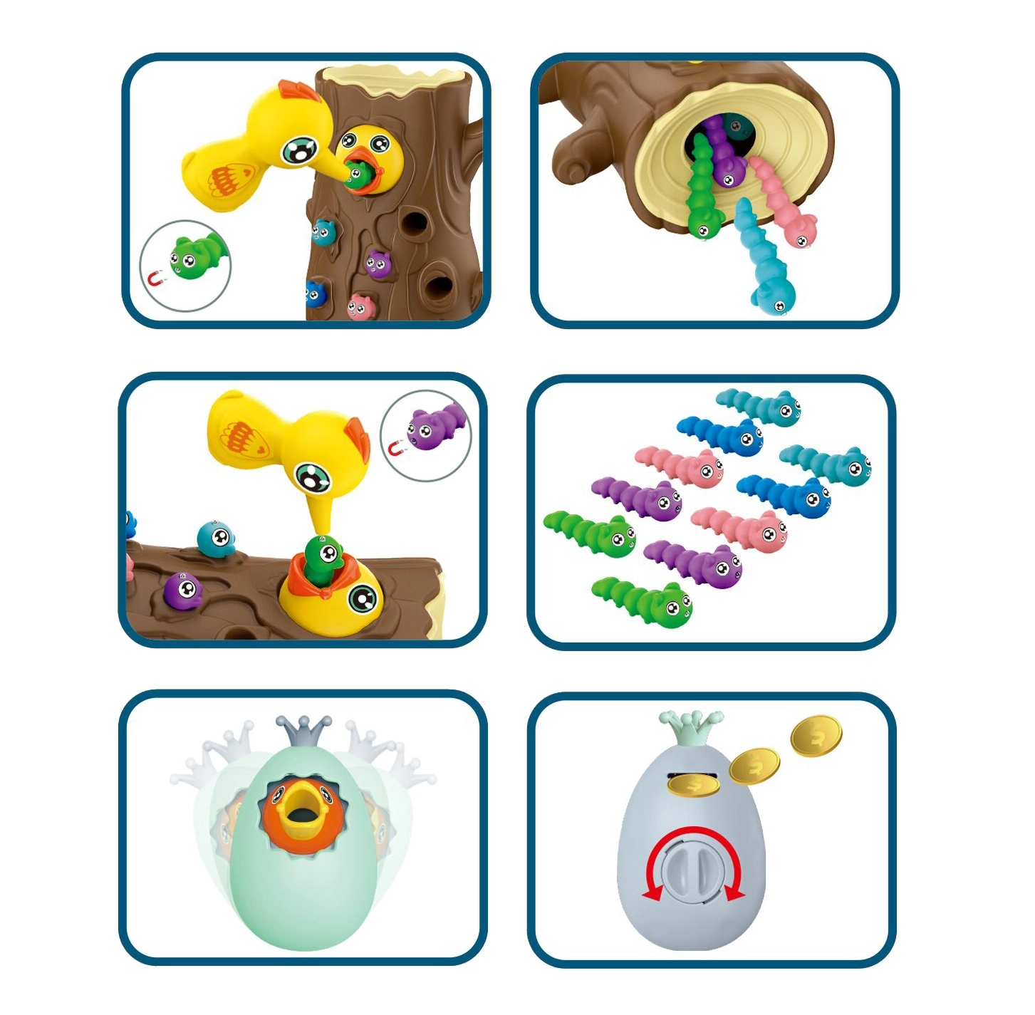 С помощта на магнитни човки децата хващат червейчета и хранят пиленцето. Тренират прецизност, захват и координация око–ръка по забавен начин.