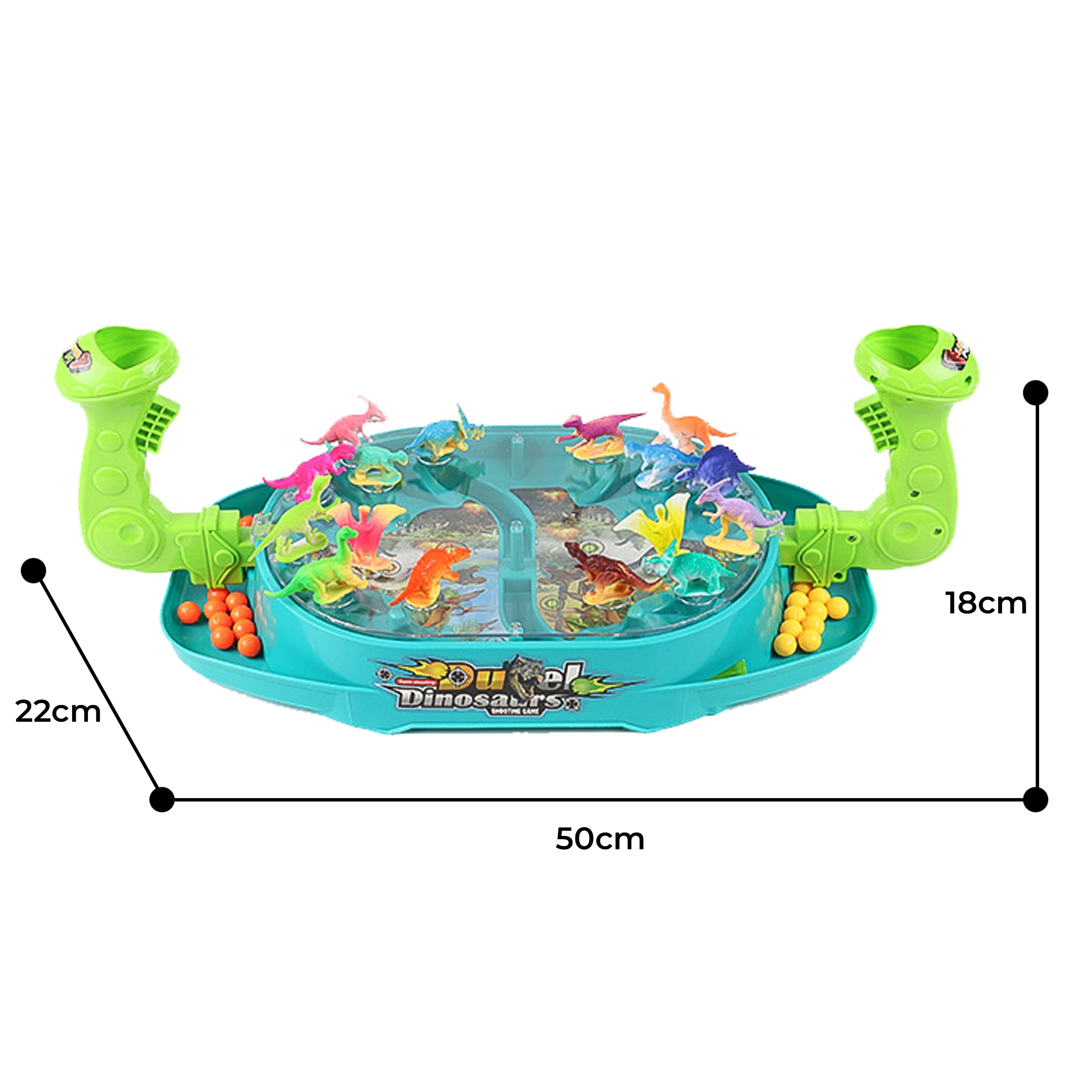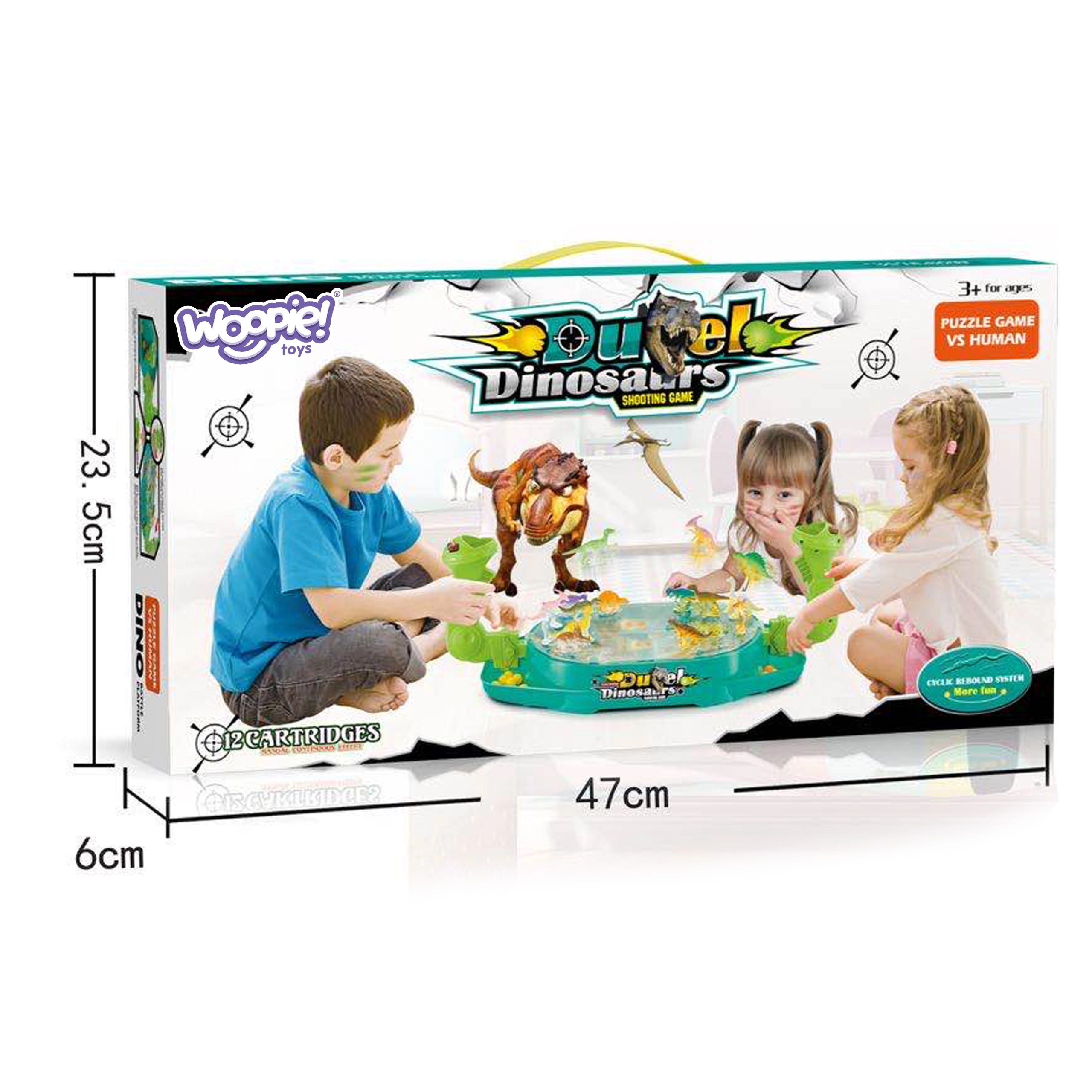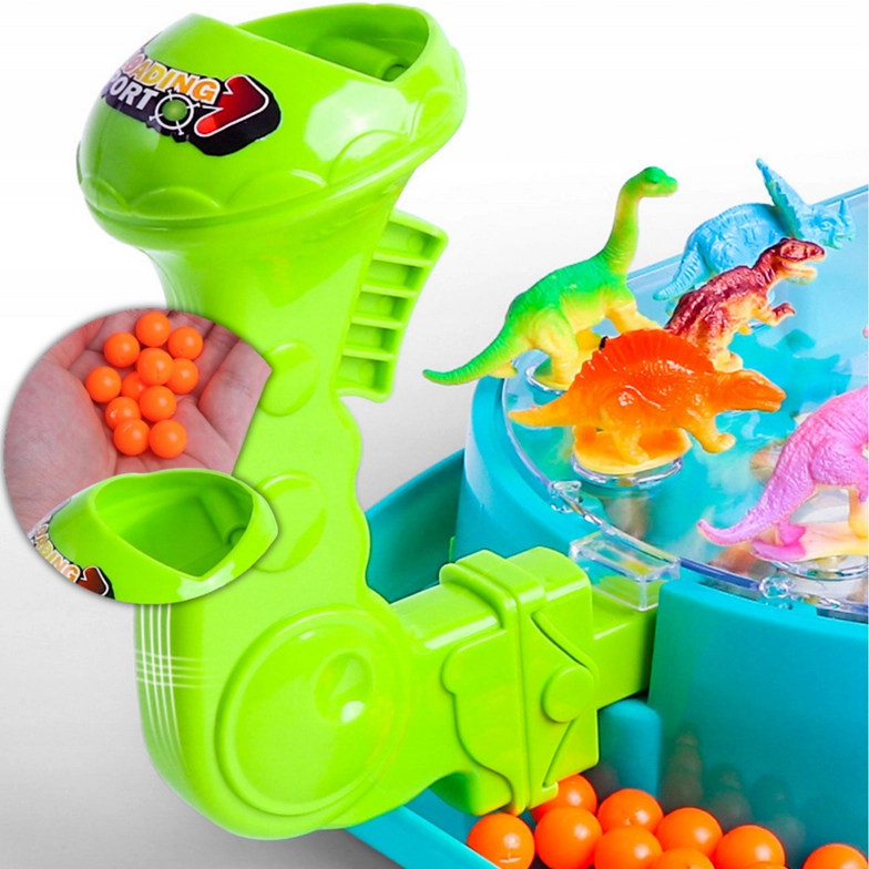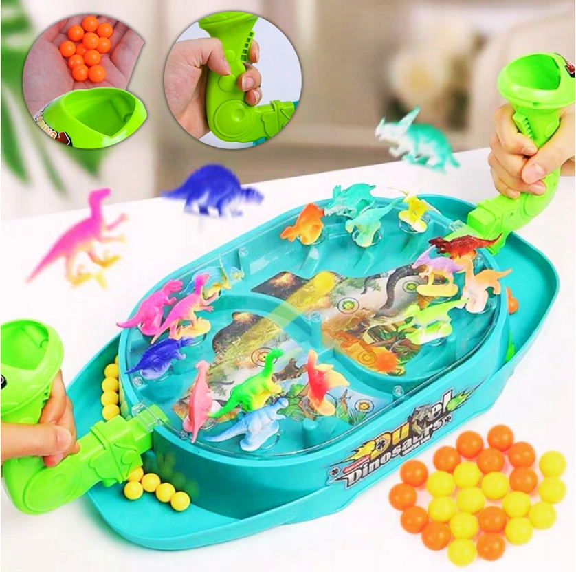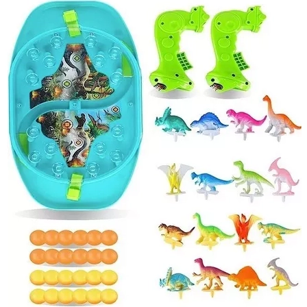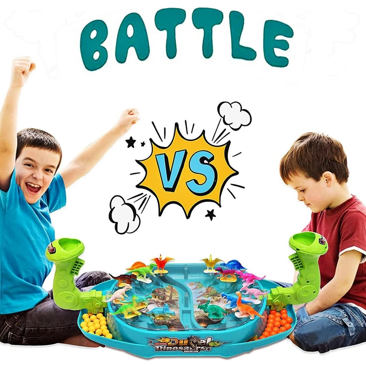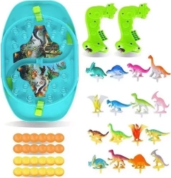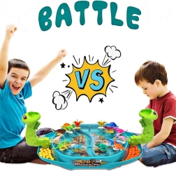 Woopie Битка на динозаврите е динамична настолна игра, която ще впечатли малките любители на праисторията и състезателните игри. Всеки играч управлява своя изстрелвач и с пянови топчета се стреми да уцели възможно най-много от динозаврите на противника. Благодарение на прозрачния капак всичко остава на мястото си, а играта е плавна, безопасна и максимално забавна.