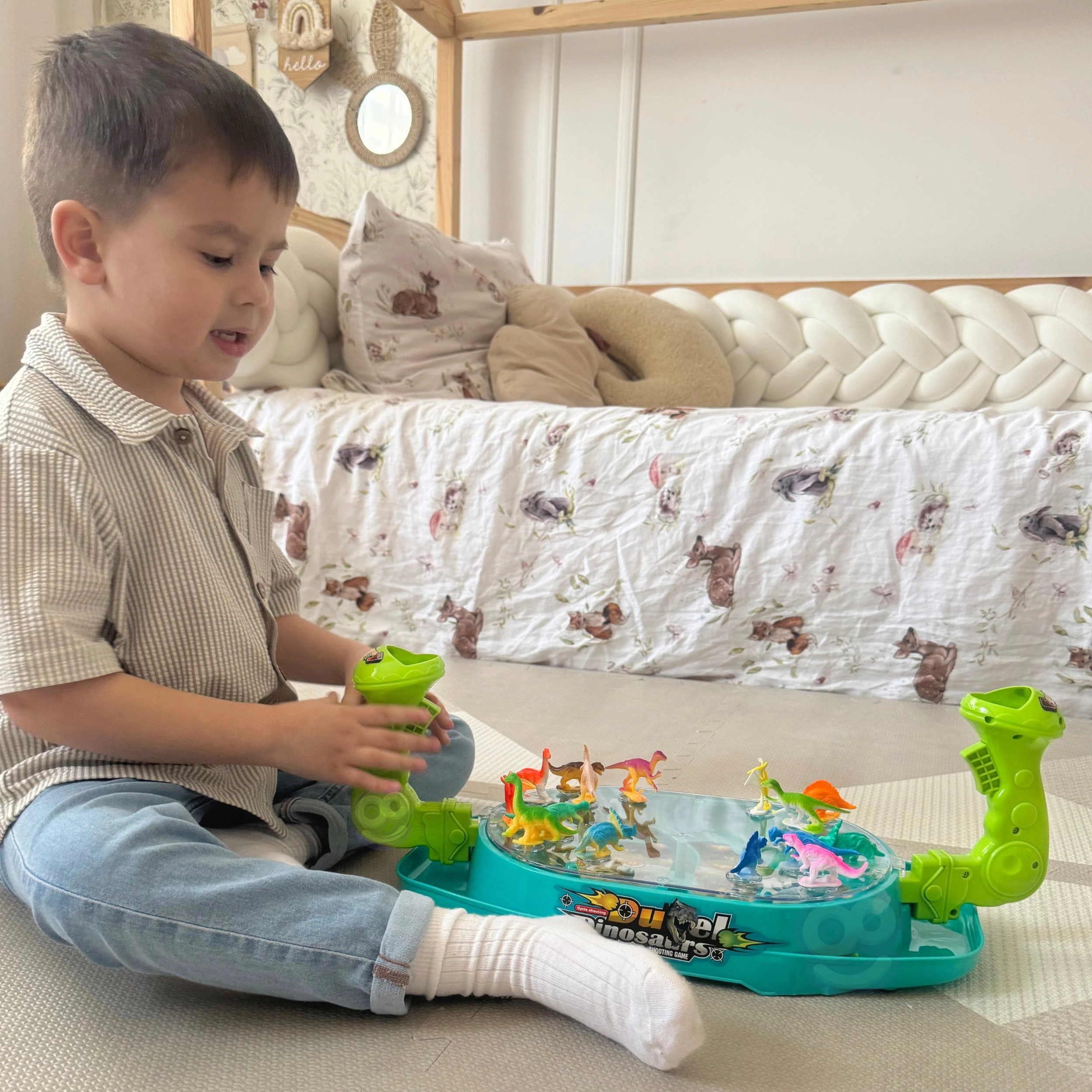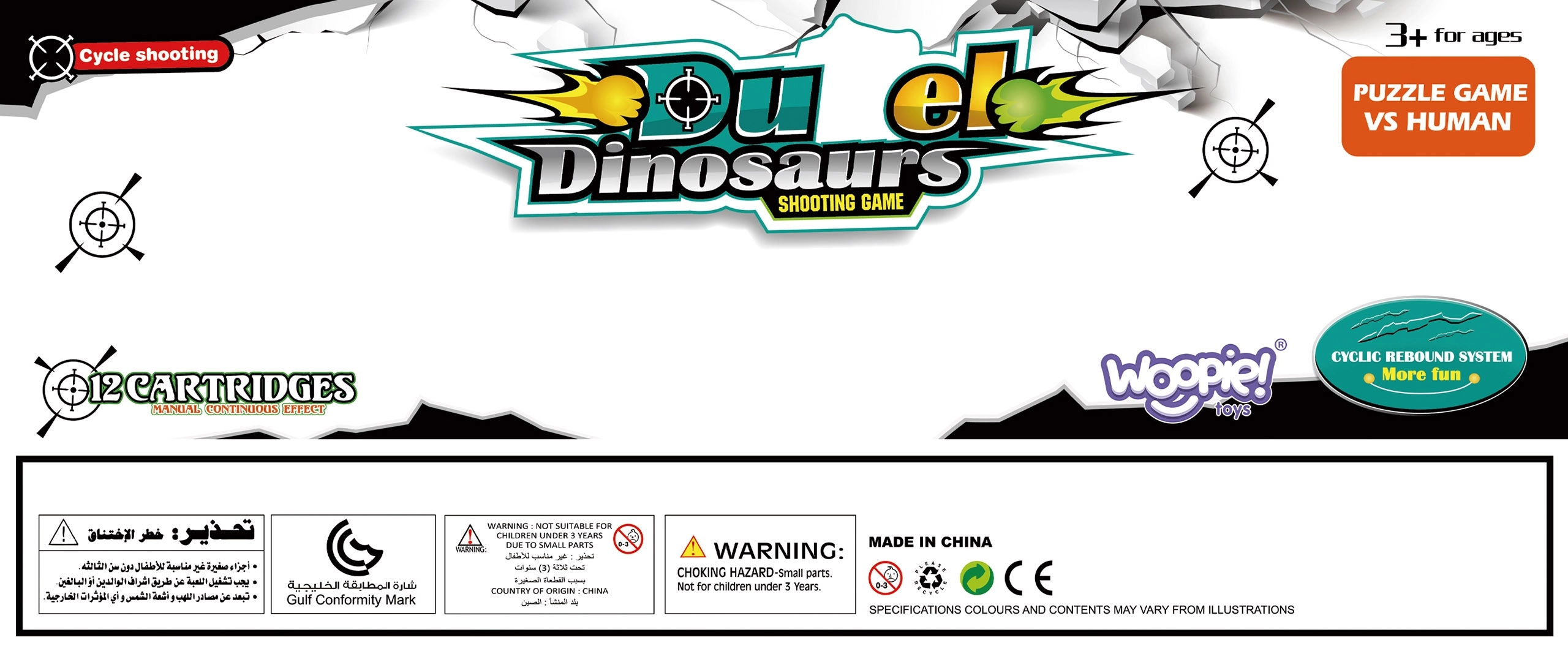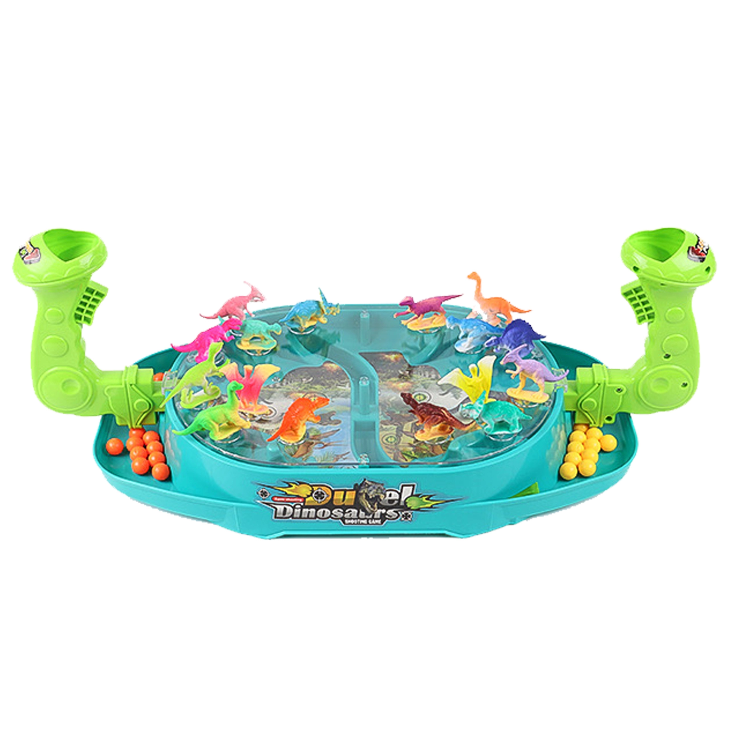 Woopie Битка на динозаврите е динамична настолна игра, която ще впечатли малките любители на праисторията и състезателните игри. Всеки играч управлява своя изстрелвач и с пянови топчета се стреми да уцели възможно най-много от динозаврите на противника. Благодарение на прозрачния капак всичко остава на мястото си, а играта е плавна, безопасна и максимално забавна.