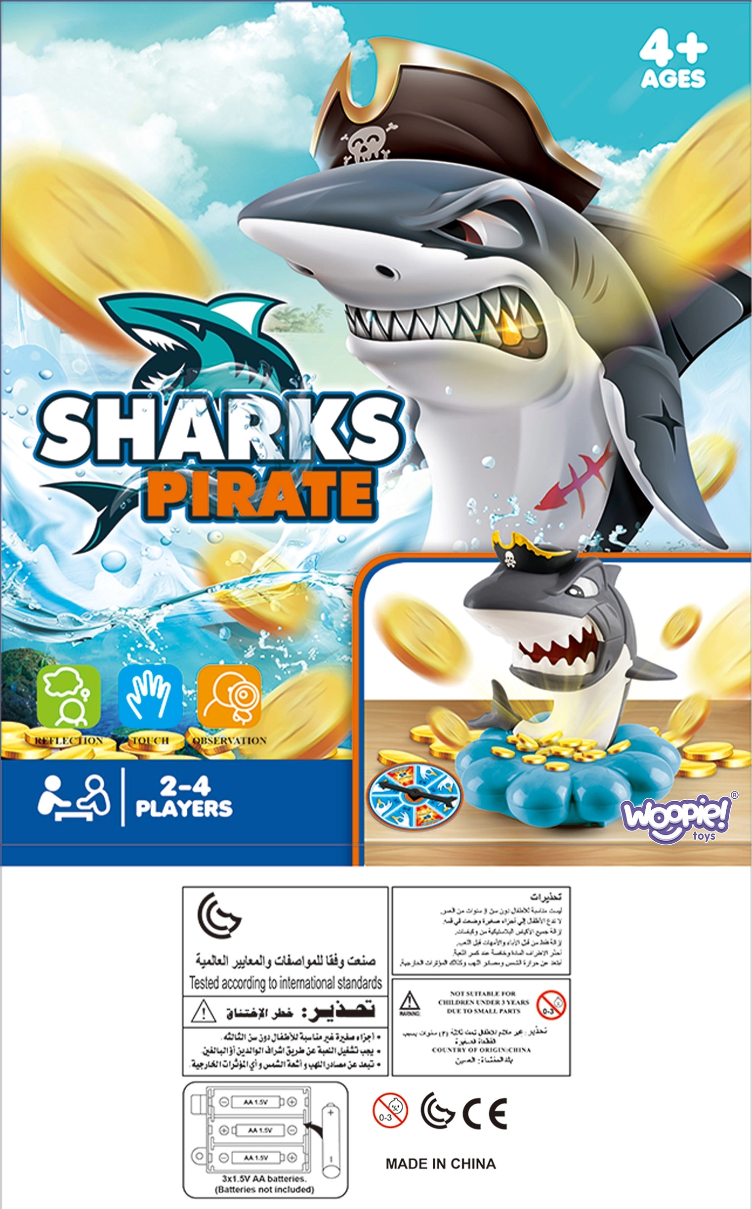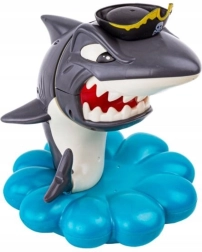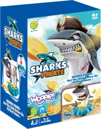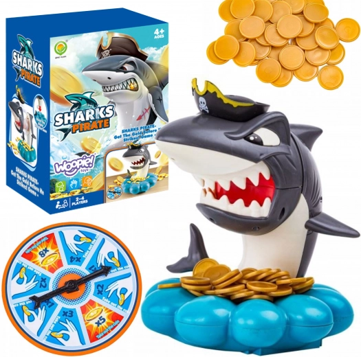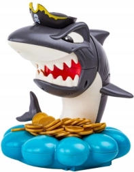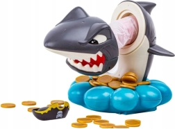 Пуснете златните монети в основата мида, завъртете колелото със стрелка и изтеглете точно толкова монети, колкото ви се паднат. Но внимавайте – акулата пази своя пиратски съкровищен запас и може да изскочи по всяко време. Който задейства акулата, губи. Простите правила, напрежението във всеки ход и завладяващите звукови ефекти я правят идеална семейна игра.