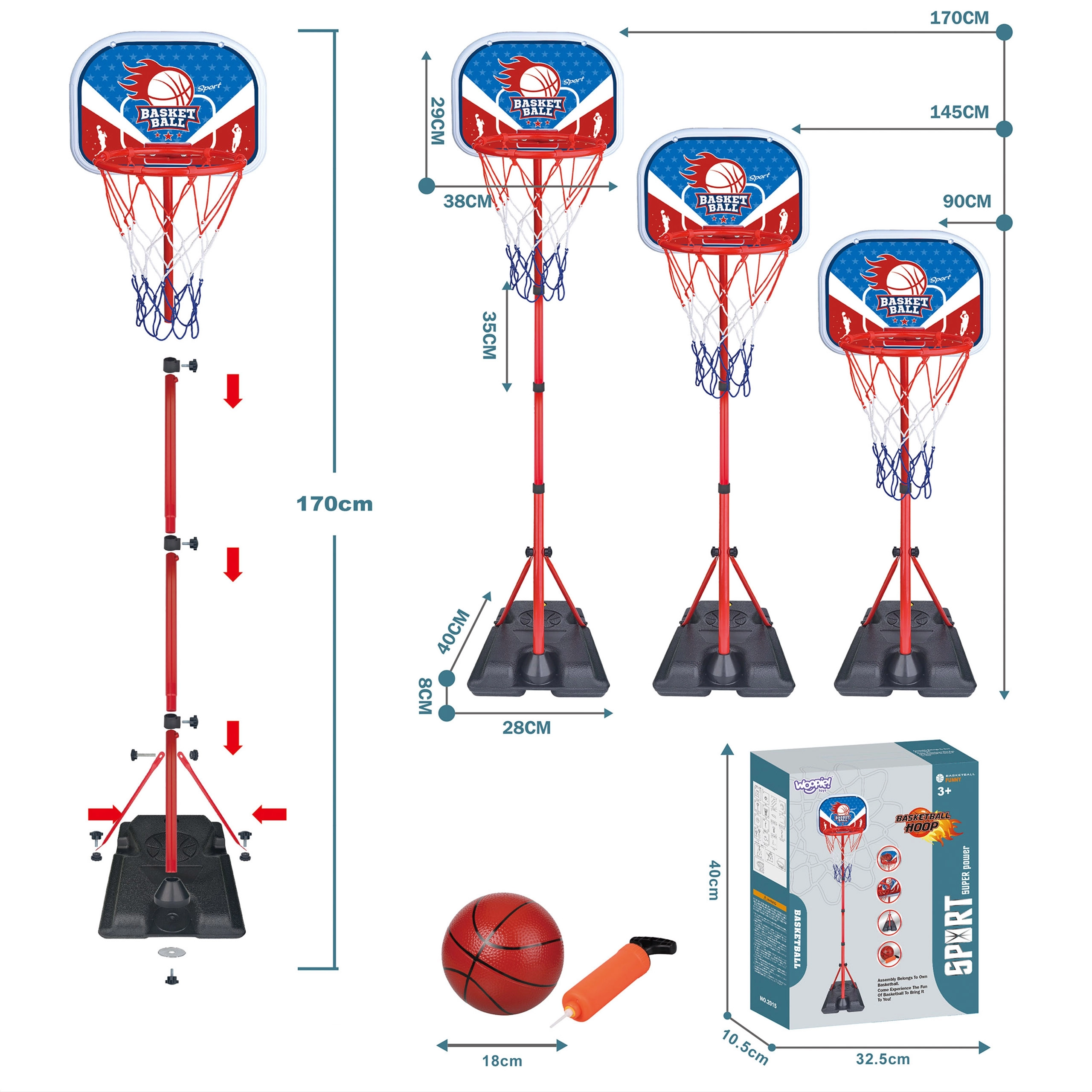 Кошът е изработен от издръжливи и безопасни материали, щадящи околната среда. Стабилната стойка осигурява увереност по време на игра, а включените баскетболна топка и помпа позволяват незабавно начало. Страхотен начин да мотивирате децата към спорт, да подобрят координацията и точността.