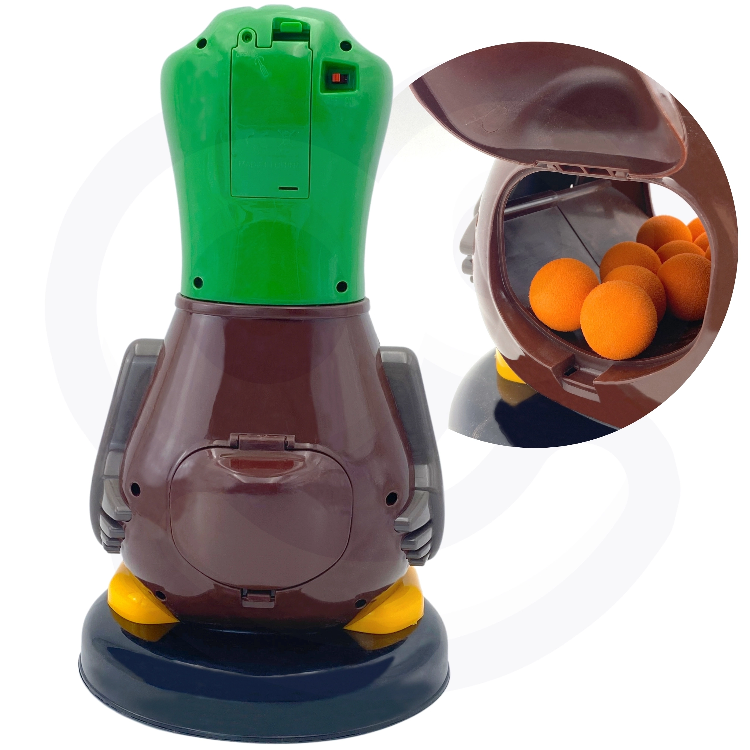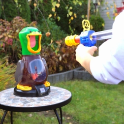 Благодарение на въздушно задвижвания пистолет не са нужни батерии в пистолета – достатъчно е да натиснете задната част и да изстреляте. Меките пенени топчета са щадящи и безопасни за игра вкъщи и навън, а патицата служи и като контейнер за удобно съхранение на топчетата.