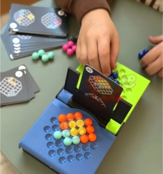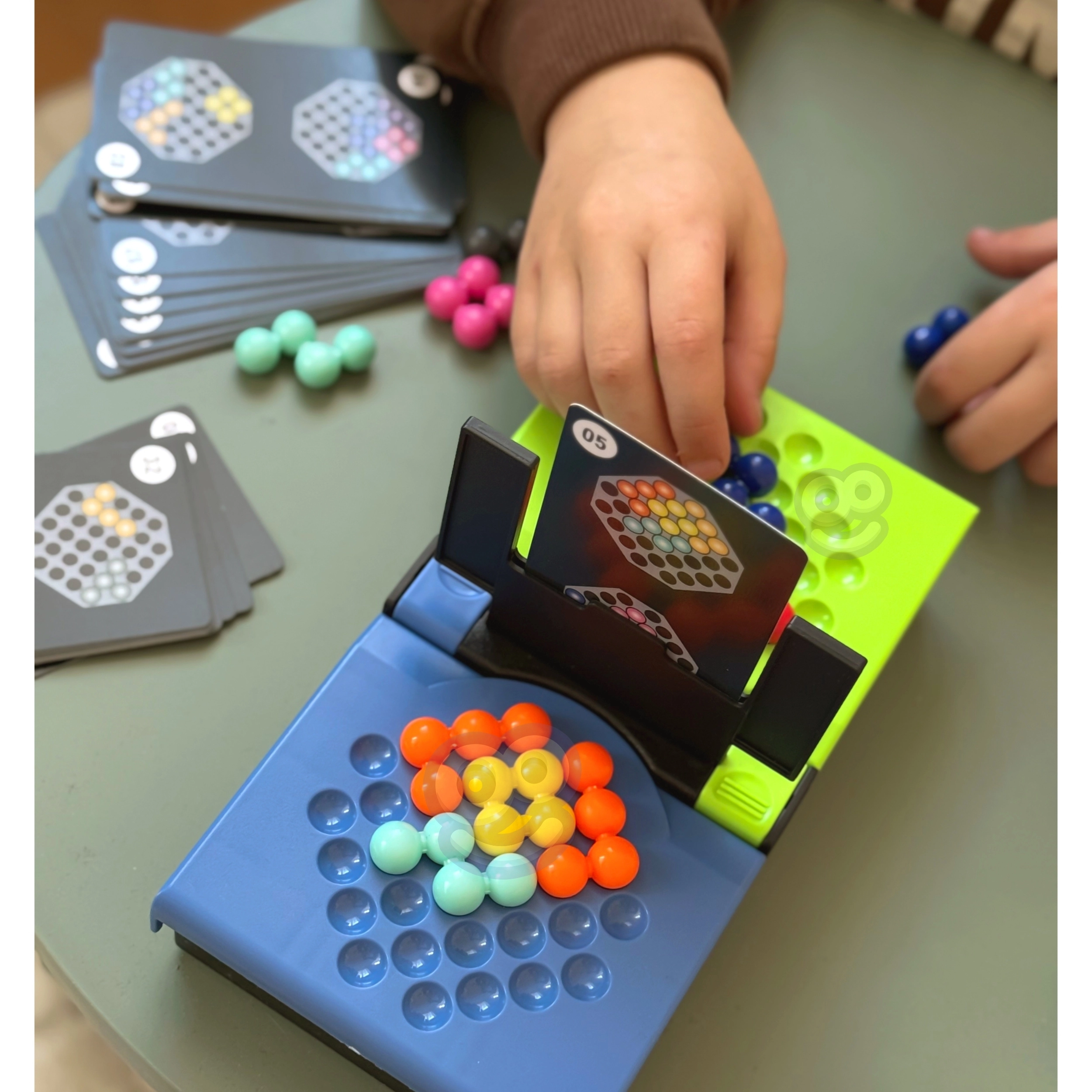 - От пула със своите цветни топчета се стремят възможно най-бързо да подредят шаблона, показан на картата пред тях