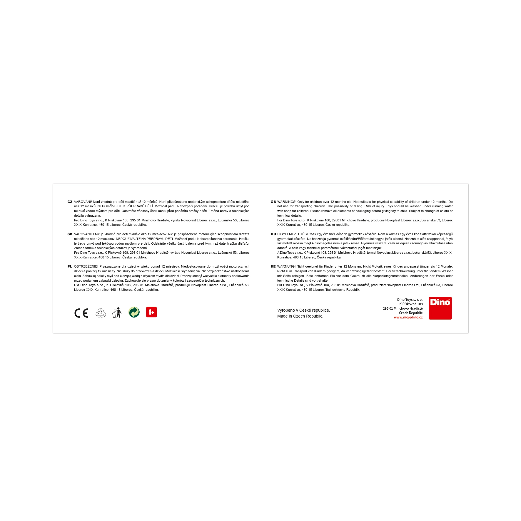 Играчката е изработена без използване на фталати и отговаря на високите стандарти за качество на чешките производители. Компанията Dino Toys е известна със сътрудничеството си с утвърдени художници и инженери, което гарантира качествена изработка на всеки продукт.