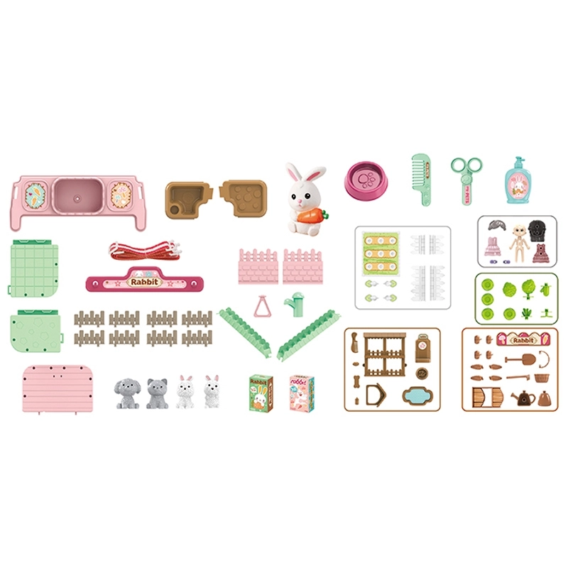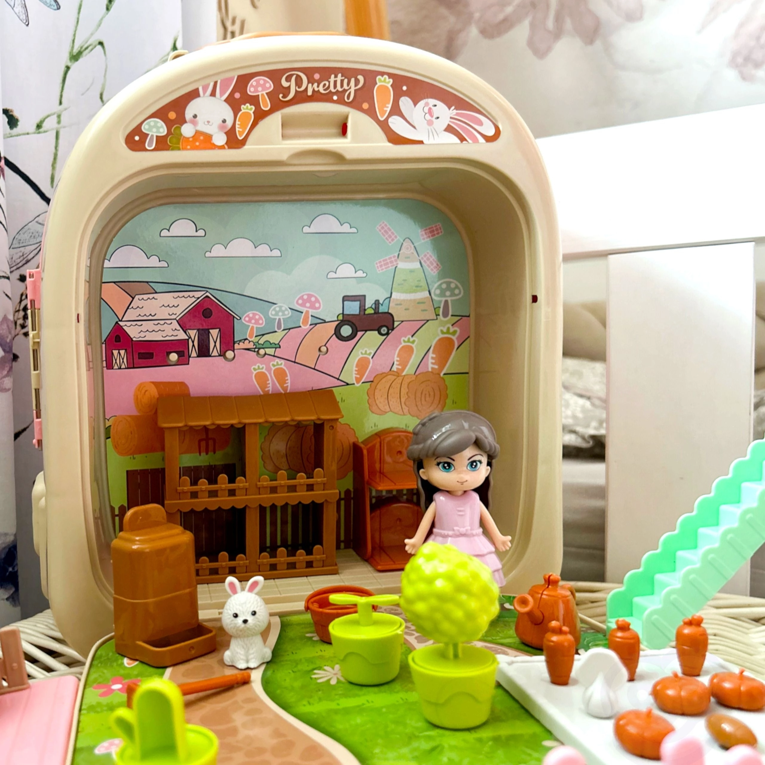 Децата могат да се превърнат във фермери с този очарователен комплект, който включва различни елементи за фермерство и грижа за зайчета.