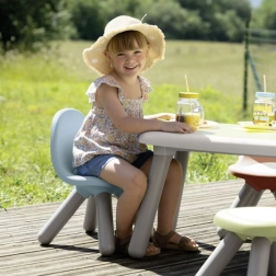 Столът има ергономично оформена облегалка за удобно седене и гладка повърхност, която се почиства лесно. Отлично се вписва в детска стая, занималня, детска градина, както и на тераса или в градина. В колекцията са налични и други цветове, така че можете да комбинирате свободно и да съчетаете мебелите с обстановката.