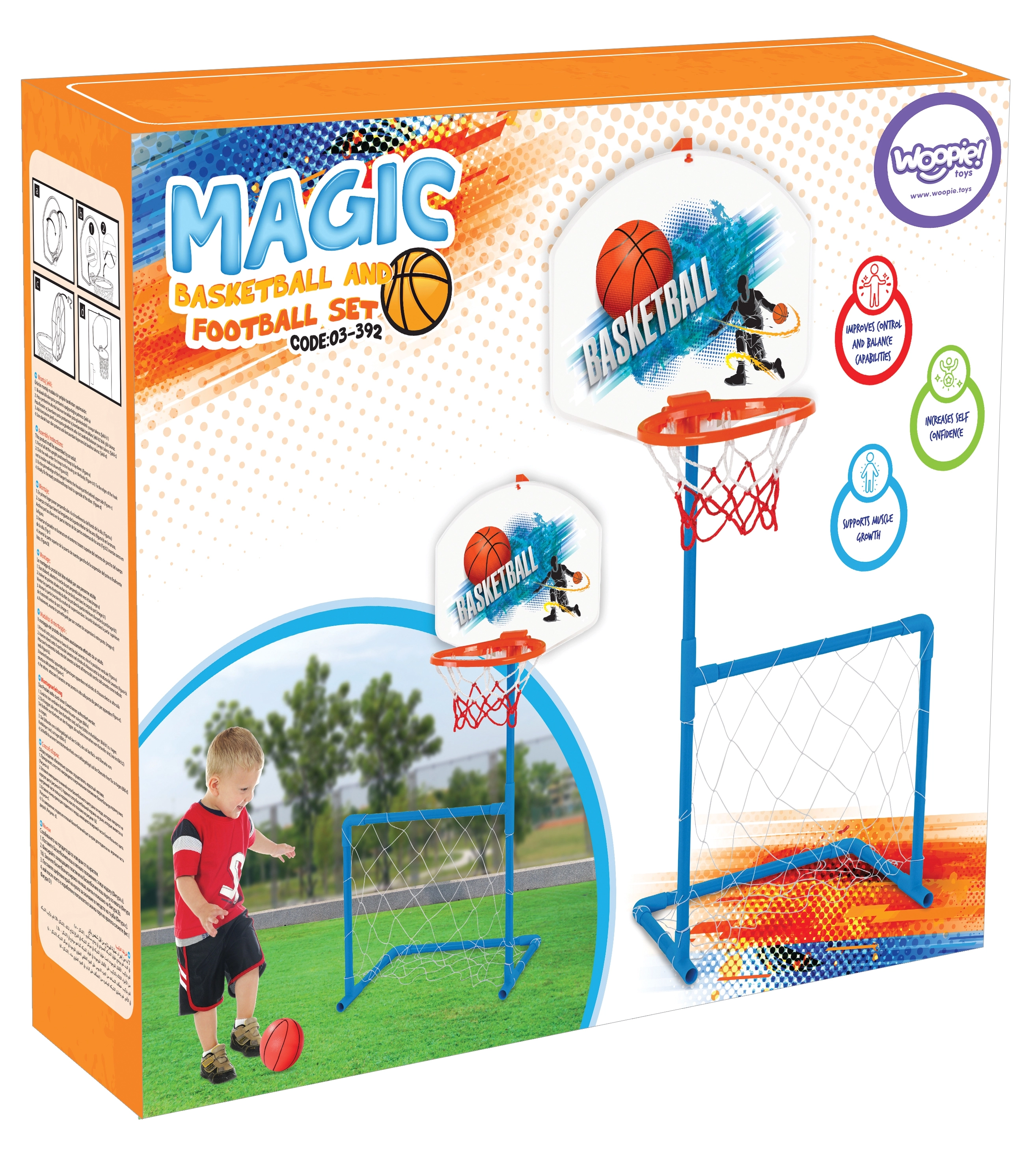 Този умен спортен комплект 2в1 носи на децата безкрайни възможности – стрелби към коша и футболни двубои с приятели. Кошът с височина приблизително 121 см е идеален за най-малките играчи, които трупат увереност в движението и координацията. Комплектът е изработен от щадящи за децата материали и е готов за игриви моменти както в дневната, така и в двора.