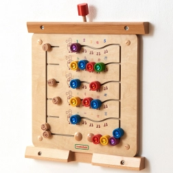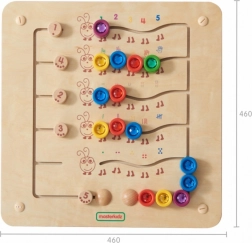 Вляво ще намерите плъзгащи превключватели за задаване на задачи – така децата могат да тренират броене нагоре и надолу до 5, да съотнасят количества и цветове и да упражняват логическо мислене. Освен развитието на фината моторика и координацията око–ръка, играчката помага и за концентрацията и визуалната перцепция.