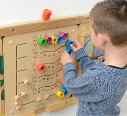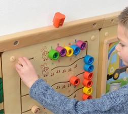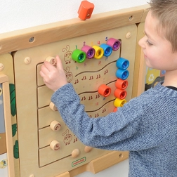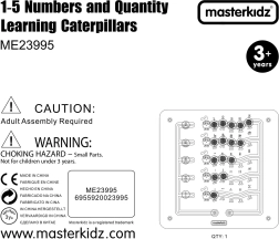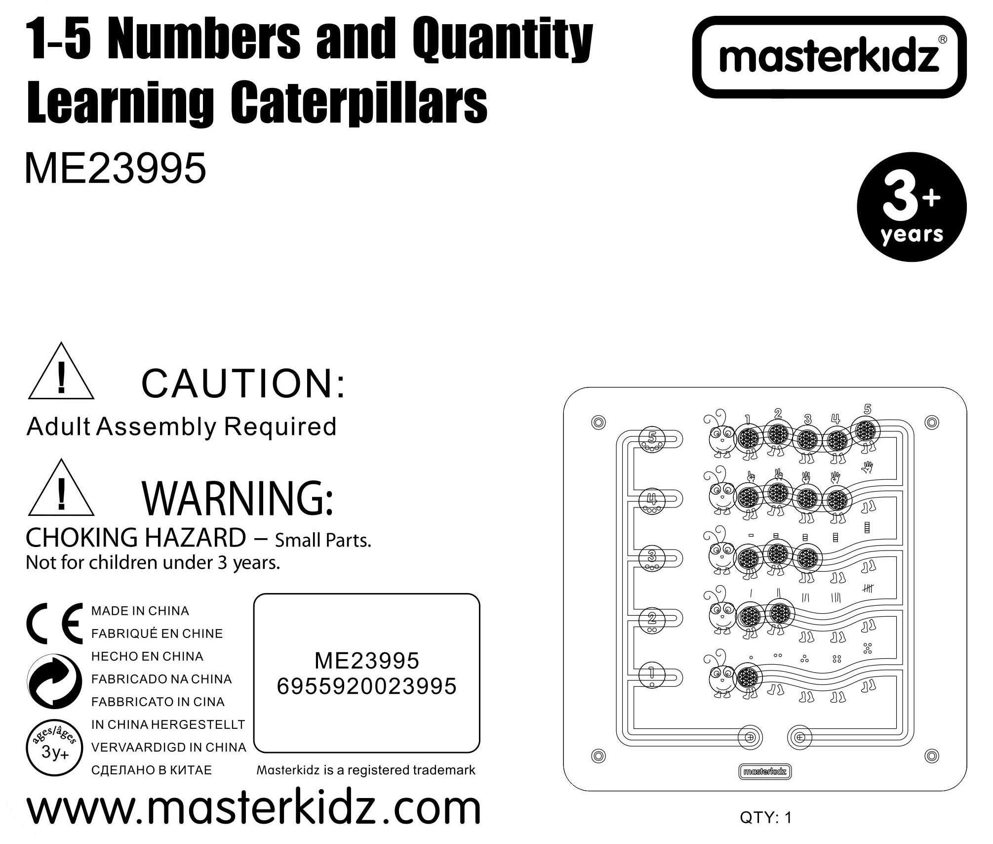 Този здрав дървен стенен панел MASTERKIDZ представя пет цветни гъсеници и 15 плъзгащи се „скъпоценни камъчета“ в пет цвята. Децата могат да ги движат по криволичещите пътища, но не могат да ги изваждат, което гарантира безопасна и дълготрайна игра у дома и в детските градини. Панелът показва пет начина за онагледяване на числата 1–5: цифри, пръсти, черти, блокове и точки.