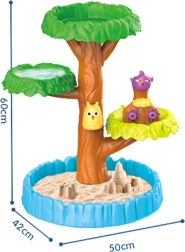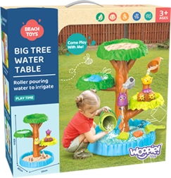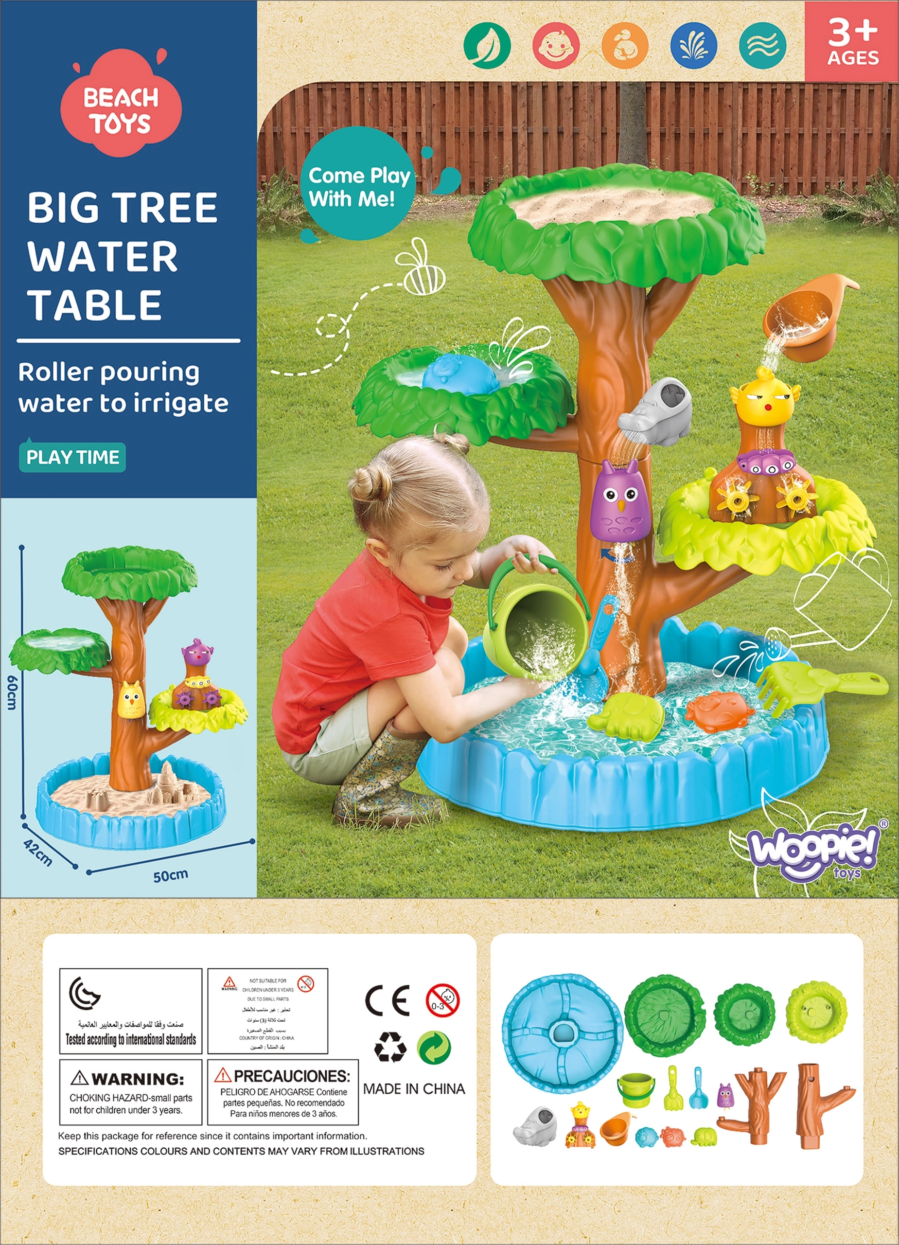 Водната маса във форма на дърво от марката Woopie е идеална за игра с вода и пясък. Този комплект съдържа всичко необходимо за безкрайно забавление — сгъваема маса, кофа, лейка/наливник, три формички, две лопатки, каничка. Детето може да полива различни животни с вода, което кара зъбчатите колела да се завъртят, добавяйки още повече радост към и без това чудесното забавление.