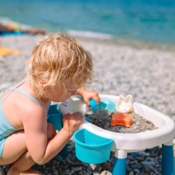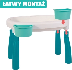 Два отделни сектора позволяват да се комбинират водни експерименти и пясъчни постройки в една компактна масичка – идеална за целогодишно забавление.
