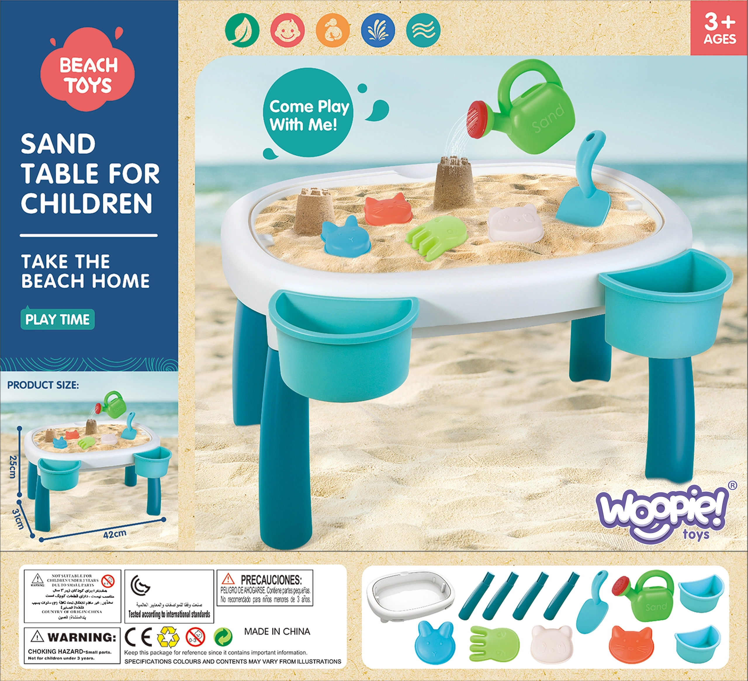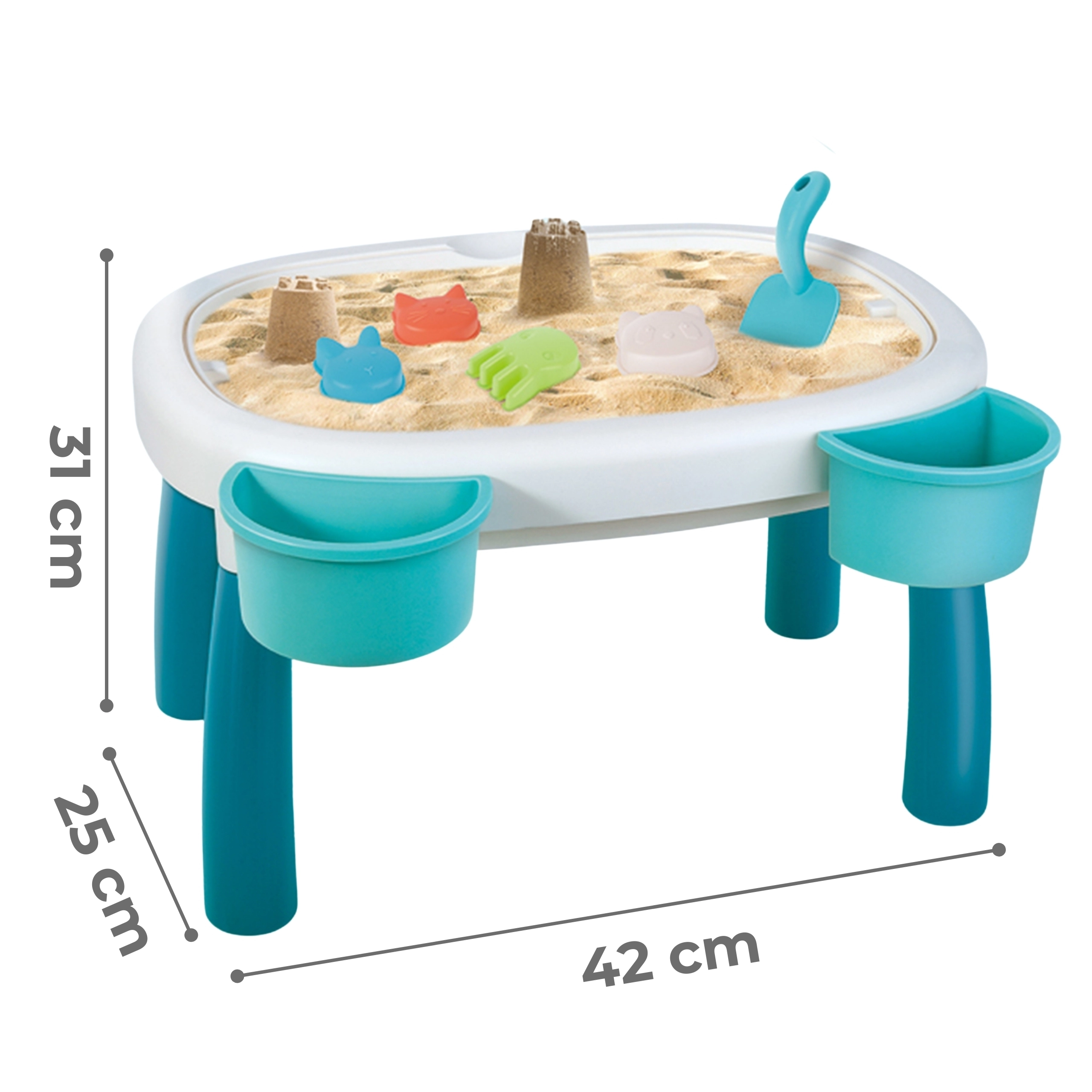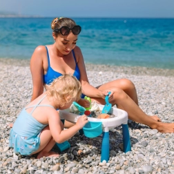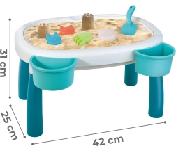 В комплекта са включени 7 практични аксесоара – лейка, лопатка, 4 формички (морска звезда, котка, панда, зайче) и два контейнера за масичката. Благодарение на тях децата могат да създават пясъчни постройки, да преливат вода и да развиват креативност и мануални умения.