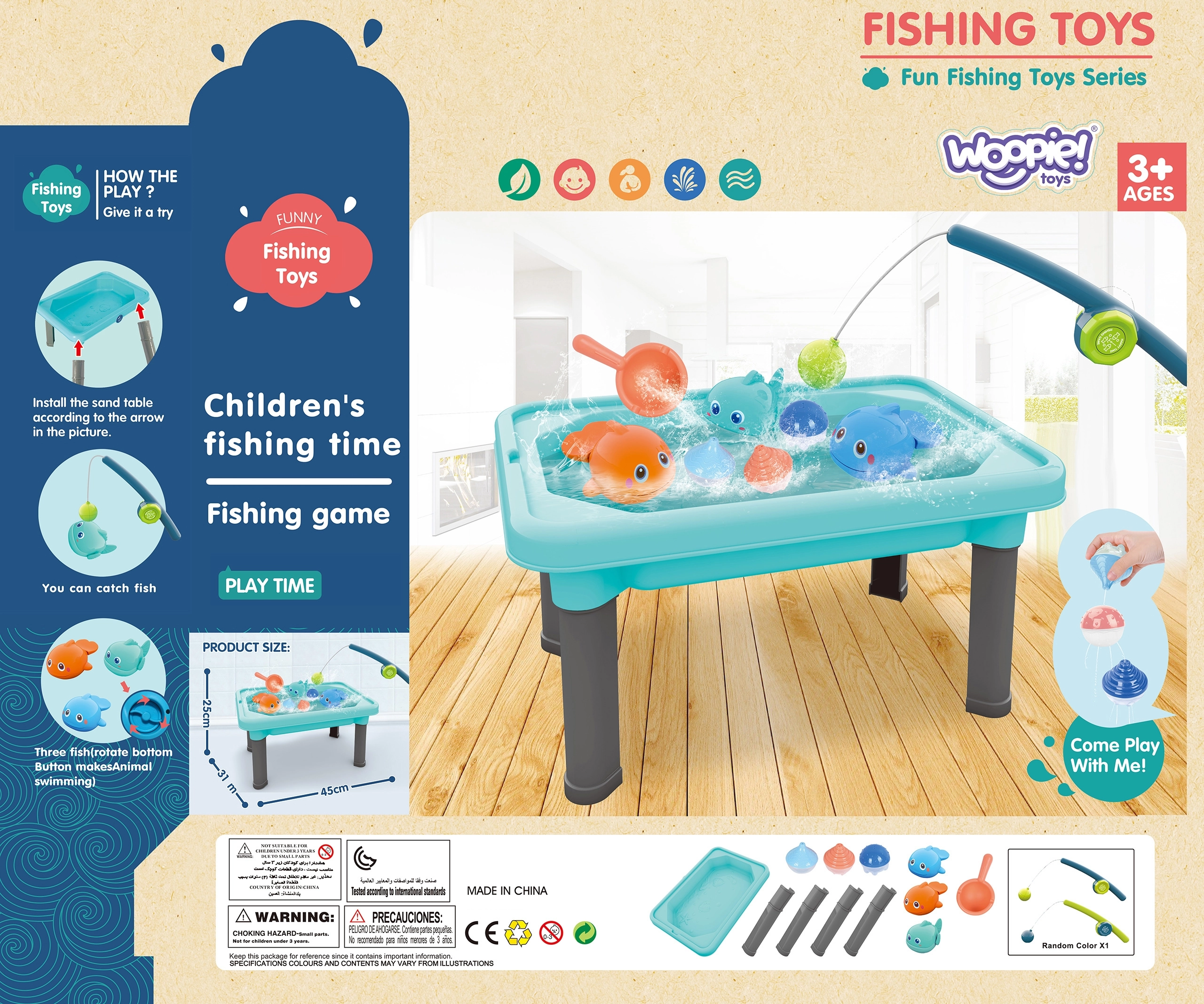 Комплектът съдържа общо 6 части, включително масичка, въдица, лъжичка за вода и три магнитни рибки. Рибките могат допълнително да се навиват, така че да плуват по водната повърхност, което вдъхновява децата да изследват.