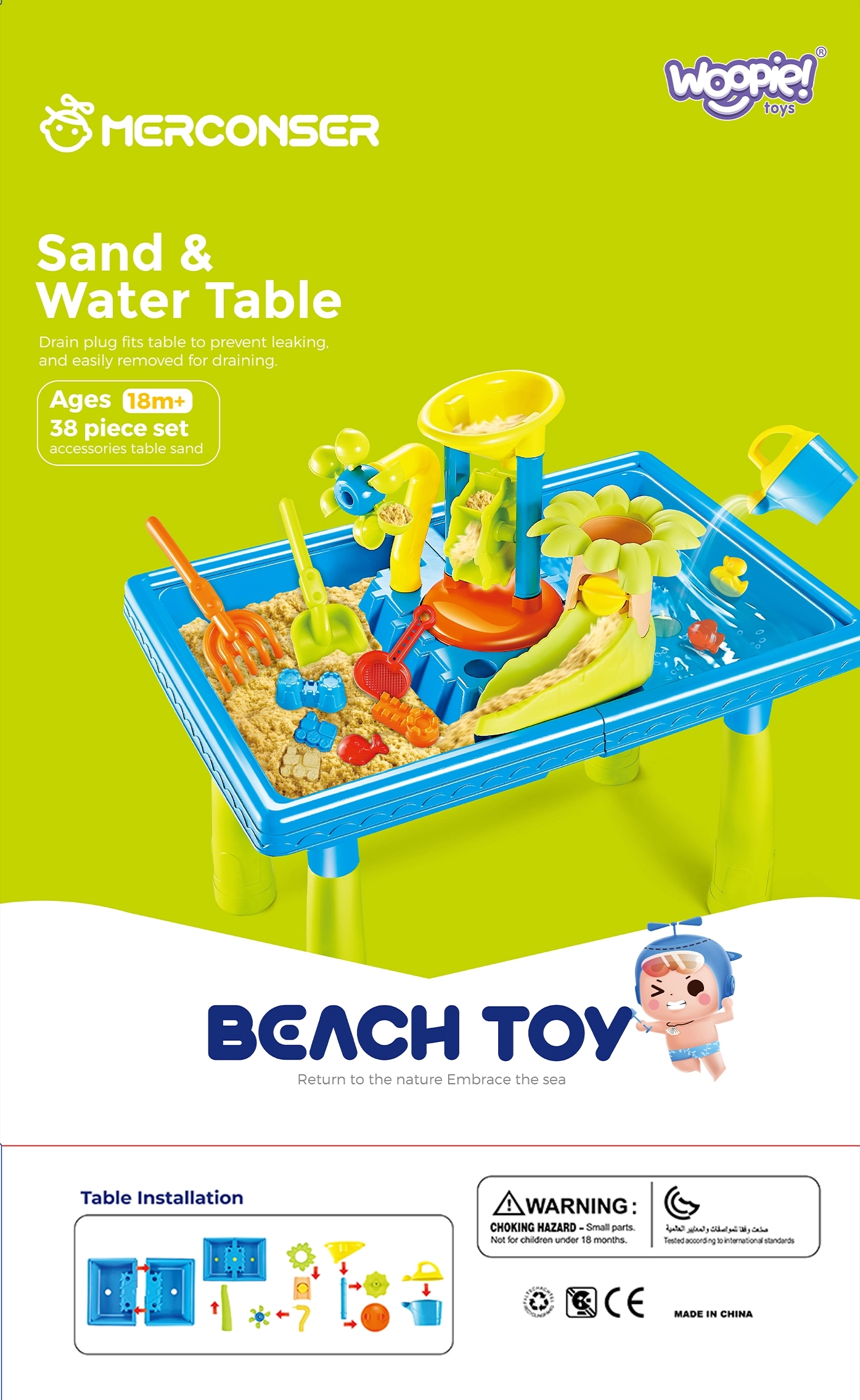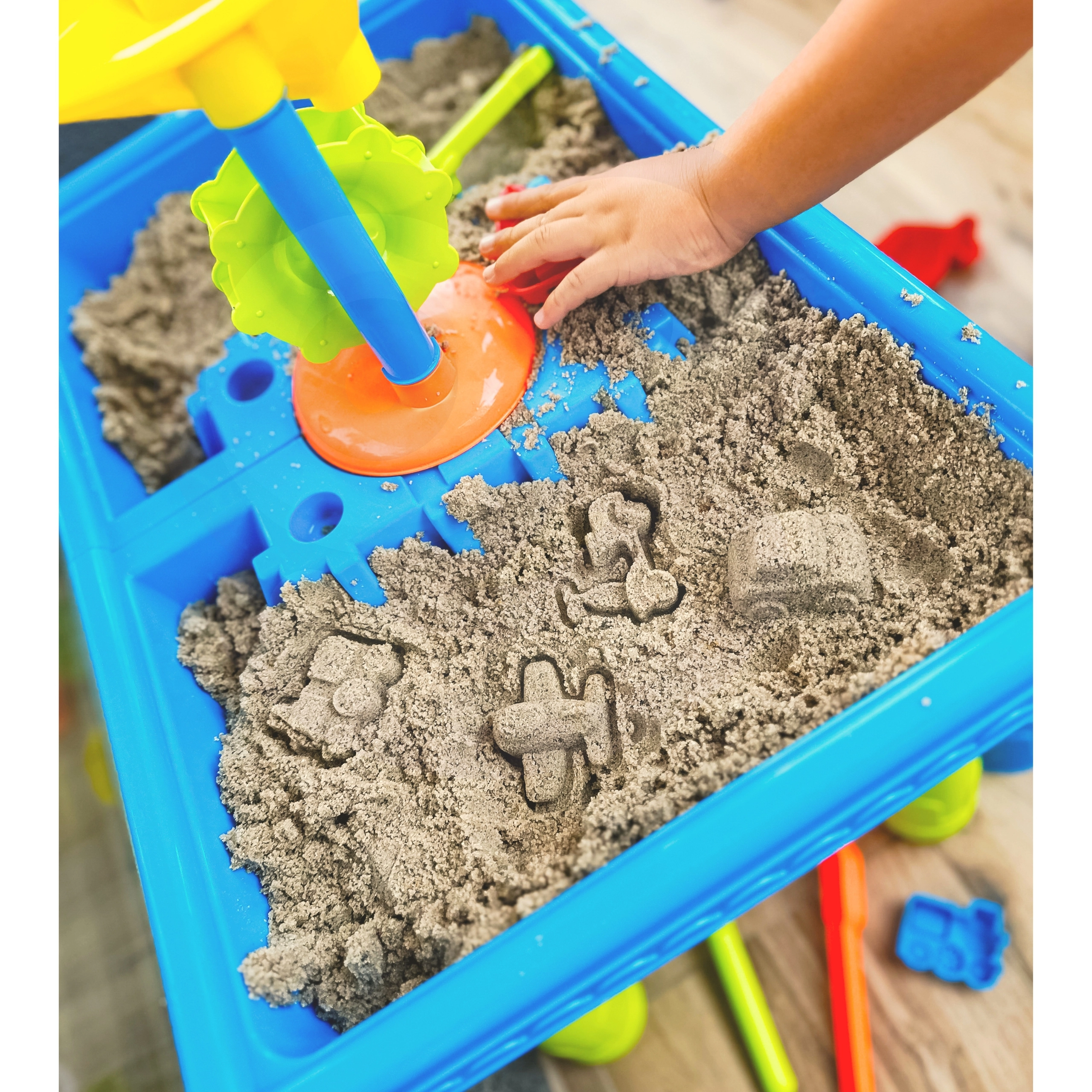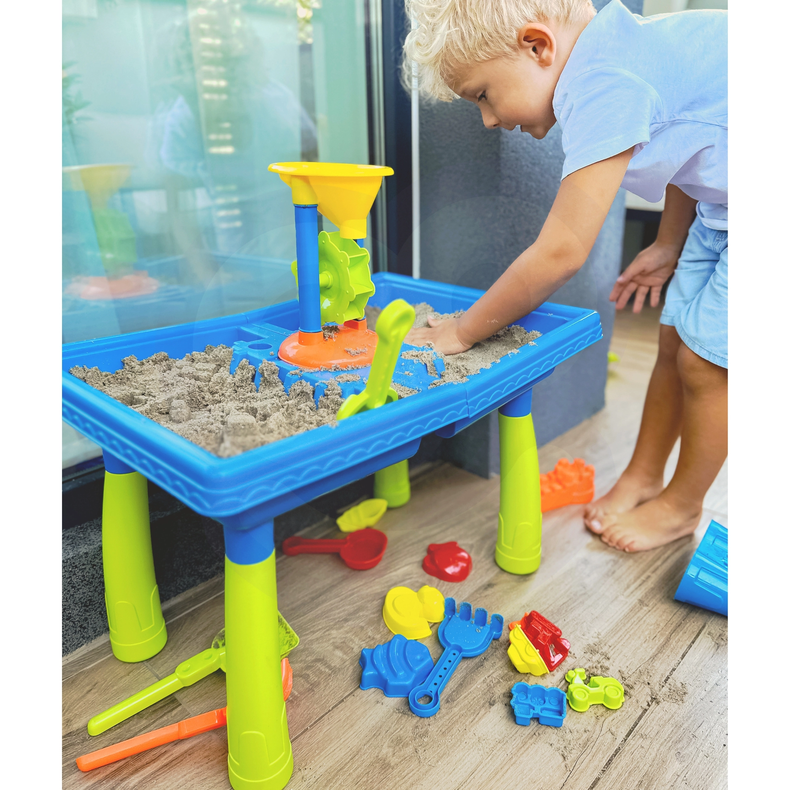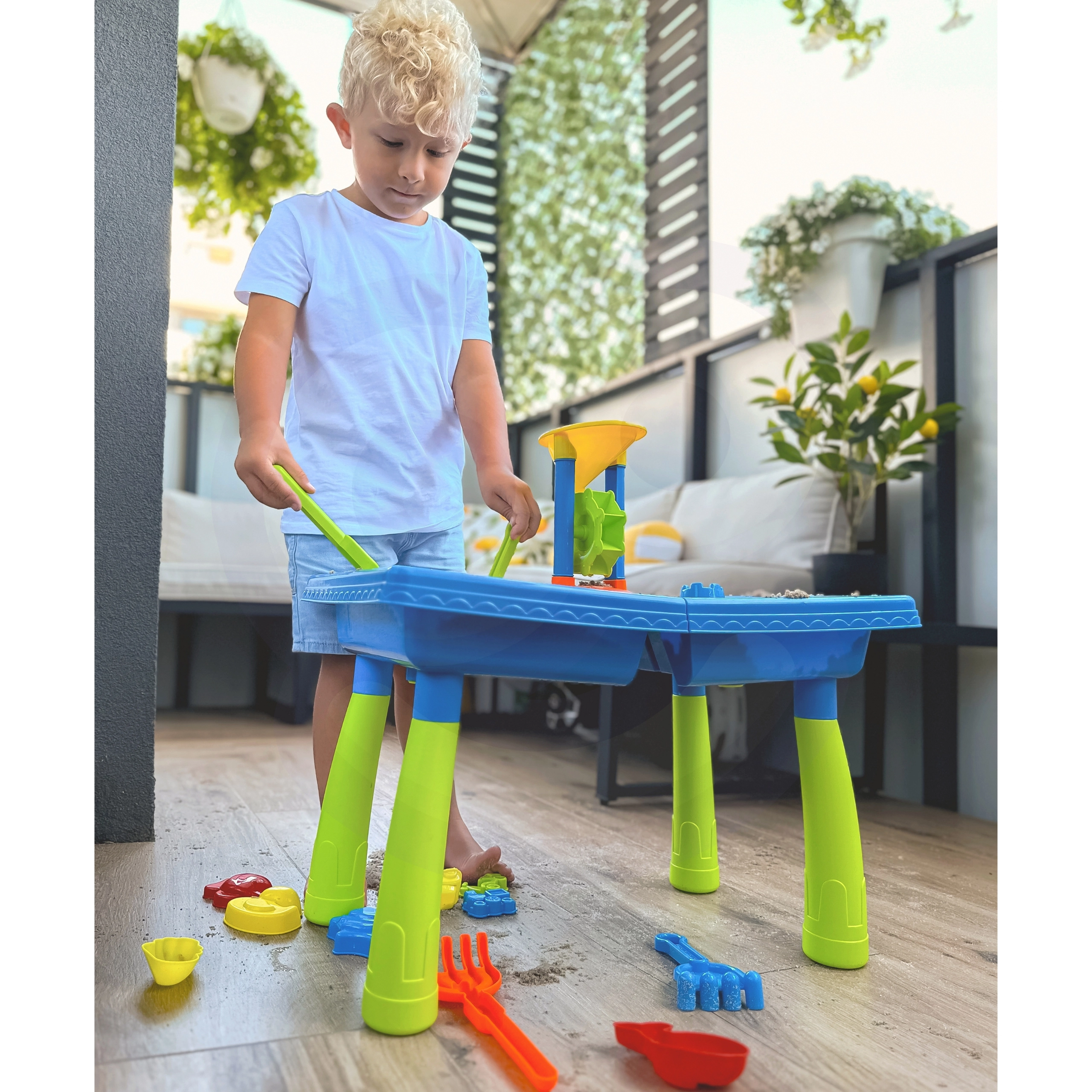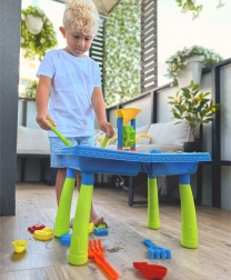 В комплекта ще намерите: маса за вода, лейка, 3 водни мелнички, 2 лопатки, сито и 12 формички.