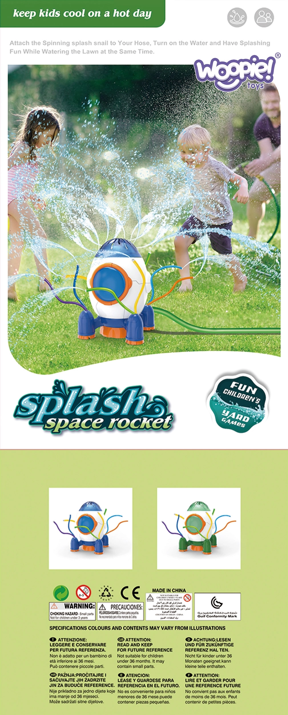 Ракетният разпръсквач WOOPIE превръща градината в лятна водна площадка. Благодарение на 360° разпръскване и еластични дюзи създава пъстри водни дъги, които децата обожават, като същевременно помага за напояване на тревата. Лекият дизайн, гладките ръбове и качествените материали осигуряват комфортна и безопасна игра.