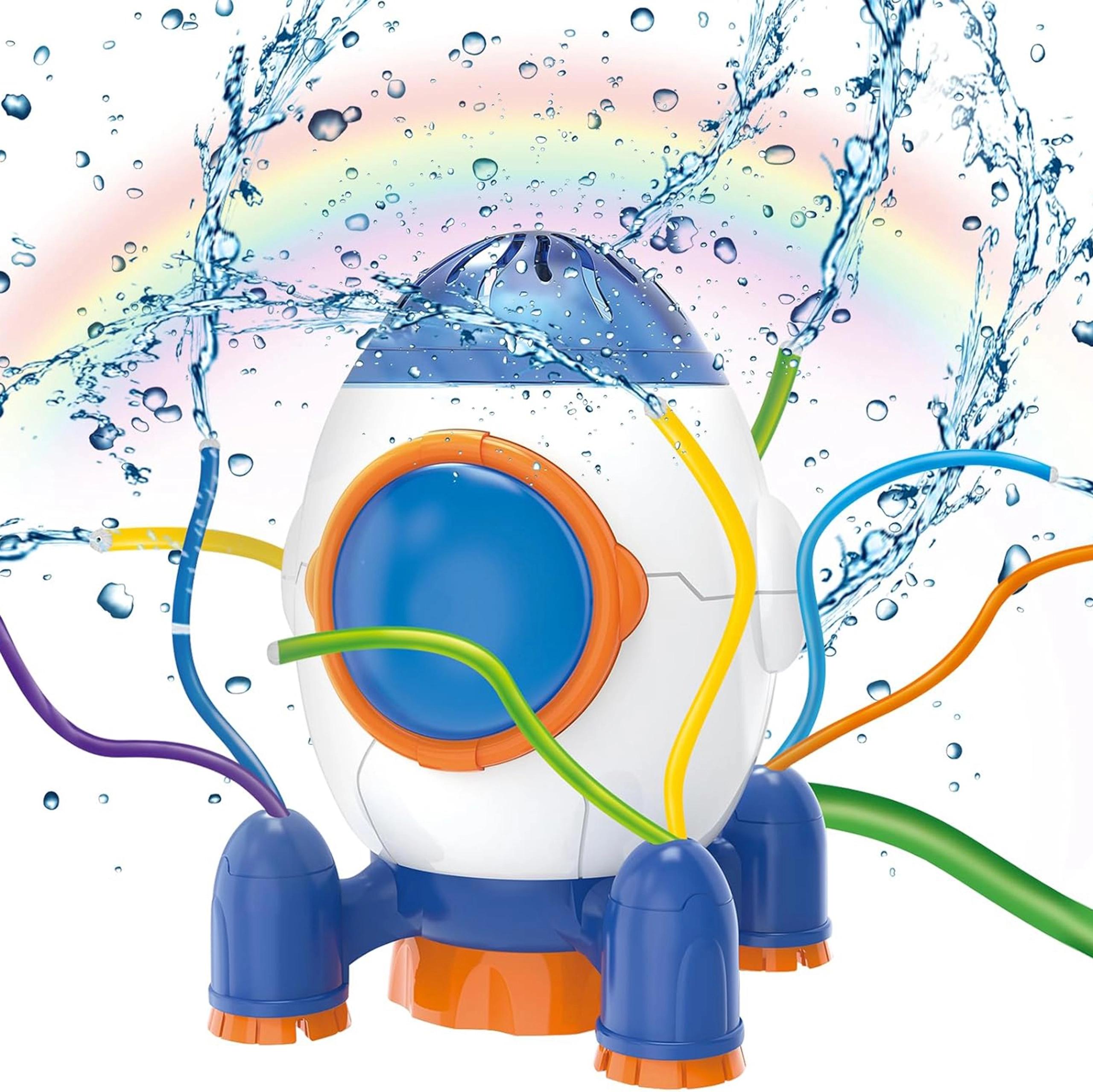 Цветните, огъваеми маркучета и въртящите се рамена разпръскват вода във всички посоки за максимален обхват и ефектни водни дъги.