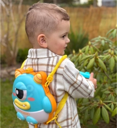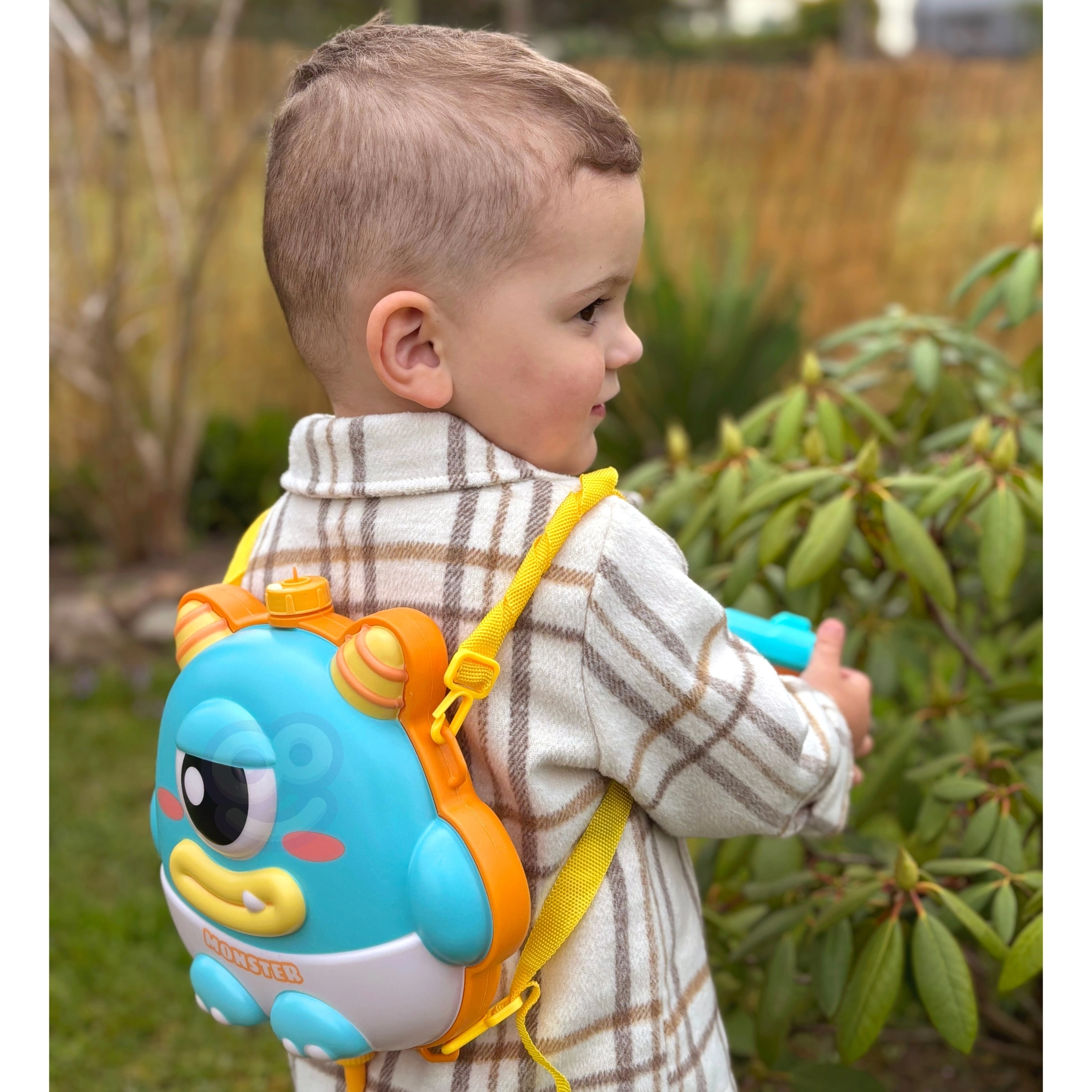 Сладката раничка с мотив на чудовище и лекия пистолет, свързани с маркуч, образуват идеален сет за горещи дни в двора, край водата или на почивка. Големият резервоар 2,1 литра удължава играта, докато регулируемата дюза позволява превключване между разпръсквач и силна струя. Благодарение на презареждащата се батерия не е нужно помпане – просто заредете, прицелете и пръскайте.