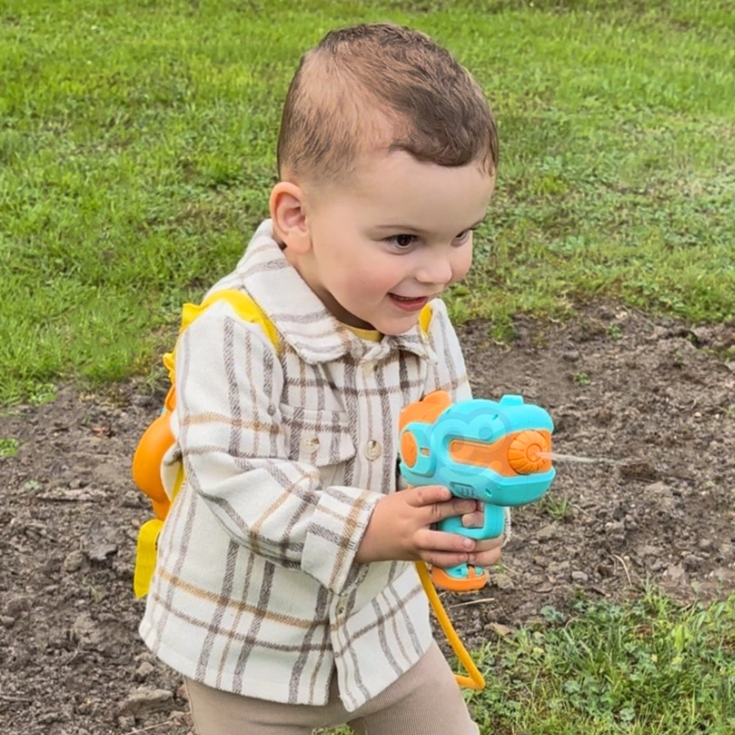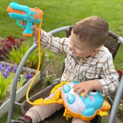 Безопасният и забавен дизайн е подходящ за деца от 3 години. Регулируемите презрамки на раничката се адаптират към различни телосложения, а леката конструкция улеснява носенето и по-дългата игра. Обсегът 5–8 м гарантира динамични водни дуели и много смях.