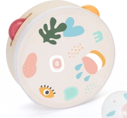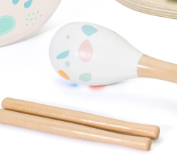 Комплектът включва пет инструмента: чинели, маракаси, барабан и две палки – идеален за откриване на музиката.